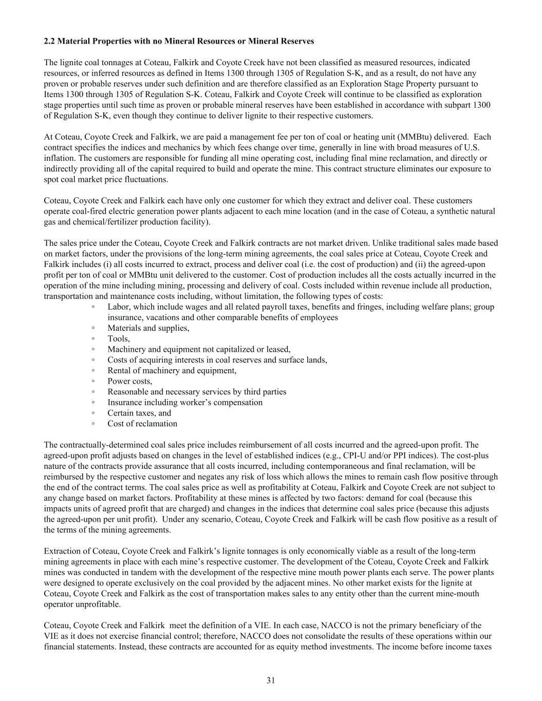 2.2 Material Properties with no Mineral Resources or Mineral Reserves The lignite coal tonnages at Coteau, Falkirk and Coyote Creek have not been classified as measured resources, indicated resources, or inferred resources as defined in Items 1300 through 1305 of Regulation S-K, and as a result, do not have any proven or probable reserves under such definition and are therefore classified as an Exploration Stage Property pursuant to Items 1300 through 1305 of Regulation S-K. Coteau, Falkirk and Coyote Creek will continue to be classified as exploration stage properties until such time as proven or probable mineral reserves have been established in accordance with subpart 1300 of Regulation S-K, even though they continue to deliver lignite to their respective customers. At Coteau, Coyote Creek and Falkirk, we are paid a management fee per ton of coal or heating unit (MMBtu) delivered. Each contract specifies the indices and mechanics by which fees change over time, generally in line with broad measures of U.S. inflation. The customers are responsible for funding all mine operating cost, including final mine reclamation, and directly or indirectly providing all of the capital required to build and operate the mine. This contract structure eliminates our exposure to spot coal market price fluctuations. Coteau, Coyote Creek and Falkirk each have only one customer for which they extract and deliver coal. These customers operate coal-fired electric generation power plants adjacent to each mine location (and in the case of Coteau, a synthetic natural gas and chemical/fertilizer production facility). The sales price under the Coteau, Coyote Creek and Falkirk contracts are not market driven. Unlike traditional sales made based on market factors, under the provisions of the long-term mining agreements, the coal sales price at Coteau, Coyote Creek and Falkirk includes (i) all costs incurred to extract, process and deliver coal (i.e. the cost of production) and (ii) the agreed-upon profit per ton of coal or MMBtu unit delivered to the customer. Cost of production includes all the costs actually incurred in the operation of the mine including mining, processing and delivery of coal. Costs included within revenue include all production, transportation and maintenance costs including, without limitation, the following types of costs: ◦ Labor, which include wages and all related payroll taxes, benefits and fringes, including welfare plans; group insurance, vacations and other comparable benefits of employees ◦ Materials and supplies, ◦ Tools, ◦ Machinery and equipment not capitalized or leased, ◦ Costs of acquiring interests in coal reserves and surface lands, ◦ Rental of machinery and equipment, ◦ Power costs, ◦ Reasonable and necessary services by third parties ◦ Insurance including worker’s compensation ◦ Certain taxes, and ◦ Cost of reclamation The contractually-determined coal sales price includes reimbursement of all costs incurred and the agreed-upon profit. The agreed-upon profit adjusts based on changes in the level of established indices (e.g., CPI-U and/or PPI indices). The cost-plus nature of the contracts provide assurance that all costs incurred, including contemporaneous and final reclamation, will be reimbursed by the respective customer and negates any risk of loss which allows the mines to remain cash flow positive through the end of the contract terms. The coal sales price as well as profitability at Coteau, Falkirk and Coyote Creek are not subject to any change based on market factors. Profitability at these mines is affected by two factors: demand for coal (because this impacts units of agreed profit that are charged) and changes in the indices that determine coal sales price (because this adjusts the agreed-upon per unit profit). Under any scenario, Coteau, Coyote Creek and Falkirk will be cash flow positive as a result of the terms of the mining agreements. Extraction of Coteau, Coyote Creek and Falkirk’s lignite tonnages is only economically viable as a result of the long-term mining agreements in place with each mine’s respective customer. The development of the Coteau, Coyote Creek and Falkirk mines was conducted in tandem with the development of the respective mine mouth power plants each serve. The power plants were designed to operate exclusively on the coal provided by the adjacent mines. No other market exists for the lignite at Coteau, Coyote Creek and Falkirk as the cost of transportation makes sales to any entity other than the current mine-mouth operator unprofitable. Coteau, Coyote Creek and Falkirk meet the definition of a VIE. In each case, NACCO is not the primary beneficiary of the VIE as it does not exercise financial control; therefore, NACCO does not consolidate the results of these operations within our financial statements. Instead, these contracts are accounted for as equity method investments. The income before income taxes 31