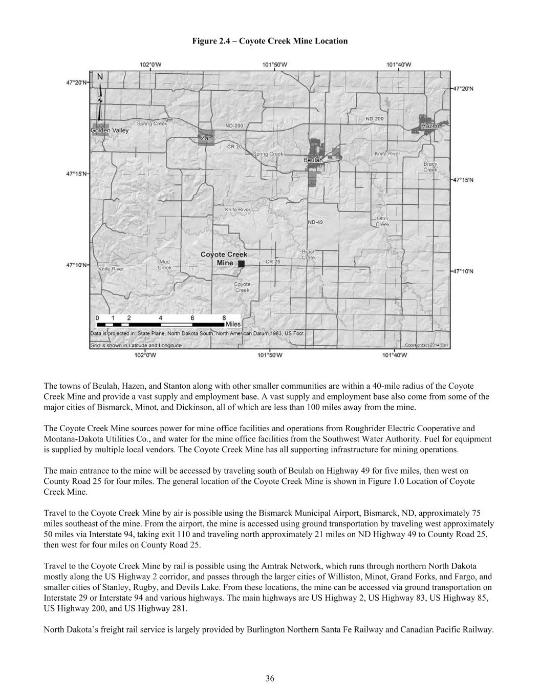 Figure 2.4 – Coyote Creek Mine Location The towns of Beulah, Hazen, and Stanton along with other smaller communities are within a 40-mile radius of the Coyote Creek Mine and provide a vast supply and employment base. A vast supply and employment base also come from some of the major cities of Bismarck, Minot, and Dickinson, all of which are less than 100 miles away from the mine. The Coyote Creek Mine sources power for mine office facilities and operations from Roughrider Electric Cooperative and Montana-Dakota Utilities Co., and water for the mine office facilities from the Southwest Water Authority. Fuel for equipment is supplied by multiple local vendors. The Coyote Creek Mine has all supporting infrastructure for mining operations. The main entrance to the mine will be accessed by traveling south of Beulah on Highway 49 for five miles, then west on County Road 25 for four miles. The general location of the Coyote Creek Mine is shown in Figure 1.0 Location of Coyote Creek Mine. Travel to the Coyote Creek Mine by air is possible using the Bismarck Municipal Airport, Bismarck, ND, approximately 75 miles southeast of the mine. From the airport, the mine is accessed using ground transportation by traveling west approximately 50 miles via Interstate 94, taking exit 110 and traveling north approximately 21 miles on ND Highway 49 to County Road 25, then west for four miles on County Road 25. Travel to the Coyote Creek Mine by rail is possible using the Amtrak Network, which runs through northern North Dakota mostly along the US Highway 2 corridor, and passes through the larger cities of Williston, Minot, Grand Forks, and Fargo, and smaller cities of Stanley, Rugby, and Devils Lake. From these locations, the mine can be accessed via ground transportation on Interstate 29 or Interstate 94 and various highways. The main highways are US Highway 2, US Highway 83, US Highway 85, US Highway 200, and US Highway 281. North Dakota’s freight rail service is largely provided by Burlington Northern Santa Fe Railway and Canadian Pacific Railway. 36
