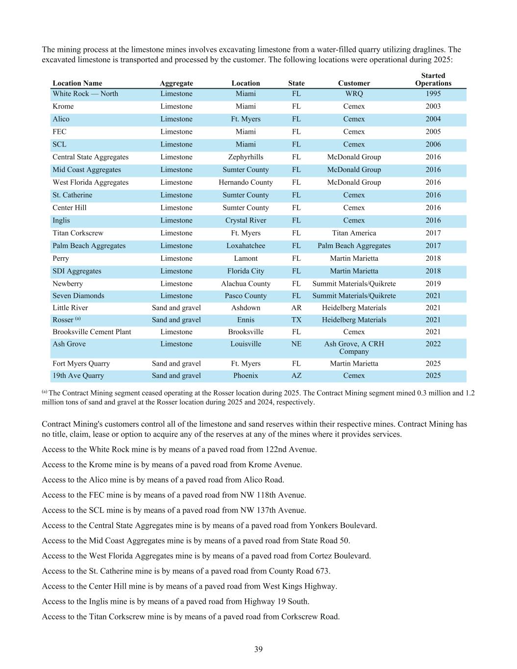 The mining process at the limestone mines involves excavating limestone from a water-filled quarry utilizing draglines. The excavated limestone is transported and processed by the customer. The following locations were operational during 2025: Location Name Aggregate Location State Customer Year NACCO Started Operations White Rock — North Limestone Miami FL WRQ 1995 Krome Limestone Miami FL Cemex 2003 Alico Limestone Ft. Myers FL Cemex 2004 FEC Limestone Miami FL Cemex 2005 SCL Limestone Miami FL Cemex 2006 Central State Aggregates Limestone Zephyrhills FL McDonald Group 2016 Mid Coast Aggregates Limestone Sumter County FL McDonald Group 2016 West Florida Aggregates Limestone Hernando County FL McDonald Group 2016 St. Catherine Limestone Sumter County FL Cemex 2016 Center Hill Limestone Sumter County FL Cemex 2016 Inglis Limestone Crystal River FL Cemex 2016 Titan Corkscrew Limestone Ft. Myers FL Titan America 2017 Palm Beach Aggregates Limestone Loxahatchee FL Palm Beach Aggregates 2017 Perry Limestone Lamont FL Martin Marietta 2018 SDI Aggregates Limestone Florida City FL Martin Marietta 2018 Newberry Limestone Alachua County FL Summit Materials/Quikrete 2019 Seven Diamonds Limestone Pasco County FL Summit Materials/Quikrete 2021 Little River Sand and gravel Ashdown AR Heidelberg Materials 2021 Rosser (a) Sand and gravel Ennis TX Heidelberg Materials 2021 Brooksville Cement Plant Limestone Brooksville FL Cemex 2021 Ash Grove Limestone Louisville NE Ash Grove, A CRH Company 2022 Fort Myers Quarry Sand and gravel Ft. Myers FL Martin Marietta 2025 19th Ave Quarry Sand and gravel Phoenix AZ Cemex 2025 (a) The Contract Mining segment ceased operating at the Rosser location during 2025. The Contract Mining segment mined 0.3 million and 1.2 million tons of sand and gravel at the Rosser location during 2025 and 2024, respectively. Contract Mining's customers control all of the limestone and sand reserves within their respective mines. Contract Mining has no title, claim, lease or option to acquire any of the reserves at any of the mines where it provides services. Access to the White Rock mine is by means of a paved road from 122nd Avenue. Access to the Krome mine is by means of a paved road from Krome Avenue. Access to the Alico mine is by means of a paved road from Alico Road. Access to the FEC mine is by means of a paved road from NW 118th Avenue. Access to the SCL mine is by means of a paved road from NW 137th Avenue. Access to the Central State Aggregates mine is by means of a paved road from Yonkers Boulevard. Access to the Mid Coast Aggregates mine is by means of a paved road from State Road 50. Access to the West Florida Aggregates mine is by means of a paved road from Cortez Boulevard. Access to the St. Catherine mine is by means of a paved road from County Road 673. Access to the Center Hill mine is by means of a paved road from West Kings Highway. Access to the Inglis mine is by means of a paved road from Highway 19 South. Access to the Titan Corkscrew mine is by means of a paved road from Corkscrew Road. 39