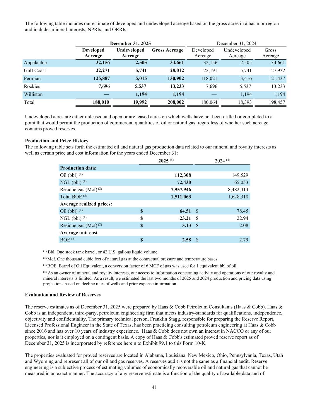 The following table includes our estimate of developed and undeveloped acreage based on the gross acres in a basin or region and includes mineral interests, NPRIs, and ORRIs: December 31, 2025 December 31, 2024 Developed Acreage Undeveloped Acreage Gross Acreage Developed Acreage Undeveloped Acreage Gross Acreage Appalachia 32,156 2,505 34,661 32,156 2,505 34,661 Gulf Coast 22,271 5,741 28,012 22,191 5,741 27,932 Permian 125,887 5,015 130,902 118,021 3,416 121,437 Rockies 7,696 5,537 13,233 7,696 5,537 13,233 Williston — 1,194 1,194 — 1,194 1,194 Total 188,010 19,992 208,002 180,064 18,393 198,457 Undeveloped acres are either unleased and open or are leased acres on which wells have not been drilled or completed to a point that would permit the production of commercial quantities of oil or natural gas, regardless of whether such acreage contains proved reserves. Production and Price History The following table sets forth the estimated oil and natural gas production data related to our mineral and royalty interests as well as certain price and cost information for the years ended December 31: 2025 (4) 2024 (4) Production data: Oil (bbl) (1) 112,308 149,529 NGL (bbl) (1) 72,430 65,053 Residue gas (Mcf) (2) 7,957,946 8,482,414 Total BOE (3) 1,511,063 1,628,318 Average realized prices: Oil (bbl) (1) $ 64.51 $ 78.45 NGL (bbl) (1) $ 23.21 $ 22.94 Residue gas (Mcf) (2) $ 3.13 $ 2.08 Average unit cost BOE (3) $ 2.58 $ 2.79 (1) Bbl. One stock tank barrel, or 42 U.S. gallons liquid volume. (2) Mcf. One thousand cubic feet of natural gas at the contractual pressure and temperature bases. (3) BOE. Barrel of Oil Equivalent, a conversion factor of 6 MCF of gas was used for 1 equivalent bbl of oil. (4) As an owner of mineral and royalty interests, our access to information concerning activity and operations of our royalty and mineral interests is limited. As a result, we estimated the last two months of 2025 and 2024 production and pricing data using projections based on decline rates of wells and prior expense information. Evaluation and Review of Reserves The reserve estimates as of December 31, 2025 were prepared by Haas & Cobb Petroleum Consultants (Haas & Cobb). Haas & Cobb is an independent, third-party, petroleum engineering firm that meets industry-standards for qualifications, independence, objectivity and confidentiality. The primary technical person, Franklin Stagg, responsible for preparing the Reserve Report, Licensed Professional Engineer in the State of Texas, has been practicing consulting petroleum engineering at Haas & Cobb since 2016 and has over 10 years of industry experience. Haas & Cobb does not own an interest in NACCO or any of our properties, nor is it employed on a contingent basis. A copy of Haas & Cobb's estimated proved reserve report as of December 31, 2025 is incorporated by reference herein to Exhibit 99.1 to this Form 10-K. The properties evaluated for proved reserves are located in Alabama, Louisiana, New Mexico, Ohio, Pennsylvania, Texas, Utah and Wyoming and represent all of our oil and gas reserves. A reserves audit is not the same as a financial audit. Reserve engineering is a subjective process of estimating volumes of economically recoverable oil and natural gas that cannot be measured in an exact manner. The accuracy of any reserve estimate is a function of the quality of available data and of 41