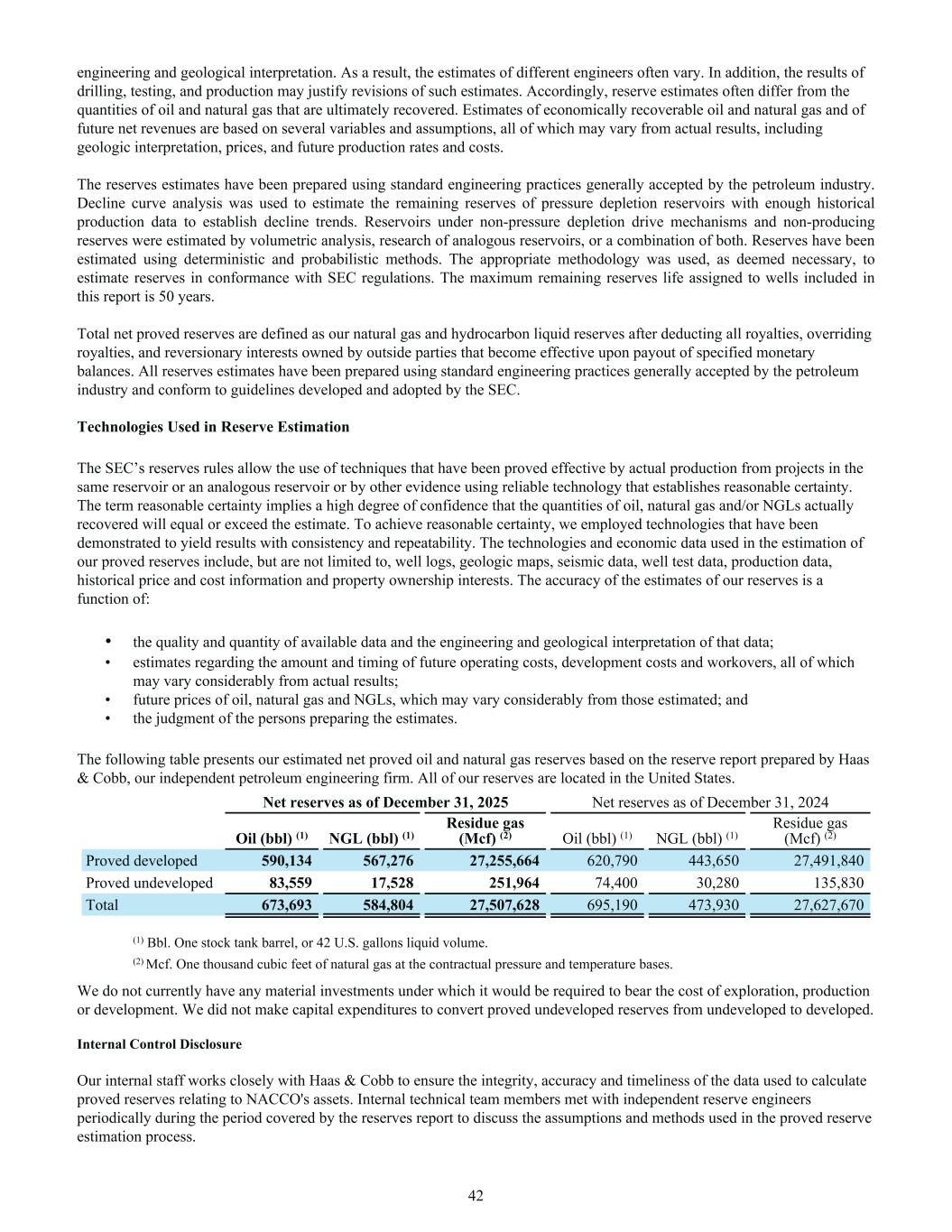 engineering and geological interpretation. As a result, the estimates of different engineers often vary. In addition, the results of drilling, testing, and production may justify revisions of such estimates. Accordingly, reserve estimates often differ from the quantities of oil and natural gas that are ultimately recovered. Estimates of economically recoverable oil and natural gas and of future net revenues are based on several variables and assumptions, all of which may vary from actual results, including geologic interpretation, prices, and future production rates and costs. The reserves estimates have been prepared using standard engineering practices generally accepted by the petroleum industry. Decline curve analysis was used to estimate the remaining reserves of pressure depletion reservoirs with enough historical production data to establish decline trends. Reservoirs under non-pressure depletion drive mechanisms and non-producing reserves were estimated by volumetric analysis, research of analogous reservoirs, or a combination of both. Reserves have been estimated using deterministic and probabilistic methods. The appropriate methodology was used, as deemed necessary, to estimate reserves in conformance with SEC regulations. The maximum remaining reserves life assigned to wells included in this report is 50 years. Total net proved reserves are defined as our natural gas and hydrocarbon liquid reserves after deducting all royalties, overriding royalties, and reversionary interests owned by outside parties that become effective upon payout of specified monetary balances. All reserves estimates have been prepared using standard engineering practices generally accepted by the petroleum industry and conform to guidelines developed and adopted by the SEC. Technologies Used in Reserve Estimation The SEC’s reserves rules allow the use of techniques that have been proved effective by actual production from projects in the same reservoir or an analogous reservoir or by other evidence using reliable technology that establishes reasonable certainty. The term reasonable certainty implies a high degree of confidence that the quantities of oil, natural gas and/or NGLs actually recovered will equal or exceed the estimate. To achieve reasonable certainty, we employed technologies that have been demonstrated to yield results with consistency and repeatability. The technologies and economic data used in the estimation of our proved reserves include, but are not limited to, well logs, geologic maps, seismic data, well test data, production data, historical price and cost information and property ownership interests. The accuracy of the estimates of our reserves is a function of: • the quality and quantity of available data and the engineering and geological interpretation of that data; • estimates regarding the amount and timing of future operating costs, development costs and workovers, all of which may vary considerably from actual results; • future prices of oil, natural gas and NGLs, which may vary considerably from those estimated; and • the judgment of the persons preparing the estimates. The following table presents our estimated net proved oil and natural gas reserves based on the reserve report prepared by Haas & Cobb, our independent petroleum engineering firm. All of our reserves are located in the United States. Net reserves as of December 31, 2025 Net reserves as of December 31, 2024 Oil (bbl) (1) NGL (bbl) (1) Residue gas (Mcf) (2) Oil (bbl) (1) NGL (bbl) (1) Residue gas (Mcf) (2) Proved developed 590,134 567,276 27,255,664 620,790 443,650 27,491,840 Proved undeveloped 83,559 17,528 251,964 74,400 30,280 135,830 Total 673,693 584,804 27,507,628 695,190 473,930 27,627,670 (1) Bbl. One stock tank barrel, or 42 U.S. gallons liquid volume. (2) Mcf. One thousand cubic feet of natural gas at the contractual pressure and temperature bases. We do not currently have any material investments under which it would be required to bear the cost of exploration, production or development. We did not make capital expenditures to convert proved undeveloped reserves from undeveloped to developed. Internal Control Disclosure Our internal staff works closely with Haas & Cobb to ensure the integrity, accuracy and timeliness of the data used to calculate proved reserves relating to NACCO's assets. Internal technical team members met with independent reserve engineers periodically during the period covered by the reserves report to discuss the assumptions and methods used in the proved reserve estimation process. 42