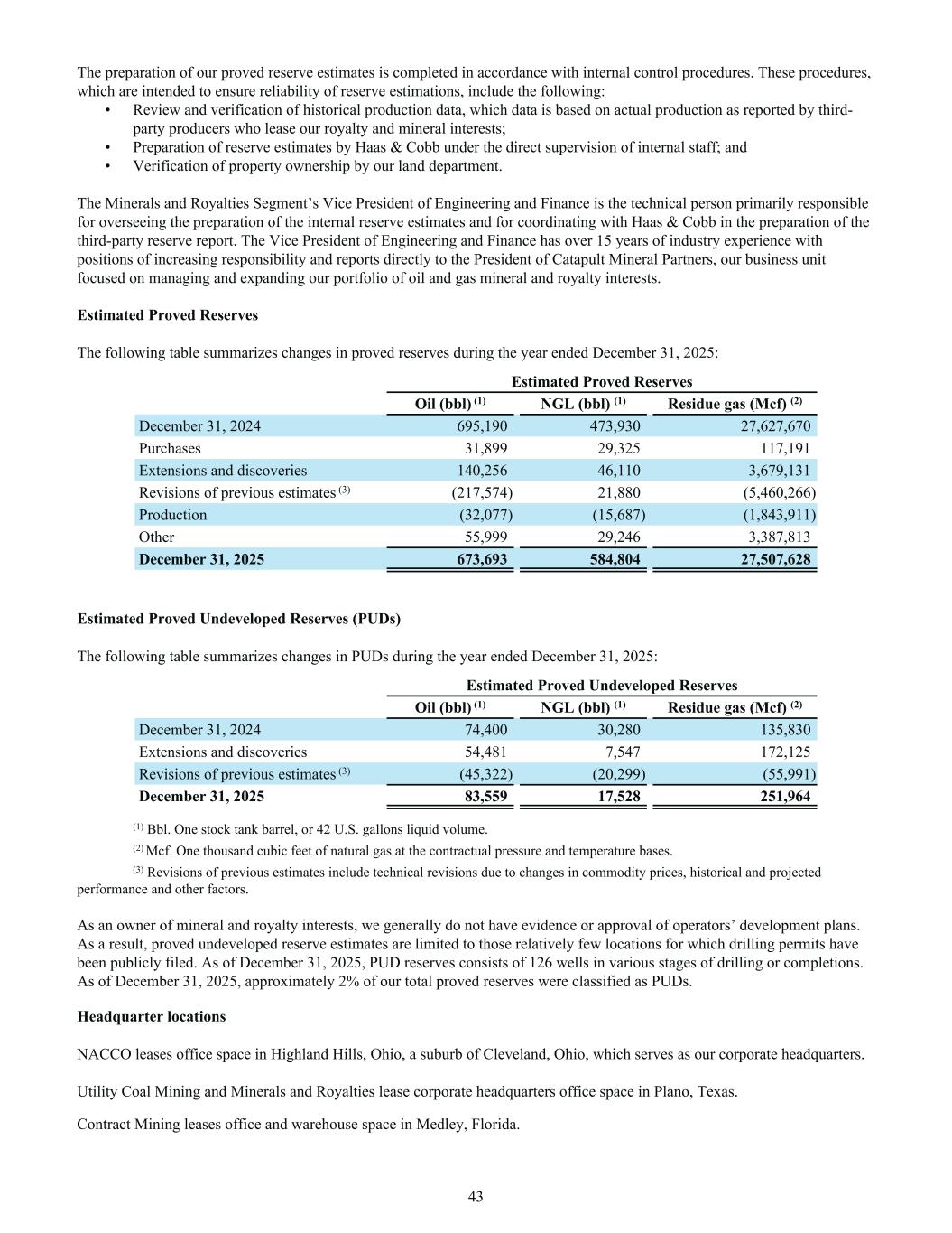 The preparation of our proved reserve estimates is completed in accordance with internal control procedures. These procedures, which are intended to ensure reliability of reserve estimations, include the following: • Review and verification of historical production data, which data is based on actual production as reported by third- party producers who lease our royalty and mineral interests; • Preparation of reserve estimates by Haas & Cobb under the direct supervision of internal staff; and • Verification of property ownership by our land department. The Minerals and Royalties Segment’s Vice President of Engineering and Finance is the technical person primarily responsible for overseeing the preparation of the internal reserve estimates and for coordinating with Haas & Cobb in the preparation of the third-party reserve report. The Vice President of Engineering and Finance has over 15 years of industry experience with positions of increasing responsibility and reports directly to the President of Catapult Mineral Partners, our business unit focused on managing and expanding our portfolio of oil and gas mineral and royalty interests. Estimated Proved Reserves The following table summarizes changes in proved reserves during the year ended December 31, 2025: Estimated Proved Reserves Oil (bbl) (1) NGL (bbl) (1) Residue gas (Mcf) (2) December 31, 2024 695,190 473,930 27,627,670 Purchases 31,899 29,325 117,191 Extensions and discoveries 140,256 46,110 3,679,131 Revisions of previous estimates (3) (217,574) 21,880 (5,460,266) Production (32,077) (15,687) (1,843,911) Other 55,999 29,246 3,387,813 December 31, 2025 673,693 584,804 27,507,628 Estimated Proved Undeveloped Reserves (PUDs) The following table summarizes changes in PUDs during the year ended December 31, 2025: Estimated Proved Undeveloped Reserves Oil (bbl) (1) NGL (bbl) (1) Residue gas (Mcf) (2) December 31, 2024 74,400 30,280 135,830 Extensions and discoveries 54,481 7,547 172,125 Revisions of previous estimates (3) (45,322) (20,299) (55,991) December 31, 2025 83,559 17,528 251,964 (1) Bbl. One stock tank barrel, or 42 U.S. gallons liquid volume. (2) Mcf. One thousand cubic feet of natural gas at the contractual pressure and temperature bases. (3) Revisions of previous estimates include technical revisions due to changes in commodity prices, historical and projected performance and other factors. As an owner of mineral and royalty interests, we generally do not have evidence or approval of operators’ development plans. As a result, proved undeveloped reserve estimates are limited to those relatively few locations for which drilling permits have been publicly filed. As of December 31, 2025, PUD reserves consists of 126 wells in various stages of drilling or completions. As of December 31, 2025, approximately 2% of our total proved reserves were classified as PUDs. Headquarter locations NACCO leases office space in Highland Hills, Ohio, a suburb of Cleveland, Ohio, which serves as our corporate headquarters. Utility Coal Mining and Minerals and Royalties lease corporate headquarters office space in Plano, Texas. Contract Mining leases office and warehouse space in Medley, Florida. 43