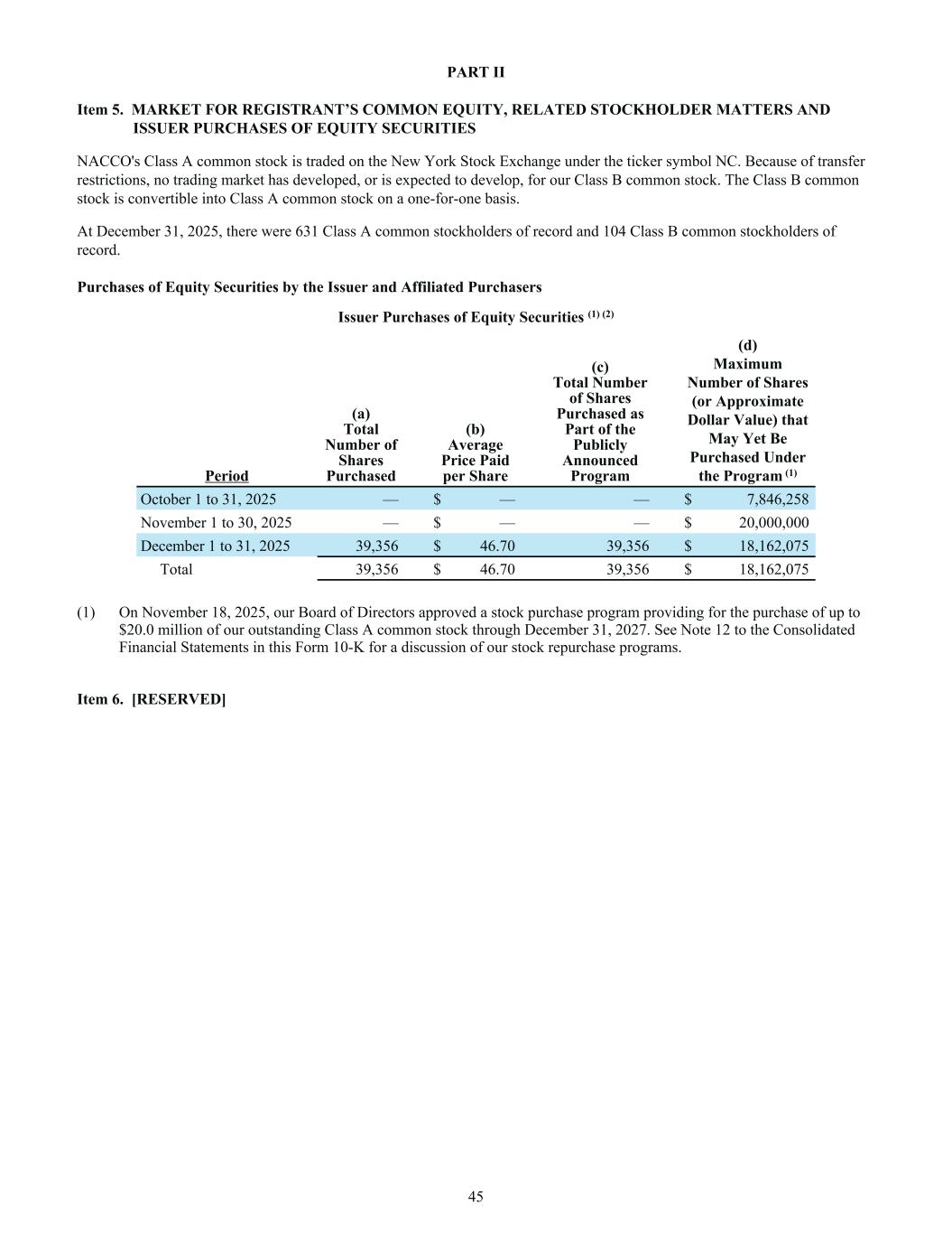 PART II Item 5. MARKET FOR REGISTRANT’S COMMON EQUITY, RELATED STOCKHOLDER MATTERS AND ISSUER PURCHASES OF EQUITY SECURITIES NACCO's Class A common stock is traded on the New York Stock Exchange under the ticker symbol NC. Because of transfer restrictions, no trading market has developed, or is expected to develop, for our Class B common stock. The Class B common stock is convertible into Class A common stock on a one-for-one basis. At December 31, 2025, there were 631 Class A common stockholders of record and 104 Class B common stockholders of record. Purchases of Equity Securities by the Issuer and Affiliated Purchasers Issuer Purchases of Equity Securities (1) (2) Period (a) Total Number of Shares Purchased (b) Average Price Paid per Share (c) Total Number of Shares Purchased as Part of the Publicly Announced Program (d) Maximum Number of Shares (or Approximate Dollar Value) that May Yet Be Purchased Under the Program (1) October 1 to 31, 2025 — $ — — $ 7,846,258 November 1 to 30, 2025 — $ — — $ 20,000,000 December 1 to 31, 2025 39,356 $ 46.70 39,356 $ 18,162,075 Total 39,356 $ 46.70 39,356 $ 18,162,075 (1) On November 18, 2025, our Board of Directors approved a stock purchase program providing for the purchase of up to $20.0 million of our outstanding Class A common stock through December 31, 2027. See Note 12 to the Consolidated Financial Statements in this Form 10-K for a discussion of our stock repurchase programs. Item 6. [RESERVED] 45