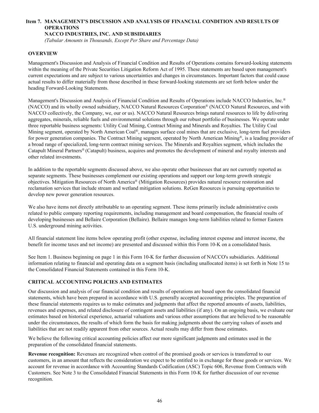 OVERVIEW Management's Discussion and Analysis of Financial Condition and Results of Operations contains forward-looking statements within the meaning of the Private Securities Litigation Reform Act of 1995. These statements are based upon management's current expectations and are subject to various uncertainties and changes in circumstances. Important factors that could cause actual results to differ materially from those described in these forward-looking statements are set forth below under the heading Forward-Looking Statements. Management's Discussion and Analysis of Financial Condition and Results of Operations include NACCO Industries, Inc.® (NACCO) and its wholly owned subsidiary, NACCO Natural Resources Corporation® (NACCO Natural Resources, and with NACCO collectively, the Company, we, our or us). NACCO Natural Resources brings natural resources to life by delivering aggregates, minerals, reliable fuels and environmental solutions through our robust portfolio of businesses. We operate under three reportable business segments: Utility Coal Mining, Contract Mining and Minerals and Royalties. The Utility Coal Mining segment, operated by North American Coal®, manages surface coal mines that are exclusive, long-term fuel providers for power generation companies. The Contract Mining segment, operated by North American Mining®, is a leading provider of a broad range of specialized, long-term contract mining services. The Minerals and Royalties segment, which includes the Catapult Mineral Partners® (Catapult) business, acquires and promotes the development of mineral and royalty interests and other related investments. In addition to the reportable segments discussed above, we also operate other businesses that are not currently reported as separate segments. These businesses complement our existing operations and support our long-term growth strategic objectives. Mitigation Resources of North America® (Mitigation Resources) provides natural resource restoration and reclamation services that include stream and wetland mitigation solutions. ReGen Resources is pursuing opportunities to develop new power generation resources. We also have items not directly attributable to an operating segment. These items primarily include administrative costs related to public company reporting requirements, including management and board compensation, the financial results of developing businesses and Bellaire Corporation (Bellaire). Bellaire manages long-term liabilities related to former Eastern U.S. underground mining activities. All financial statement line items below operating profit (other expense, including interest expense and interest income, the benefit for income taxes and net income) are presented and discussed within this Form 10-K on a consolidated basis. See Item 1. Business beginning on page 1 in this Form 10-K for further discussion of NACCO's subsidiaries. Additional information relating to financial and operating data on a segment basis (including unallocated items) is set forth in Note 15 to the Consolidated Financial Statements contained in this Form 10-K. CRITICAL ACCOUNTING POLICIES AND ESTIMATES Our discussion and analysis of our financial condition and results of operations are based upon the consolidated financial statements, which have been prepared in accordance with U.S. generally accepted accounting principles. The preparation of these financial statements requires us to make estimates and judgments that affect the reported amounts of assets, liabilities, revenues and expenses, and related disclosure of contingent assets and liabilities (if any). On an ongoing basis, we evaluate our estimates based on historical experience, actuarial valuations and various other assumptions that are believed to be reasonable under the circumstances, the results of which form the basis for making judgments about the carrying values of assets and liabilities that are not readily apparent from other sources. Actual results may differ from those estimates. We believe the following critical accounting policies affect our more significant judgments and estimates used in the preparation of the consolidated financial statements. Revenue recognition: Revenues are recognized when control of the promised goods or services is transferred to our customers, in an amount that reflects the consideration we expect to be entitled to in exchange for those goods or services. We account for revenue in accordance with Accounting Standards Codification (ASC) Topic 606, Revenue from Contracts with Customers. See Note 3 to the Consolidated Financial Statements in this Form 10-K for further discussion of our revenue recognition. Item 7. MANAGEMENT'S DISCUSSION AND ANALYSIS OF FINANCIAL CONDITION AND RESULTS OF OPERATIONS NACCO INDUSTRIES, INC. AND SUBSIDIARIES (Tabular Amounts in Thousands, Except Per Share and Percentage Data) 46