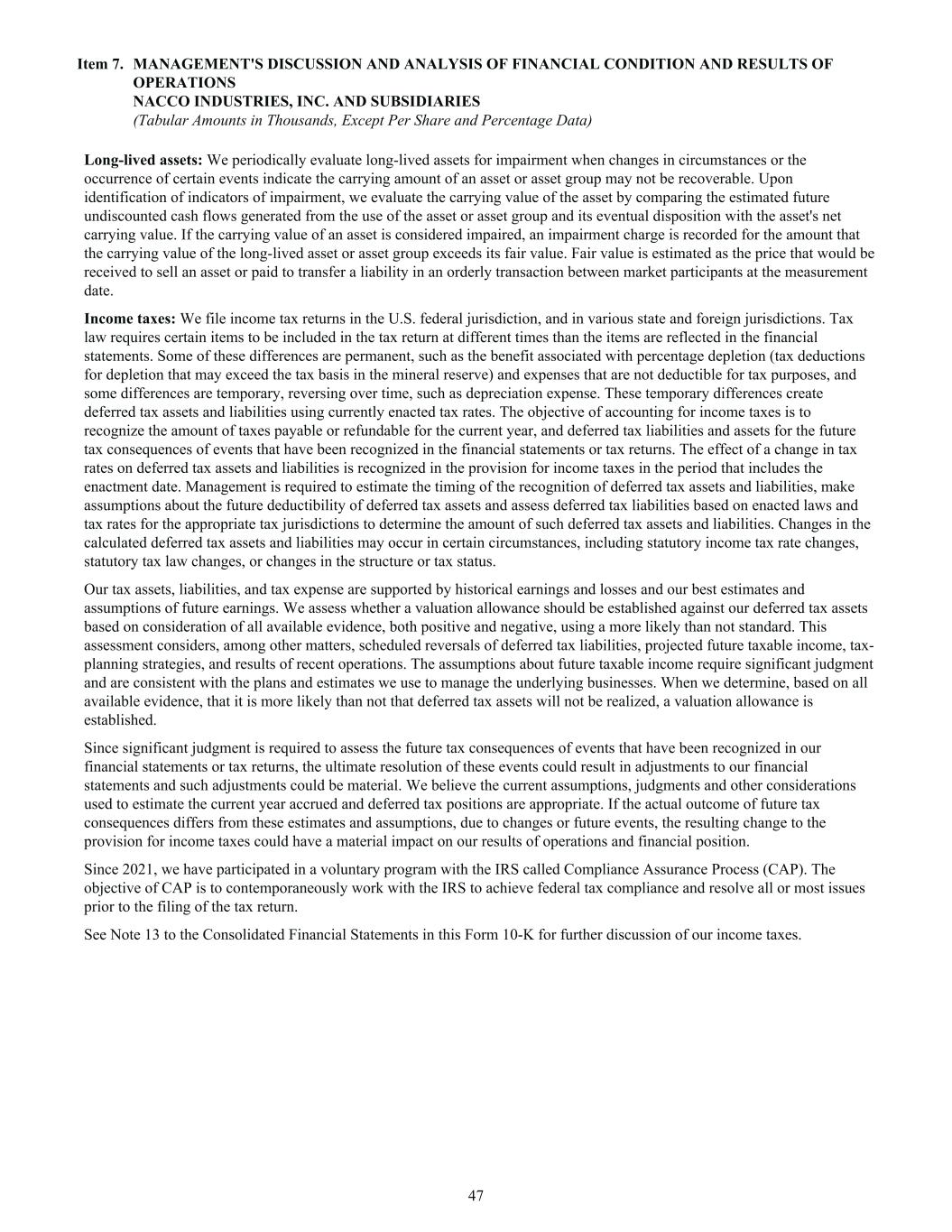 Long-lived assets: We periodically evaluate long-lived assets for impairment when changes in circumstances or the occurrence of certain events indicate the carrying amount of an asset or asset group may not be recoverable. Upon identification of indicators of impairment, we evaluate the carrying value of the asset by comparing the estimated future undiscounted cash flows generated from the use of the asset or asset group and its eventual disposition with the asset's net carrying value. If the carrying value of an asset is considered impaired, an impairment charge is recorded for the amount that the carrying value of the long-lived asset or asset group exceeds its fair value. Fair value is estimated as the price that would be received to sell an asset or paid to transfer a liability in an orderly transaction between market participants at the measurement date. Income taxes: We file income tax returns in the U.S. federal jurisdiction, and in various state and foreign jurisdictions. Tax law requires certain items to be included in the tax return at different times than the items are reflected in the financial statements. Some of these differences are permanent, such as the benefit associated with percentage depletion (tax deductions for depletion that may exceed the tax basis in the mineral reserve) and expenses that are not deductible for tax purposes, and some differences are temporary, reversing over time, such as depreciation expense. These temporary differences create deferred tax assets and liabilities using currently enacted tax rates. The objective of accounting for income taxes is to recognize the amount of taxes payable or refundable for the current year, and deferred tax liabilities and assets for the future tax consequences of events that have been recognized in the financial statements or tax returns. The effect of a change in tax rates on deferred tax assets and liabilities is recognized in the provision for income taxes in the period that includes the enactment date. Management is required to estimate the timing of the recognition of deferred tax assets and liabilities, make assumptions about the future deductibility of deferred tax assets and assess deferred tax liabilities based on enacted laws and tax rates for the appropriate tax jurisdictions to determine the amount of such deferred tax assets and liabilities. Changes in the calculated deferred tax assets and liabilities may occur in certain circumstances, including statutory income tax rate changes, statutory tax law changes, or changes in the structure or tax status. Our tax assets, liabilities, and tax expense are supported by historical earnings and losses and our best estimates and assumptions of future earnings. We assess whether a valuation allowance should be established against our deferred tax assets based on consideration of all available evidence, both positive and negative, using a more likely than not standard. This assessment considers, among other matters, scheduled reversals of deferred tax liabilities, projected future taxable income, tax- planning strategies, and results of recent operations. The assumptions about future taxable income require significant judgment and are consistent with the plans and estimates we use to manage the underlying businesses. When we determine, based on all available evidence, that it is more likely than not that deferred tax assets will not be realized, a valuation allowance is established. Since significant judgment is required to assess the future tax consequences of events that have been recognized in our financial statements or tax returns, the ultimate resolution of these events could result in adjustments to our financial statements and such adjustments could be material. We believe the current assumptions, judgments and other considerations used to estimate the current year accrued and deferred tax positions are appropriate. If the actual outcome of future tax consequences differs from these estimates and assumptions, due to changes or future events, the resulting change to the provision for income taxes could have a material impact on our results of operations and financial position. Since 2021, we have participated in a voluntary program with the IRS called Compliance Assurance Process (CAP). The objective of CAP is to contemporaneously work with the IRS to achieve federal tax compliance and resolve all or most issues prior to the filing of the tax return. See Note 13 to the Consolidated Financial Statements in this Form 10-K for further discussion of our income taxes. Item 7. MANAGEMENT'S DISCUSSION AND ANALYSIS OF FINANCIAL CONDITION AND RESULTS OF OPERATIONS NACCO INDUSTRIES, INC. AND SUBSIDIARIES (Tabular Amounts in Thousands, Except Per Share and Percentage Data) 47