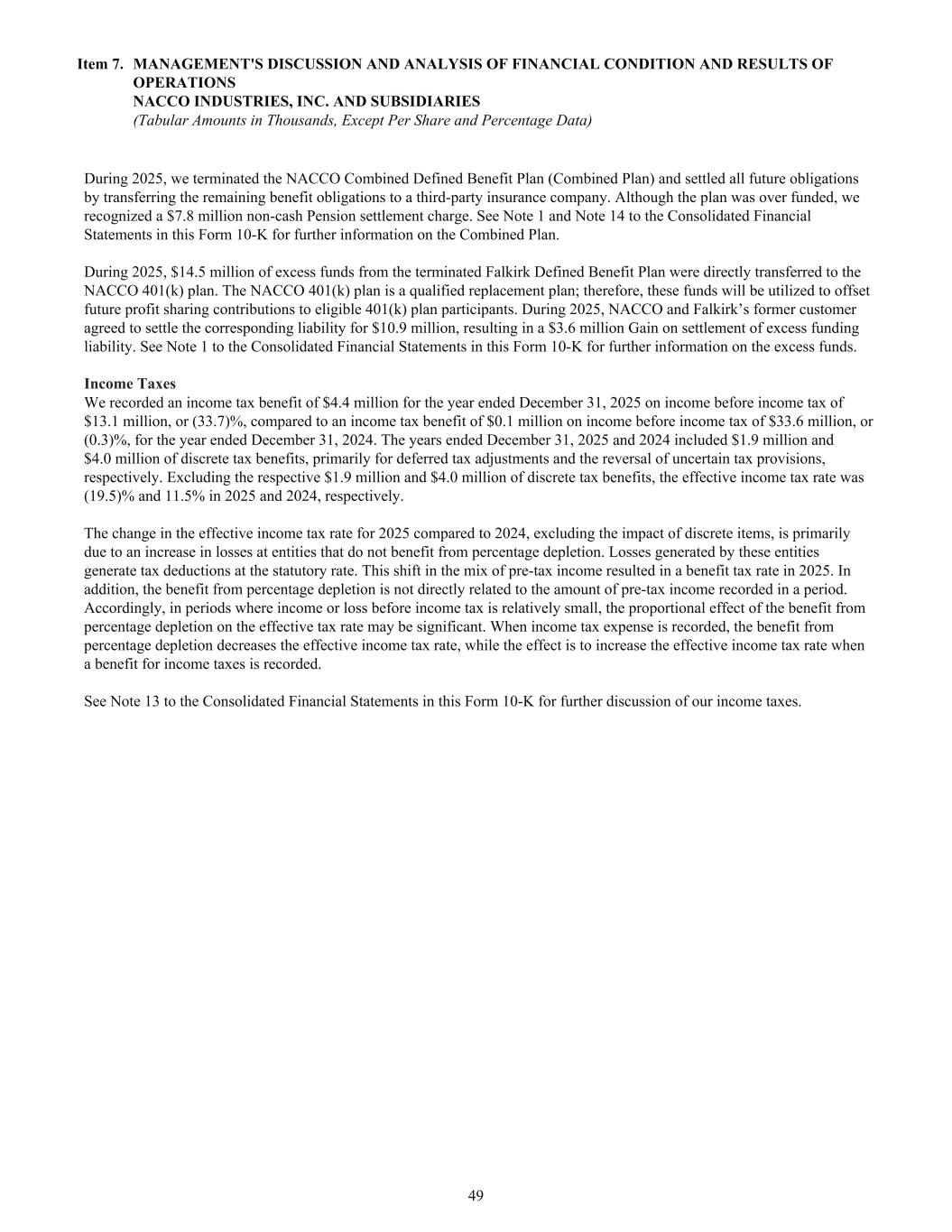 During 2025, we terminated the NACCO Combined Defined Benefit Plan (Combined Plan) and settled all future obligations by transferring the remaining benefit obligations to a third-party insurance company. Although the plan was over funded, we recognized a $7.8 million non-cash Pension settlement charge. See Note 1 and Note 14 to the Consolidated Financial Statements in this Form 10-K for further information on the Combined Plan. During 2025, $14.5 million of excess funds from the terminated Falkirk Defined Benefit Plan were directly transferred to the NACCO 401(k) plan. The NACCO 401(k) plan is a qualified replacement plan; therefore, these funds will be utilized to offset future profit sharing contributions to eligible 401(k) plan participants. During 2025, NACCO and Falkirk’s former customer agreed to settle the corresponding liability for $10.9 million, resulting in a $3.6 million Gain on settlement of excess funding liability. See Note 1 to the Consolidated Financial Statements in this Form 10-K for further information on the excess funds. Income Taxes We recorded an income tax benefit of $4.4 million for the year ended December 31, 2025 on income before income tax of $13.1 million, or (33.7)%, compared to an income tax benefit of $0.1 million on income before income tax of $33.6 million, or (0.3)%, for the year ended December 31, 2024. The years ended December 31, 2025 and 2024 included $1.9 million and $4.0 million of discrete tax benefits, primarily for deferred tax adjustments and the reversal of uncertain tax provisions, respectively. Excluding the respective $1.9 million and $4.0 million of discrete tax benefits, the effective income tax rate was (19.5)% and 11.5% in 2025 and 2024, respectively. The change in the effective income tax rate for 2025 compared to 2024, excluding the impact of discrete items, is primarily due to an increase in losses at entities that do not benefit from percentage depletion. Losses generated by these entities generate tax deductions at the statutory rate. This shift in the mix of pre-tax income resulted in a benefit tax rate in 2025. In addition, the benefit from percentage depletion is not directly related to the amount of pre-tax income recorded in a period. Accordingly, in periods where income or loss before income tax is relatively small, the proportional effect of the benefit from percentage depletion on the effective tax rate may be significant. When income tax expense is recorded, the benefit from percentage depletion decreases the effective income tax rate, while the effect is to increase the effective income tax rate when a benefit for income taxes is recorded. See Note 13 to the Consolidated Financial Statements in this Form 10-K for further discussion of our income taxes. Item 7. MANAGEMENT'S DISCUSSION AND ANALYSIS OF FINANCIAL CONDITION AND RESULTS OF OPERATIONS NACCO INDUSTRIES, INC. AND SUBSIDIARIES (Tabular Amounts in Thousands, Except Per Share and Percentage Data) 49