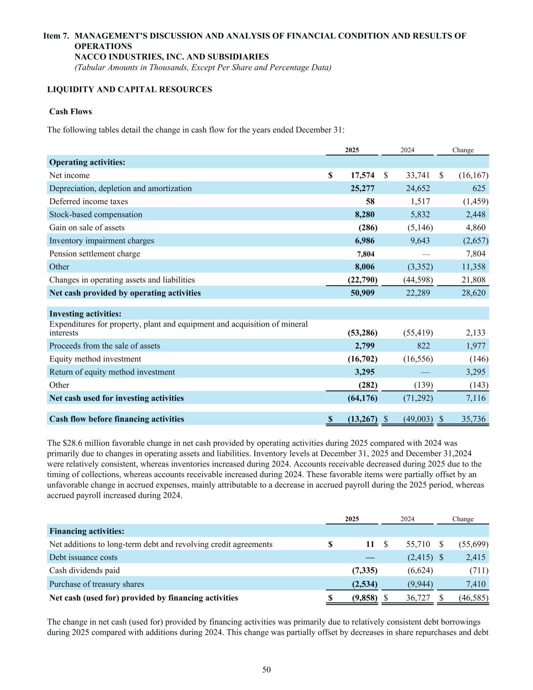 LIQUIDITY AND CAPITAL RESOURCES Cash Flows The following tables detail the change in cash flow for the years ended December 31: 2025 2024 Change Operating activities: Net income $ 17,574 $ 33,741 $ (16,167) Depreciation, depletion and amortization 25,277 24,652 625 Deferred income taxes 58 1,517 (1,459) Stock-based compensation 8,280 5,832 2,448 Gain on sale of assets (286) (5,146) 4,860 Inventory impairment charges 6,986 9,643 (2,657) Pension settlement charge 7,804 — 7,804 Other 8,006 (3,352) 11,358 Changes in operating assets and liabilities (22,790) (44,598) 21,808 Net cash provided by operating activities 50,909 22,289 28,620 Investing activities: Expenditures for property, plant and equipment and acquisition of mineral interests (53,286) (55,419) 2,133 Proceeds from the sale of assets 2,799 822 1,977 Equity method investment (16,702) (16,556) (146) Return of equity method investment 3,295 — 3,295 Other (282) (139) (143) Net cash used for investing activities (64,176) (71,292) 7,116 Cash flow before financing activities $ (13,267) $ (49,003) $ 35,736 The $28.6 million favorable change in net cash provided by operating activities during 2025 compared with 2024 was primarily due to changes in operating assets and liabilities. Inventory levels at December 31, 2025 and December 31,2024 were relatively consistent, whereas inventories increased during 2024. Accounts receivable decreased during 2025 due to the timing of collections, whereas accounts receivable increased during 2024. These favorable items were partially offset by an unfavorable change in accrued expenses, mainly attributable to a decrease in accrued payroll during the 2025 period, whereas accrued payroll increased during 2024. 2025 2024 Change Financing activities: Net additions to long-term debt and revolving credit agreements $ 11 $ 55,710 $ (55,699) Debt issuance costs — (2,415) $ 2,415 Cash dividends paid (7,335) (6,624) (711) Purchase of treasury shares (2,534) (9,944) 7,410 Net cash (used for) provided by financing activities $ (9,858) $ 36,727 $ (46,585) The change in net cash (used for) provided by financing activities was primarily due to relatively consistent debt borrowings during 2025 compared with additions during 2024. This change was partially offset by decreases in share repurchases and debt Item 7. MANAGEMENT'S DISCUSSION AND ANALYSIS OF FINANCIAL CONDITION AND RESULTS OF OPERATIONS NACCO INDUSTRIES, INC. AND SUBSIDIARIES (Tabular Amounts in Thousands, Except Per Share and Percentage Data) 50