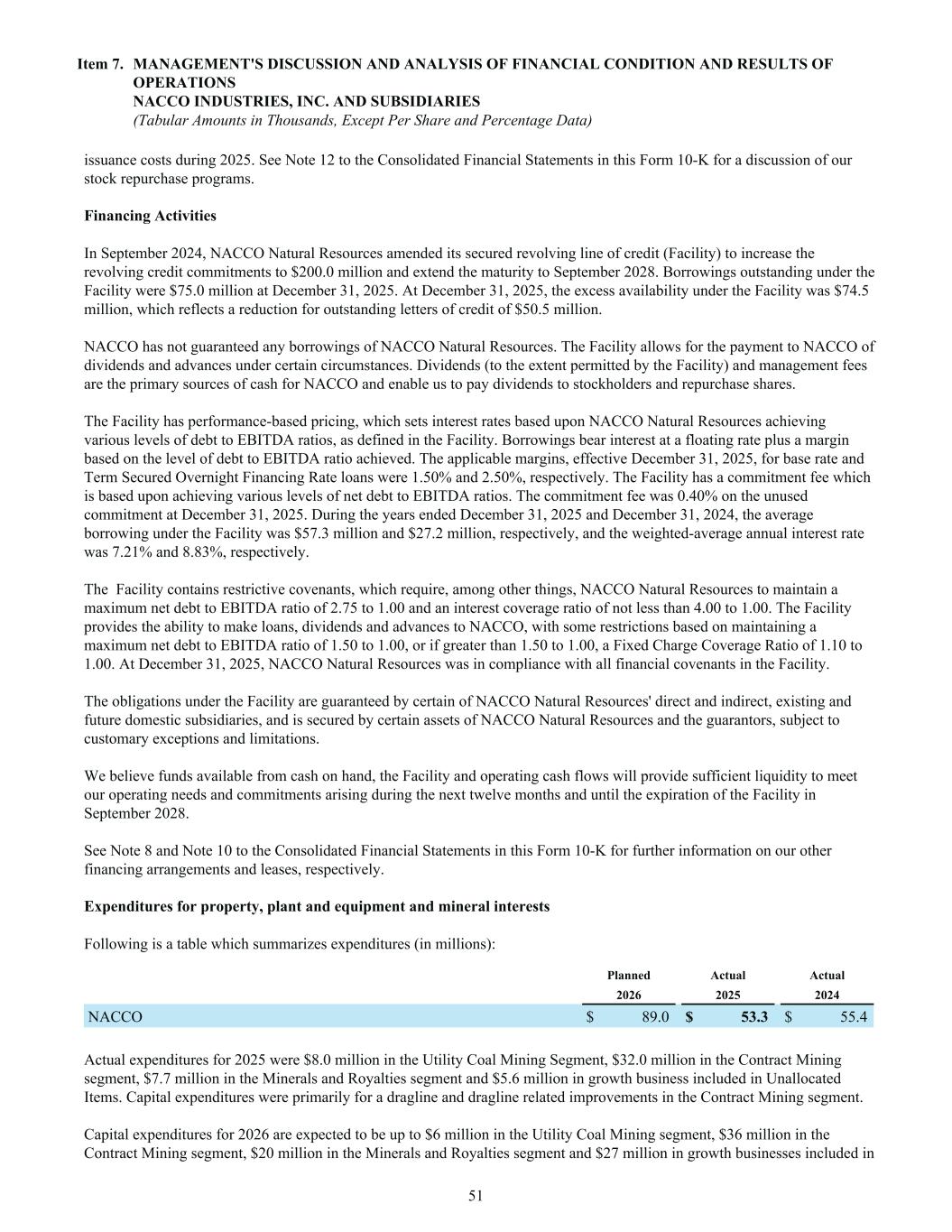 issuance costs during 2025. See Note 12 to the Consolidated Financial Statements in this Form 10-K for a discussion of our stock repurchase programs. Financing Activities In September 2024, NACCO Natural Resources amended its secured revolving line of credit (Facility) to increase the revolving credit commitments to $200.0 million and extend the maturity to September 2028. Borrowings outstanding under the Facility were $75.0 million at December 31, 2025. At December 31, 2025, the excess availability under the Facility was $74.5 million, which reflects a reduction for outstanding letters of credit of $50.5 million. NACCO has not guaranteed any borrowings of NACCO Natural Resources. The Facility allows for the payment to NACCO of dividends and advances under certain circumstances. Dividends (to the extent permitted by the Facility) and management fees are the primary sources of cash for NACCO and enable us to pay dividends to stockholders and repurchase shares. The Facility has performance-based pricing, which sets interest rates based upon NACCO Natural Resources achieving various levels of debt to EBITDA ratios, as defined in the Facility. Borrowings bear interest at a floating rate plus a margin based on the level of debt to EBITDA ratio achieved. The applicable margins, effective December 31, 2025, for base rate and Term Secured Overnight Financing Rate loans were 1.50% and 2.50%, respectively. The Facility has a commitment fee which is based upon achieving various levels of net debt to EBITDA ratios. The commitment fee was 0.40% on the unused commitment at December 31, 2025. During the years ended December 31, 2025 and December 31, 2024, the average borrowing under the Facility was $57.3 million and $27.2 million, respectively, and the weighted-average annual interest rate was 7.21% and 8.83%, respectively. The Facility contains restrictive covenants, which require, among other things, NACCO Natural Resources to maintain a maximum net debt to EBITDA ratio of 2.75 to 1.00 and an interest coverage ratio of not less than 4.00 to 1.00. The Facility provides the ability to make loans, dividends and advances to NACCO, with some restrictions based on maintaining a maximum net debt to EBITDA ratio of 1.50 to 1.00, or if greater than 1.50 to 1.00, a Fixed Charge Coverage Ratio of 1.10 to 1.00. At December 31, 2025, NACCO Natural Resources was in compliance with all financial covenants in the Facility. The obligations under the Facility are guaranteed by certain of NACCO Natural Resources' direct and indirect, existing and future domestic subsidiaries, and is secured by certain assets of NACCO Natural Resources and the guarantors, subject to customary exceptions and limitations. We believe funds available from cash on hand, the Facility and operating cash flows will provide sufficient liquidity to meet our operating needs and commitments arising during the next twelve months and until the expiration of the Facility in September 2028. See Note 8 and Note 10 to the Consolidated Financial Statements in this Form 10-K for further information on our other financing arrangements and leases, respectively. Expenditures for property, plant and equipment and mineral interests Following is a table which summarizes expenditures (in millions): Planned Actual Actual 2026 2025 2024 NACCO $ 89.0 $ 53.3 $ 55.4 Actual expenditures for 2025 were $8.0 million in the Utility Coal Mining Segment, $32.0 million in the Contract Mining segment, $7.7 million in the Minerals and Royalties segment and $5.6 million in growth business included in Unallocated Items. Capital expenditures were primarily for a dragline and dragline related improvements in the Contract Mining segment. Capital expenditures for 2026 are expected to be up to $6 million in the Utility Coal Mining segment, $36 million in the Contract Mining segment, $20 million in the Minerals and Royalties segment and $27 million in growth businesses included in Item 7. MANAGEMENT'S DISCUSSION AND ANALYSIS OF FINANCIAL CONDITION AND RESULTS OF OPERATIONS NACCO INDUSTRIES, INC. AND SUBSIDIARIES (Tabular Amounts in Thousands, Except Per Share and Percentage Data) 51