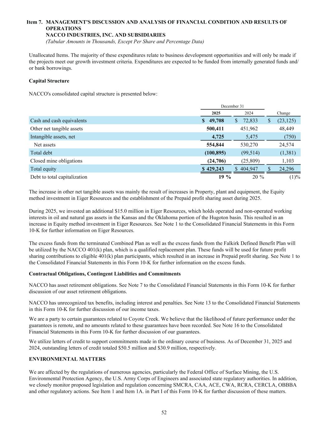 Unallocated Items. The majority of these expenditures relate to business development opportunities and will only be made if the projects meet our growth investment criteria. Expenditures are expected to be funded from internally generated funds and/ or bank borrowings. Capital Structure NACCO's consolidated capital structure is presented below: December 31 2025 2024 Change Cash and cash equivalents $ 49,708 $ 72,833 $ (23,125) Other net tangible assets 500,411 451,962 48,449 Intangible assets, net 4,725 5,475 (750) Net assets 554,844 530,270 24,574 Total debt (100,895) (99,514) (1,381) Closed mine obligations (24,706) (25,809) 1,103 Total equity $ 429,243 $ 404,947 $ 24,296 Debt to total capitalization 19 % 20 % (1) % The increase in other net tangible assets was mainly the result of increases in Property, plant and equipment, the Equity method investment in Eiger Resources and the establishment of the Prepaid profit sharing asset during 2025. During 2025, we invested an additional $15.0 million in Eiger Resources, which holds operated and non-operated working interests in oil and natural gas assets in the Kansas and the Oklahoma portion of the Hugoton basin. This resulted in an increase in Equity method investment in Eiger Resources. See Note 1 to the Consolidated Financial Statements in this Form 10-K for further information on Eiger Resources. The excess funds from the terminated Combined Plan as well as the excess funds from the Falkirk Defined Benefit Plan will be utilized by the NACCO 401(k) plan, which is a qualified replacement plan. These funds will be used for future profit sharing contributions to eligible 401(k) plan participants, which resulted in an increase in Prepaid profit sharing. See Note 1 to the Consolidated Financial Statements in this Form 10-K for further information on the excess funds. Contractual Obligations, Contingent Liabilities and Commitments NACCO has asset retirement obligations. See Note 7 to the Consolidated Financial Statements in this Form 10-K for further discussion of our asset retirement obligations. NACCO has unrecognized tax benefits, including interest and penalties. See Note 13 to the Consolidated Financial Statements in this Form 10-K for further discussion of our income taxes. We are a party to certain guarantees related to Coyote Creek. We believe that the likelihood of future performance under the guarantees is remote, and no amounts related to these guarantees have been recorded. See Note 16 to the Consolidated Financial Statements in this Form 10-K for further discussion of our guarantees. We utilize letters of credit to support commitments made in the ordinary course of business. As of December 31, 2025 and 2024, outstanding letters of credit totaled $50.5 million and $30.9 million, respectively. ENVIRONMENTAL MATTERS We are affected by the regulations of numerous agencies, particularly the Federal Office of Surface Mining, the U.S. Environmental Protection Agency, the U.S. Army Corps of Engineers and associated state regulatory authorities. In addition, we closely monitor proposed legislation and regulation concerning SMCRA, CAA, ACE, CWA, RCRA, CERCLA, OBBBA and other regulatory actions. See Item 1 and Item 1A. in Part I of this Form 10-K for further discussion of these matters. Item 7. MANAGEMENT'S DISCUSSION AND ANALYSIS OF FINANCIAL CONDITION AND RESULTS OF OPERATIONS NACCO INDUSTRIES, INC. AND SUBSIDIARIES (Tabular Amounts in Thousands, Except Per Share and Percentage Data) 52