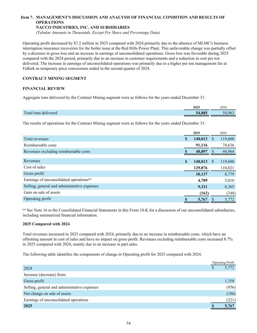 Operating profit decreased by $7.2 million in 2025 compared with 2024 primarily due to the absence of MLMC's business interruption insurance recoveries for the boiler issue at the Red Hills Power Plant. This unfavorable change was partially offset by a decrease in gross loss and an increase in earnings of unconsolidated operations. Gross loss was favorable during 2025 compared with the 2024 period, primarily due to an increase in customer requirements and a reduction in cost per ton delivered. The increase in earnings of unconsolidated operations was primarily due to a higher per ton management fee at Falkirk as temporary price concessions ended in the second quarter of 2024. CONTRACT MINING SEGMENT FINANCIAL REVIEW Aggregate tons delivered by the Contract Mining segment were as follows for the years ended December 31: 2025 2024 Total tons delivered 54,885 54,963 The results of operations for the Contract Mining segment were as follows for the years ended December 31: 2025 2024 Total revenues $ 140,013 $ 119,600 Reimbursable costs 91,116 74,636 Revenues excluding reimbursable costs $ 48,897 $ 44,964 Revenues $ 140,013 $ 119,600 Cost of sales 129,876 110,821 Gross profit 10,137 8,779 Earnings of unconsolidated operations(a) 4,789 5,010 Selling, general and administrative expenses 9,321 8,365 Gain on sale of assets (162) (348) Operating profit $ 5,767 $ 5,772 (a) See Note 16 to the Consolidated Financial Statements in this Form 10-K for a discussion of our unconsolidated subsidiaries, including summarized financial information. 2025 Compared with 2024 Total revenues increased in 2025 compared with 2024, primarily due to an increase in reimbursable costs, which have an offsetting amount in cost of sales and have no impact on gross profit. Revenues excluding reimbursable costs increased 8.7% in 2025 compared with 2024, mainly due to an increase in part sales. The following table identifies the components of change in Operating profit for 2025 compared with 2024. Operating Profit 2024 $ 5,772 Increase (decrease) from: Gross profit 1,358 Selling, general and administrative expenses (956) Net change on sale of assets (186) Earnings of unconsolidated operations (221) 2025 $ 5,767 Item 7. MANAGEMENT'S DISCUSSION AND ANALYSIS OF FINANCIAL CONDITION AND RESULTS OF OPERATIONS NACCO INDUSTRIES, INC. AND SUBSIDIARIES (Tabular Amounts in Thousands, Except Per Share and Percentage Data) 54