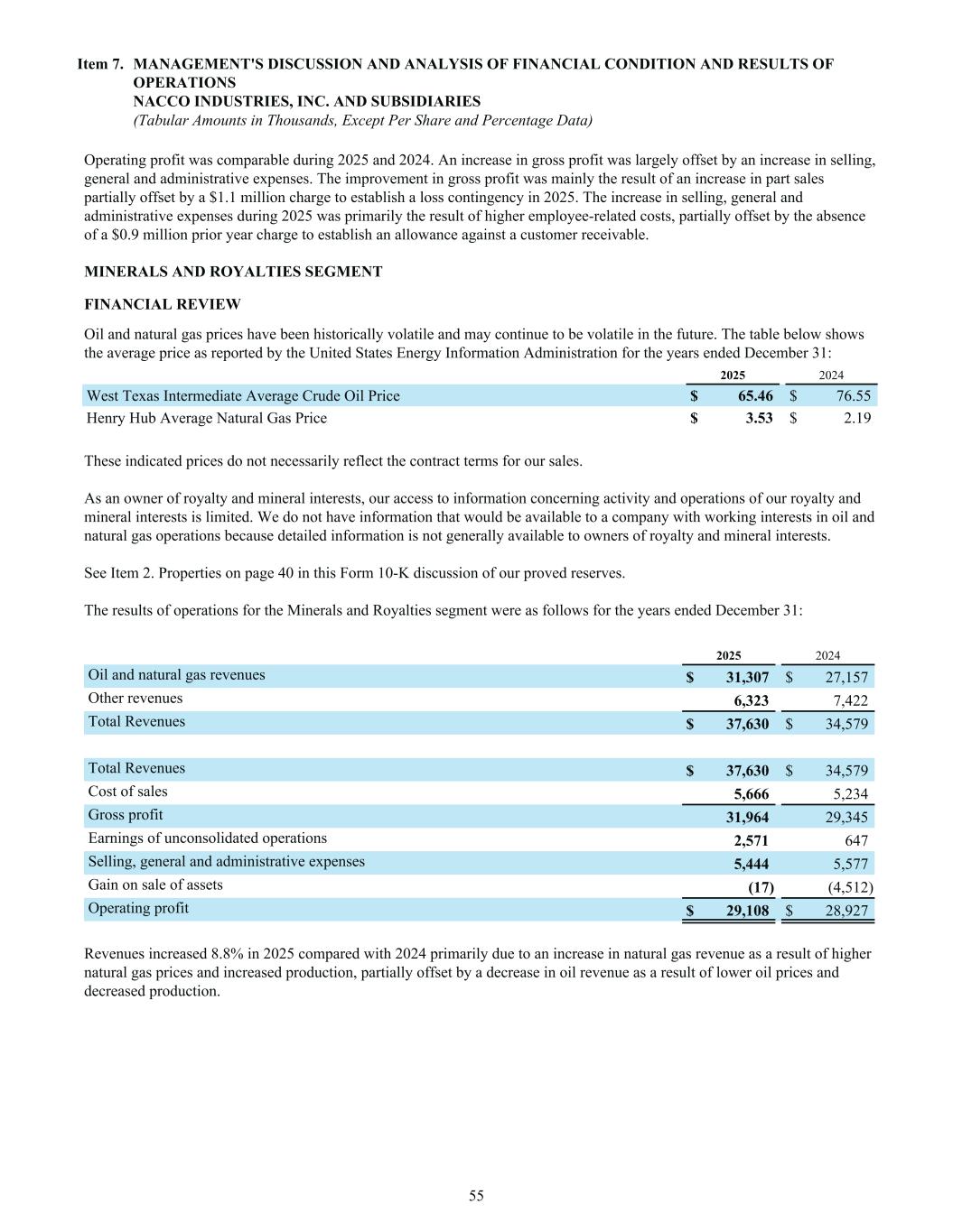 Operating profit was comparable during 2025 and 2024. An increase in gross profit was largely offset by an increase in selling, general and administrative expenses. The improvement in gross profit was mainly the result of an increase in part sales partially offset by a $1.1 million charge to establish a loss contingency in 2025. The increase in selling, general and administrative expenses during 2025 was primarily the result of higher employee-related costs, partially offset by the absence of a $0.9 million prior year charge to establish an allowance against a customer receivable. MINERALS AND ROYALTIES SEGMENT FINANCIAL REVIEW Oil and natural gas prices have been historically volatile and may continue to be volatile in the future. The table below shows the average price as reported by the United States Energy Information Administration for the years ended December 31: 2025 2024 West Texas Intermediate Average Crude Oil Price $ 65.46 $ 76.55 Henry Hub Average Natural Gas Price $ 3.53 $ 2.19 These indicated prices do not necessarily reflect the contract terms for our sales. As an owner of royalty and mineral interests, our access to information concerning activity and operations of our royalty and mineral interests is limited. We do not have information that would be available to a company with working interests in oil and natural gas operations because detailed information is not generally available to owners of royalty and mineral interests. See Item 2. Properties on page 40 in this Form 10-K discussion of our proved reserves. The results of operations for the Minerals and Royalties segment were as follows for the years ended December 31: 2025 2024 Oil and natural gas revenues $ 31,307 $ 27,157 Other revenues 6,323 7,422 Total Revenues $ 37,630 $ 34,579 Total Revenues $ 37,630 $ 34,579 Cost of sales 5,666 5,234 Gross profit 31,964 29,345 Earnings of unconsolidated operations 2,571 647 Selling, general and administrative expenses 5,444 5,577 Gain on sale of assets (17) (4,512) Operating profit $ 29,108 $ 28,927 Revenues increased 8.8% in 2025 compared with 2024 primarily due to an increase in natural gas revenue as a result of higher natural gas prices and increased production, partially offset by a decrease in oil revenue as a result of lower oil prices and decreased production. Item 7. MANAGEMENT'S DISCUSSION AND ANALYSIS OF FINANCIAL CONDITION AND RESULTS OF OPERATIONS NACCO INDUSTRIES, INC. AND SUBSIDIARIES (Tabular Amounts in Thousands, Except Per Share and Percentage Data) 55
