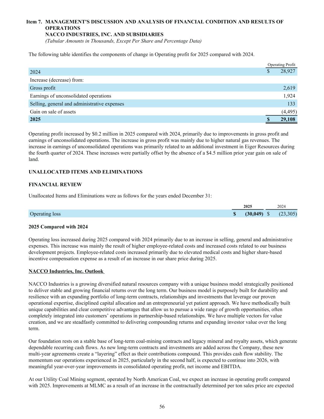 The following table identifies the components of change in Operating profit for 2025 compared with 2024. Operating Profit 2024 $ 28,927 Increase (decrease) from: Gross profit 2,619 Earnings of unconsolidated operations 1,924 Selling, general and administrative expenses 133 Gain on sale of assets (4,495) 2025 $ 29,108 Operating profit increased by $0.2 million in 2025 compared with 2024, primarily due to improvements in gross profit and earnings of unconsolidated operations. The increase in gross profit was mainly due to higher natural gas revenues. The increase in earnings of unconsolidated operations was primarily related to an additional investment in Eiger Resources during the fourth quarter of 2024. These increases were partially offset by the absence of a $4.5 million prior year gain on sale of land. UNALLOCATED ITEMS AND ELIMINATIONS FINANCIAL REVIEW Unallocated Items and Eliminations were as follows for the years ended December 31: 2025 2024 Operating loss $ (30,049) $ (23,305) 2025 Compared with 2024 Operating loss increased during 2025 compared with 2024 primarily due to an increase in selling, general and administrative expenses. This increase was mainly the result of higher employee-related costs and increased costs related to our business development projects. Employee-related costs increased primarily due to elevated medical costs and higher share-based incentive compensation expense as a result of an increase in our share price during 2025. NACCO Industries, Inc. Outlook NACCO Industries is a growing diversified natural resources company with a unique business model strategically positioned to deliver stable and growing financial returns over the long term. Our business model is purposely built for durability and resilience with an expanding portfolio of long-term contracts, relationships and investments that leverage our proven operational expertise, disciplined capital allocation and an entrepreneurial yet patient approach. We have methodically built unique capabilities and clear competitive advantages that allow us to pursue a wide range of growth opportunities, often completely integrated into customers’ operations in partnership-based relationships. We have multiple vectors for value creation, and we are steadfastly committed to delivering compounding returns and expanding investor value over the long term. Our foundation rests on a stable base of long-term coal-mining contracts and legacy mineral and royalty assets, which generate dependable recurring cash flows. As new long-term contracts and investments are added across the Company, these new multi-year agreements create a “layering” effect as their contributions compound. This provides cash flow stability. The momentum our operations experienced in 2025, particularly in the second half, is expected to continue into 2026, with meaningful year-over-year improvements in consolidated operating profit, net income and EBITDA. At our Utility Coal Mining segment, operated by North American Coal, we expect an increase in operating profit compared with 2025. Improvements at MLMC as a result of an increase in the contractually determined per ton sales price are expected Item 7. MANAGEMENT'S DISCUSSION AND ANALYSIS OF FINANCIAL CONDITION AND RESULTS OF OPERATIONS NACCO INDUSTRIES, INC. AND SUBSIDIARIES (Tabular Amounts in Thousands, Except Per Share and Percentage Data) 56