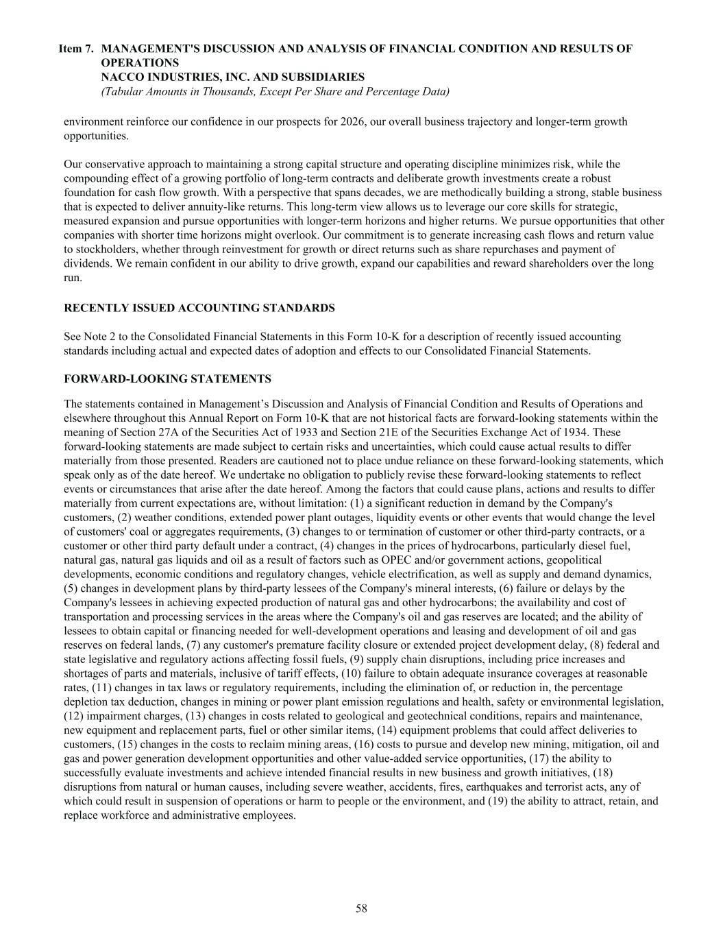 environment reinforce our confidence in our prospects for 2026, our overall business trajectory and longer-term growth opportunities. Our conservative approach to maintaining a strong capital structure and operating discipline minimizes risk, while the compounding effect of a growing portfolio of long-term contracts and deliberate growth investments create a robust foundation for cash flow growth. With a perspective that spans decades, we are methodically building a strong, stable business that is expected to deliver annuity-like returns. This long-term view allows us to leverage our core skills for strategic, measured expansion and pursue opportunities with longer-term horizons and higher returns. We pursue opportunities that other companies with shorter time horizons might overlook. Our commitment is to generate increasing cash flows and return value to stockholders, whether through reinvestment for growth or direct returns such as share repurchases and payment of dividends. We remain confident in our ability to drive growth, expand our capabilities and reward shareholders over the long run. RECENTLY ISSUED ACCOUNTING STANDARDS See Note 2 to the Consolidated Financial Statements in this Form 10-K for a description of recently issued accounting standards including actual and expected dates of adoption and effects to our Consolidated Financial Statements. FORWARD-LOOKING STATEMENTS The statements contained in Management’s Discussion and Analysis of Financial Condition and Results of Operations and elsewhere throughout this Annual Report on Form 10-K that are not historical facts are forward-looking statements within the meaning of Section 27A of the Securities Act of 1933 and Section 21E of the Securities Exchange Act of 1934. These forward-looking statements are made subject to certain risks and uncertainties, which could cause actual results to differ materially from those presented. Readers are cautioned not to place undue reliance on these forward-looking statements, which speak only as of the date hereof. We undertake no obligation to publicly revise these forward-looking statements to reflect events or circumstances that arise after the date hereof. Among the factors that could cause plans, actions and results to differ materially from current expectations are, without limitation: (1) a significant reduction in demand by the Company's customers, (2) weather conditions, extended power plant outages, liquidity events or other events that would change the level of customers' coal or aggregates requirements, (3) changes to or termination of customer or other third-party contracts, or a customer or other third party default under a contract, (4) changes in the prices of hydrocarbons, particularly diesel fuel, natural gas, natural gas liquids and oil as a result of factors such as OPEC and/or government actions, geopolitical developments, economic conditions and regulatory changes, vehicle electrification, as well as supply and demand dynamics, (5) changes in development plans by third-party lessees of the Company's mineral interests, (6) failure or delays by the Company's lessees in achieving expected production of natural gas and other hydrocarbons; the availability and cost of transportation and processing services in the areas where the Company's oil and gas reserves are located; and the ability of lessees to obtain capital or financing needed for well-development operations and leasing and development of oil and gas reserves on federal lands, (7) any customer's premature facility closure or extended project development delay, (8) federal and state legislative and regulatory actions affecting fossil fuels, (9) supply chain disruptions, including price increases and shortages of parts and materials, inclusive of tariff effects, (10) failure to obtain adequate insurance coverages at reasonable rates, (11) changes in tax laws or regulatory requirements, including the elimination of, or reduction in, the percentage depletion tax deduction, changes in mining or power plant emission regulations and health, safety or environmental legislation, (12) impairment charges, (13) changes in costs related to geological and geotechnical conditions, repairs and maintenance, new equipment and replacement parts, fuel or other similar items, (14) equipment problems that could affect deliveries to customers, (15) changes in the costs to reclaim mining areas, (16) costs to pursue and develop new mining, mitigation, oil and gas and power generation development opportunities and other value-added service opportunities, (17) the ability to successfully evaluate investments and achieve intended financial results in new business and growth initiatives, (18) disruptions from natural or human causes, including severe weather, accidents, fires, earthquakes and terrorist acts, any of which could result in suspension of operations or harm to people or the environment, and (19) the ability to attract, retain, and replace workforce and administrative employees. Item 7. MANAGEMENT'S DISCUSSION AND ANALYSIS OF FINANCIAL CONDITION AND RESULTS OF OPERATIONS NACCO INDUSTRIES, INC. AND SUBSIDIARIES (Tabular Amounts in Thousands, Except Per Share and Percentage Data) 58