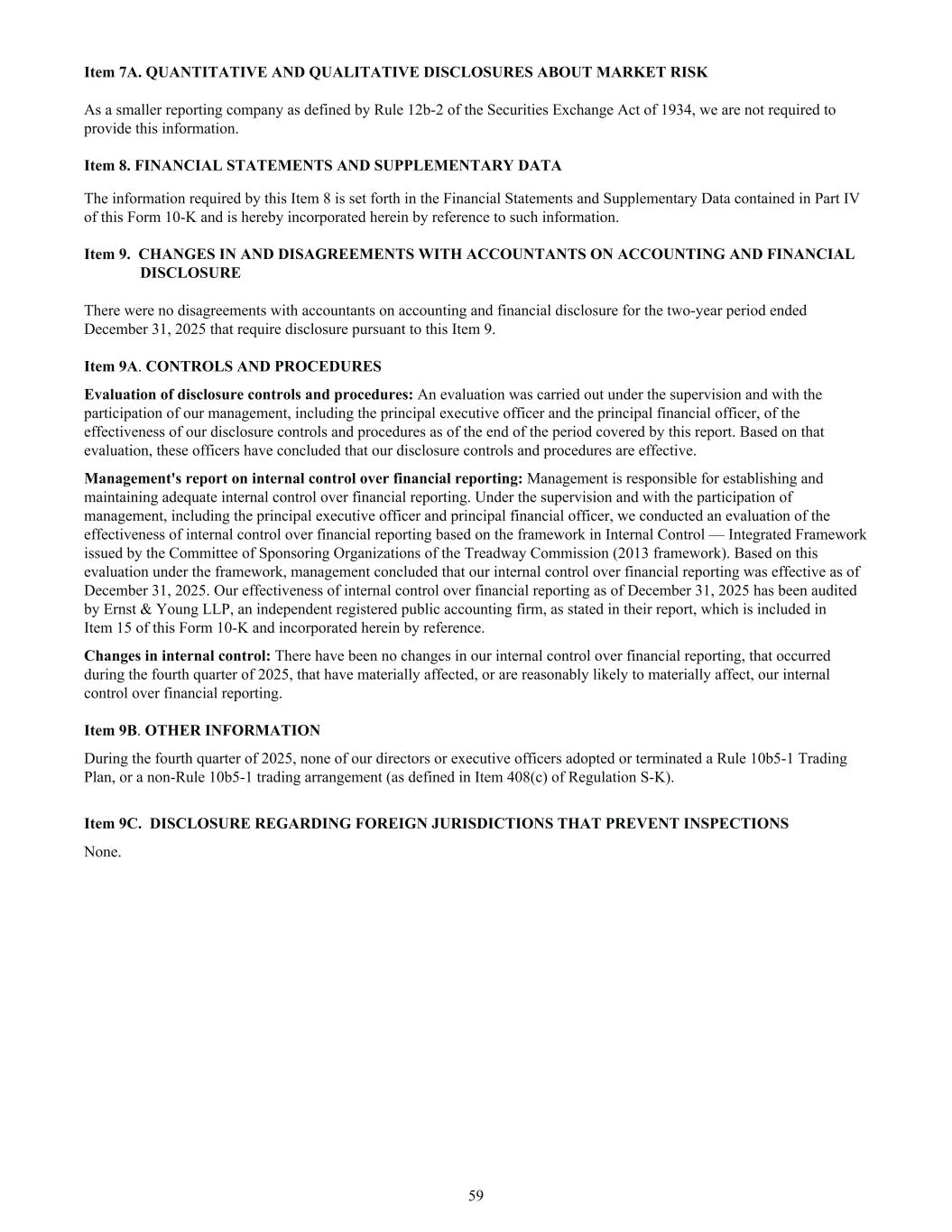 Item 7A. QUANTITATIVE AND QUALITATIVE DISCLOSURES ABOUT MARKET RISK As a smaller reporting company as defined by Rule 12b-2 of the Securities Exchange Act of 1934, we are not required to provide this information. Item 8. FINANCIAL STATEMENTS AND SUPPLEMENTARY DATA The information required by this Item 8 is set forth in the Financial Statements and Supplementary Data contained in Part IV of this Form 10-K and is hereby incorporated herein by reference to such information. Item 9. CHANGES IN AND DISAGREEMENTS WITH ACCOUNTANTS ON ACCOUNTING AND FINANCIAL DISCLOSURE There were no disagreements with accountants on accounting and financial disclosure for the two-year period ended December 31, 2025 that require disclosure pursuant to this Item 9. Item 9A. CONTROLS AND PROCEDURES Evaluation of disclosure controls and procedures: An evaluation was carried out under the supervision and with the participation of our management, including the principal executive officer and the principal financial officer, of the effectiveness of our disclosure controls and procedures as of the end of the period covered by this report. Based on that evaluation, these officers have concluded that our disclosure controls and procedures are effective. Management's report on internal control over financial reporting: Management is responsible for establishing and maintaining adequate internal control over financial reporting. Under the supervision and with the participation of management, including the principal executive officer and principal financial officer, we conducted an evaluation of the effectiveness of internal control over financial reporting based on the framework in Internal Control — Integrated Framework issued by the Committee of Sponsoring Organizations of the Treadway Commission (2013 framework). Based on this evaluation under the framework, management concluded that our internal control over financial reporting was effective as of December 31, 2025. Our effectiveness of internal control over financial reporting as of December 31, 2025 has been audited by Ernst & Young LLP, an independent registered public accounting firm, as stated in their report, which is included in Item 15 of this Form 10-K and incorporated herein by reference. Changes in internal control: There have been no changes in our internal control over financial reporting, that occurred during the fourth quarter of 2025, that have materially affected, or are reasonably likely to materially affect, our internal control over financial reporting. Item 9B. OTHER INFORMATION During the fourth quarter of 2025, none of our directors or executive officers adopted or terminated a Rule 10b5-1 Trading Plan, or a non-Rule 10b5-1 trading arrangement (as defined in Item 408(c) of Regulation S-K). Item 9C. DISCLOSURE REGARDING FOREIGN JURISDICTIONS THAT PREVENT INSPECTIONS None. 59