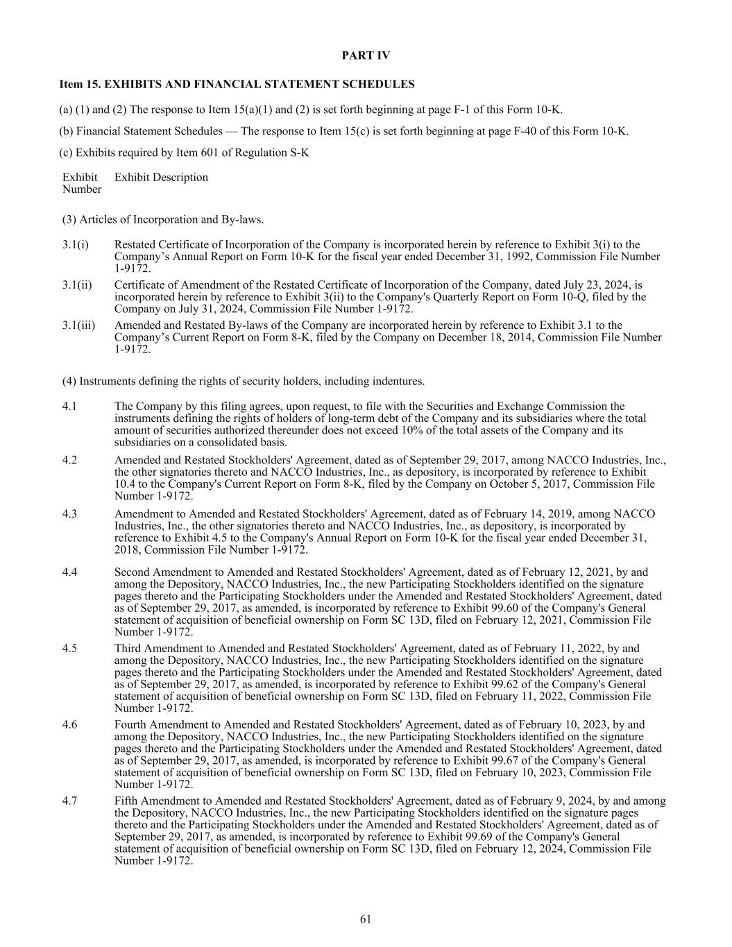 PART IV Item 15. EXHIBITS AND FINANCIAL STATEMENT SCHEDULES (a) (1) and (2) The response to Item 15(a)(1) and (2) is set forth beginning at page F-1 of this Form 10-K. (b) Financial Statement Schedules — The response to Item 15(c) is set forth beginning at page F-40 of this Form 10-K. (c) Exhibits required by Item 601 of Regulation S-K Exhibit Number Exhibit Description (3) Articles of Incorporation and By-laws. 3.1(i) Restated Certificate of Incorporation of the Company is incorporated herein by reference to Exhibit 3(i) to the Company’s Annual Report on Form 10-K for the fiscal year ended December 31, 1992, Commission File Number 1-9172. 3.1(ii) Certificate of Amendment of the Restated Certificate of Incorporation of the Company, dated July 23, 2024, is incorporated herein by reference to Exhibit 3(ii) to the Company's Quarterly Report on Form 10-Q, filed by the Company on July 31, 2024, Commission File Number 1-9172. 3.1(iii) Amended and Restated By-laws of the Company are incorporated herein by reference to Exhibit 3.1 to the Company’s Current Report on Form 8-K, filed by the Company on December 18, 2014, Commission File Number 1-9172. (4) Instruments defining the rights of security holders, including indentures. 4.1 The Company by this filing agrees, upon request, to file with the Securities and Exchange Commission the instruments defining the rights of holders of long-term debt of the Company and its subsidiaries where the total amount of securities authorized thereunder does not exceed 10% of the total assets of the Company and its subsidiaries on a consolidated basis. 4.2 Amended and Restated Stockholders' Agreement, dated as of September 29, 2017, among NACCO Industries, Inc., the other signatories thereto and NACCO Industries, Inc., as depository, is incorporated by reference to Exhibit 10.4 to the Company's Current Report on Form 8-K, filed by the Company on October 5, 2017, Commission File Number 1-9172. 4.3 Amendment to Amended and Restated Stockholders' Agreement, dated as of February 14, 2019, among NACCO Industries, Inc., the other signatories thereto and NACCO Industries, Inc., as depository, is incorporated by reference to Exhibit 4.5 to the Company's Annual Report on Form 10-K for the fiscal year ended December 31, 2018, Commission File Number 1-9172. 4.4 Second Amendment to Amended and Restated Stockholders' Agreement, dated as of February 12, 2021, by and among the Depository, NACCO Industries, Inc., the new Participating Stockholders identified on the signature pages thereto and the Participating Stockholders under the Amended and Restated Stockholders' Agreement, dated as of September 29, 2017, as amended, is incorporated by reference to Exhibit 99.60 of the Company's General statement of acquisition of beneficial ownership on Form SC 13D, filed on February 12, 2021, Commission File Number 1-9172. 4.5 Third Amendment to Amended and Restated Stockholders' Agreement, dated as of February 11, 2022, by and among the Depository, NACCO Industries, Inc., the new Participating Stockholders identified on the signature pages thereto and the Participating Stockholders under the Amended and Restated Stockholders' Agreement, dated as of September 29, 2017, as amended, is incorporated by reference to Exhibit 99.62 of the Company's General statement of acquisition of beneficial ownership on Form SC 13D, filed on February 11, 2022, Commission File Number 1-9172. 4.6 Fourth Amendment to Amended and Restated Stockholders' Agreement, dated as of February 10, 2023, by and among the Depository, NACCO Industries, Inc., the new Participating Stockholders identified on the signature pages thereto and the Participating Stockholders under the Amended and Restated Stockholders' Agreement, dated as of September 29, 2017, as amended, is incorporated by reference to Exhibit 99.67 of the Company's General statement of acquisition of beneficial ownership on Form SC 13D, filed on February 10, 2023, Commission File Number 1-9172. 4.7 Fifth Amendment to Amended and Restated Stockholders' Agreement, dated as of February 9, 2024, by and among the Depository, NACCO Industries, Inc., the new Participating Stockholders identified on the signature pages thereto and the Participating Stockholders under the Amended and Restated Stockholders' Agreement, dated as of September 29, 2017, as amended, is incorporated by reference to Exhibit 99.69 of the Company's General statement of acquisition of beneficial ownership on Form SC 13D, filed on February 12, 2024, Commission File Number 1-9172. 61