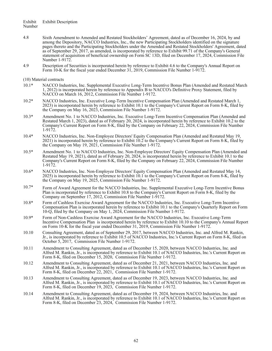 Exhibit Number Exhibit Description 4.8 Sixth Amendment to Amended and Restated Stockholders’ Agreement, dated as of December 16, 2024, by and among the Depository, NACCO Industries, Inc., the new Participating Stockholders identified on the signature pages thereto and the Participating Stockholders under the Amended and Restated Stockholders' Agreement, dated as of September 29, 2017, as amended, is incorporated by reference to Exhibit 99.71 of the Company's General statement of acquisition of beneficial ownership on Form SC 13D, filed on December 17, 2024, Commission File Number 1-9172. 4.9 Description of Securities is incorporated herein by reference to Exhibit 4.6 to the Company's Annual Report on Form 10-K for the fiscal year ended December 31, 2019, Commission File Number 1-9172. (10) Material contracts 10.1* NACCO Industries, Inc. Supplemental Executive Long-Term Incentive Bonus Plan (Amended and Restated March 1, 2012) is incorporated herein by reference to Appendix B to NACCO's Definitive Proxy Statement, filed by NACCO on March 16, 2012, Commission File Number 1-9172. 10.2* NACCO Industries, Inc. Executive Long-Term Incentive Compensation Plan (Amended and Restated March 1, 2023) is incorporated herein by reference to Exhibit 10.1 to the Company's Current Report on Form 8-K, filed by the Company on May 16, 2023, Commission File Number 1-9172. 10.3* Amendment No. 1 to NACCO Industries, Inc. Executive Long-Term Incentive Compensation Plan (Amended and Restated March 1, 2023), dated as of February 20, 2024, is incorporated herein by reference to Exhibit 10.2 to the Company's Current Report on Form 8-K, filed by the Company on February 22, 2024, Commission File Number 1-9172. 10.4* NACCO Industries, Inc. Non-Employee Directors' Equity Compensation Plan (Amended and Restated May 19, 2021) is incorporated herein by reference to Exhibit 10.2 to the Company's Current Report on Form 8-K, filed by the Company on May 19, 2021, Commission File Number 1-9172. 10.5* Amendment No. 1 to NACCO Industries, Inc. Non-Employee Directors' Equity Compensation Plan (Amended and Restated May 19, 2021), dated as of February 20, 2024, is incorporated herein by reference to Exhibit 10.1 to the Company's Current Report on Form 8-K, filed by the Company on February 22, 2024, Commission File Number 1-9172. 10.6* NACCO Industries, Inc. Non-Employee Directors' Equity Compensation Plan (Amended and Restated May 14, 2025) is incorporated herein by reference to Exhibit 10.1 to the Company's Current Report on Form 8-K, filed by the Company on May 19, 2025, Commission File Number 1-9172. 10.7* Form of Award Agreement for the NACCO Industries, Inc. Supplemental Executive Long-Term Incentive Bonus Plan is incorporated by reference to Exhibit 10.8 to the Company's Current Report on Form 8-K, filed by the Company on September 17, 2012, Commission File Number 1-9172. 10.8* Form of Cashless Exercise Award Agreement for the NACCO Industries, Inc. Executive Long-Term Incentive Compensation Plan is incorporated herein by reference to Exhibit 10.1 to the Company's Quarterly Report on Form 10-Q, filed by the Company on May 1, 2024, Commission File Number 1-9172. 10.9* Form of Non-Cashless Exercise Award Agreement for the NACCO Industries, Inc. Executive Long-Term Incentive Compensation Plan is incorporated herein by reference to Exhibit 10.10 to the Company's Annual Report on Form 10-K for the fiscal year ended December 31, 2019, Commission File Number 1-9172. 10.10 Consulting Agreement, dated as of September 29, 2017, between NACCO Industries, Inc. and Alfred M. Rankin, Jr., is incorporated by reference to Exhibit 10.5 of NACCO Industries, Inc.'s Current Report on Form 8-K, filed on October 5, 2017, Commission File Number 1-9172. 10.11 Amendment to Consulting Agreement, dated as of December 15, 2020, between NACCO Industries, Inc. and Alfred M. Rankin, Jr., is incorporated by reference to Exhibit 10.1 of NACCO Industries, Inc.'s Current Report on Form 8-K, filed on December 15, 2020, Commission File Number 1-9172. 10.12 Amendment to Consulting Agreement, dated as of December 21, 2021, between NACCO Industries, Inc. and Alfred M. Rankin, Jr., is incorporated by reference to Exhibit 10.1 of NACCO Industries, Inc.'s Current Report on Form 8-K, filed on December 22, 2021, Commission File Number 1-9172. 10.13 Amendment to Consulting Agreement, dated as of December 19, 2023, between NACCO Industries, Inc. and Alfred M. Rankin, Jr., is incorporated by reference to Exhibit 10.1 of NACCO Industries, Inc.'s Current Report on Form 8-K, filed on December 19, 2023, Commission File Number 1-9172. 10.14 Amendment to Consulting Agreement, dated as of December 19, 2024, between NACCO Industries, Inc. and Alfred M. Rankin, Jr., is incorporated by reference to Exhibit 10.1 of NACCO Industries, Inc.'s Current Report on Form 8-K, filed on December 23, 2024, Commission File Number 1-9172. 62