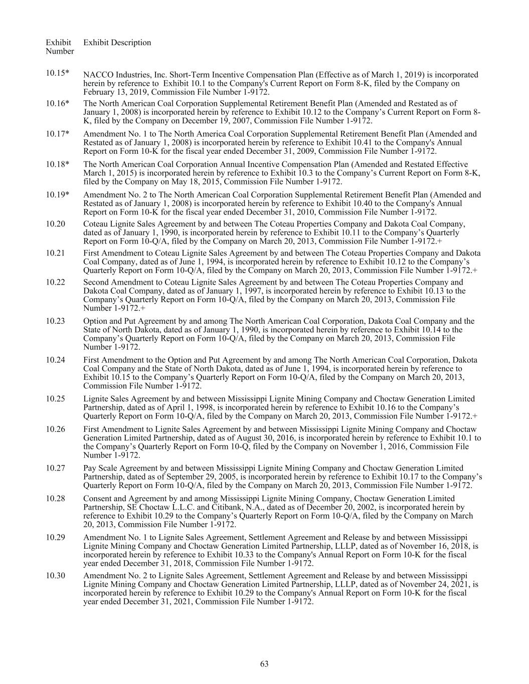 Exhibit Number Exhibit Description 10.15* NACCO Industries, Inc. Short-Term Incentive Compensation Plan (Effective as of March 1, 2019) is incorporated herein by reference to Exhibit 10.1 to the Company's Current Report on Form 8-K, filed by the Company on February 13, 2019, Commission File Number 1-9172. 10.16* The North American Coal Corporation Supplemental Retirement Benefit Plan (Amended and Restated as of January 1, 2008) is incorporated herein by reference to Exhibit 10.12 to the Company’s Current Report on Form 8- K, filed by the Company on December 19, 2007, Commission File Number 1-9172. 10.17* Amendment No. 1 to The North America Coal Corporation Supplemental Retirement Benefit Plan (Amended and Restated as of January 1, 2008) is incorporated herein by reference to Exhibit 10.41 to the Company's Annual Report on Form 10-K for the fiscal year ended December 31, 2009, Commission File Number 1-9172. 10.18* The North American Coal Corporation Annual Incentive Compensation Plan (Amended and Restated Effective March 1, 2015) is incorporated herein by reference to Exhibit 10.3 to the Company’s Current Report on Form 8-K, filed by the Company on May 18, 2015, Commission File Number 1-9172. 10.19* Amendment No. 2 to The North American Coal Corporation Supplemental Retirement Benefit Plan (Amended and Restated as of January 1, 2008) is incorporated herein by reference to Exhibit 10.40 to the Company's Annual Report on Form 10-K for the fiscal year ended December 31, 2010, Commission File Number 1-9172. 10.20 Coteau Lignite Sales Agreement by and between The Coteau Properties Company and Dakota Coal Company, dated as of January 1, 1990, is incorporated herein by reference to Exhibit 10.11 to the Company’s Quarterly Report on Form 10-Q/A, filed by the Company on March 20, 2013, Commission File Number 1-9172.+ 10.21 First Amendment to Coteau Lignite Sales Agreement by and between The Coteau Properties Company and Dakota Coal Company, dated as of June 1, 1994, is incorporated herein by reference to Exhibit 10.12 to the Company’s Quarterly Report on Form 10-Q/A, filed by the Company on March 20, 2013, Commission File Number 1-9172.+ 10.22 Second Amendment to Coteau Lignite Sales Agreement by and between The Coteau Properties Company and Dakota Coal Company, dated as of January 1, 1997, is incorporated herein by reference to Exhibit 10.13 to the Company’s Quarterly Report on Form 10-Q/A, filed by the Company on March 20, 2013, Commission File Number 1-9172.+ 10.23 Option and Put Agreement by and among The North American Coal Corporation, Dakota Coal Company and the State of North Dakota, dated as of January 1, 1990, is incorporated herein by reference to Exhibit 10.14 to the Company’s Quarterly Report on Form 10-Q/A, filed by the Company on March 20, 2013, Commission File Number 1-9172. 10.24 First Amendment to the Option and Put Agreement by and among The North American Coal Corporation, Dakota Coal Company and the State of North Dakota, dated as of June 1, 1994, is incorporated herein by reference to Exhibit 10.15 to the Company’s Quarterly Report on Form 10-Q/A, filed by the Company on March 20, 2013, Commission File Number 1-9172. 10.25 Lignite Sales Agreement by and between Mississippi Lignite Mining Company and Choctaw Generation Limited Partnership, dated as of April 1, 1998, is incorporated herein by reference to Exhibit 10.16 to the Company’s Quarterly Report on Form 10-Q/A, filed by the Company on March 20, 2013, Commission File Number 1-9172.+ 10.26 First Amendment to Lignite Sales Agreement by and between Mississippi Lignite Mining Company and Choctaw Generation Limited Partnership, dated as of August 30, 2016, is incorporated herein by reference to Exhibit 10.1 to the Company’s Quarterly Report on Form 10-Q, filed by the Company on November 1, 2016, Commission File Number 1-9172. 10.27 Pay Scale Agreement by and between Mississippi Lignite Mining Company and Choctaw Generation Limited Partnership, dated as of September 29, 2005, is incorporated herein by reference to Exhibit 10.17 to the Company’s Quarterly Report on Form 10-Q/A, filed by the Company on March 20, 2013, Commission File Number 1-9172. 10.28 Consent and Agreement by and among Mississippi Lignite Mining Company, Choctaw Generation Limited Partnership, SE Choctaw L.L.C. and Citibank, N.A., dated as of December 20, 2002, is incorporated herein by reference to Exhibit 10.29 to the Company’s Quarterly Report on Form 10-Q/A, filed by the Company on March 20, 2013, Commission File Number 1-9172. 10.29 Amendment No. 1 to Lignite Sales Agreement, Settlement Agreement and Release by and between Mississippi Lignite Mining Company and Choctaw Generation Limited Partnership, LLLP, dated as of November 16, 2018, is incorporated herein by reference to Exhibit 10.33 to the Company's Annual Report on Form 10-K for the fiscal year ended December 31, 2018, Commission File Number 1-9172. 10.30 Amendment No. 2 to Lignite Sales Agreement, Settlement Agreement and Release by and between Mississippi Lignite Mining Company and Choctaw Generation Limited Partnership, LLLP, dated as of November 24, 2021, is incorporated herein by reference to Exhibit 10.29 to the Company's Annual Report on Form 10-K for the fiscal year ended December 31, 2021, Commission File Number 1-9172. 63