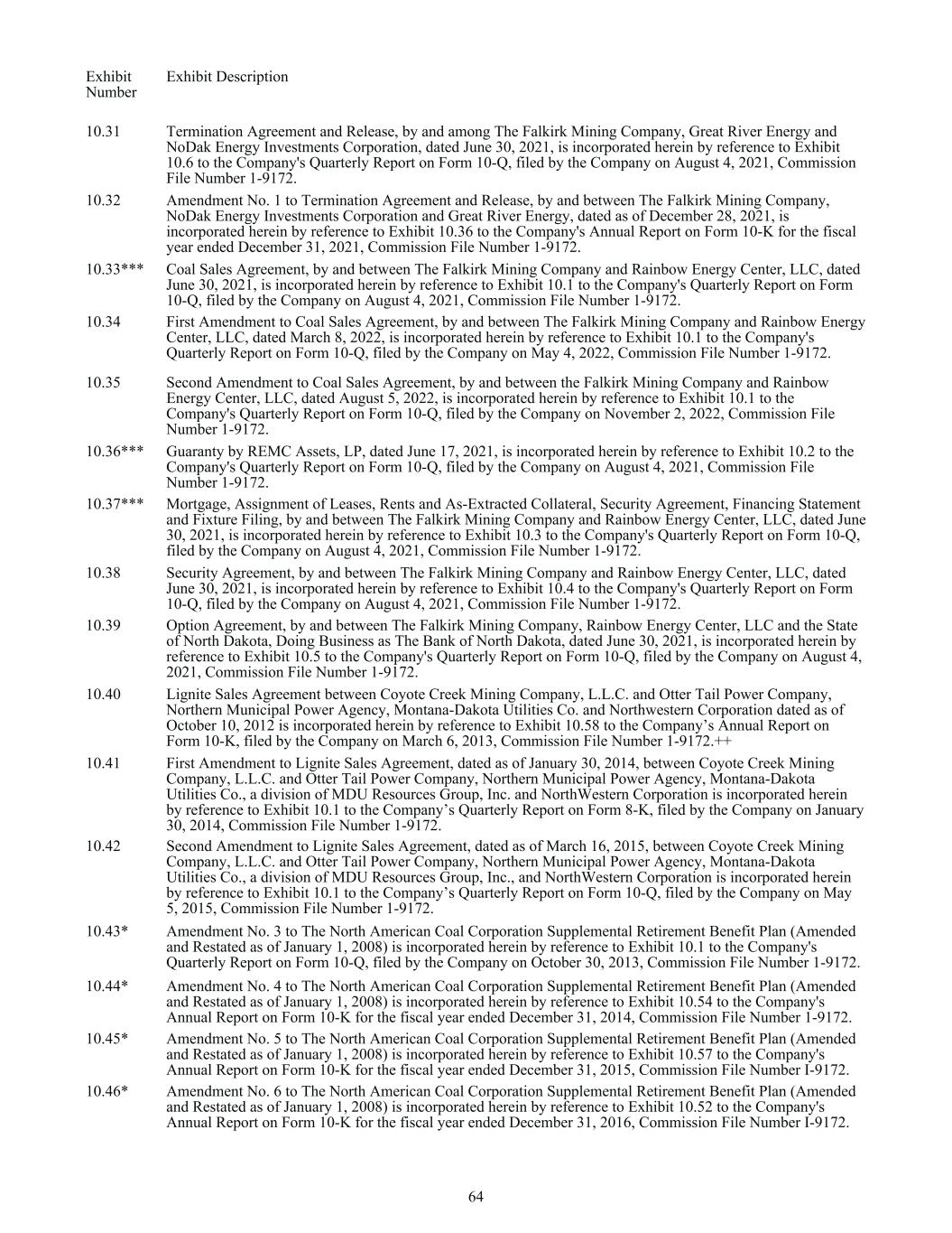 Exhibit Number Exhibit Description 10.31 Termination Agreement and Release, by and among The Falkirk Mining Company, Great River Energy and NoDak Energy Investments Corporation, dated June 30, 2021, is incorporated herein by reference to Exhibit 10.6 to the Company's Quarterly Report on Form 10-Q, filed by the Company on August 4, 2021, Commission File Number 1-9172. 10.32 Amendment No. 1 to Termination Agreement and Release, by and between The Falkirk Mining Company, NoDak Energy Investments Corporation and Great River Energy, dated as of December 28, 2021, is incorporated herein by reference to Exhibit 10.36 to the Company's Annual Report on Form 10-K for the fiscal year ended December 31, 2021, Commission File Number 1-9172. 10.33*** Coal Sales Agreement, by and between The Falkirk Mining Company and Rainbow Energy Center, LLC, dated June 30, 2021, is incorporated herein by reference to Exhibit 10.1 to the Company's Quarterly Report on Form 10-Q, filed by the Company on August 4, 2021, Commission File Number 1-9172. 10.34 First Amendment to Coal Sales Agreement, by and between The Falkirk Mining Company and Rainbow Energy Center, LLC, dated March 8, 2022, is incorporated herein by reference to Exhibit 10.1 to the Company's Quarterly Report on Form 10-Q, filed by the Company on May 4, 2022, Commission File Number 1-9172. 10.35 Second Amendment to Coal Sales Agreement, by and between the Falkirk Mining Company and Rainbow Energy Center, LLC, dated August 5, 2022, is incorporated herein by reference to Exhibit 10.1 to the Company's Quarterly Report on Form 10-Q, filed by the Company on November 2, 2022, Commission File Number 1-9172. 10.36*** Guaranty by REMC Assets, LP, dated June 17, 2021, is incorporated herein by reference to Exhibit 10.2 to the Company's Quarterly Report on Form 10-Q, filed by the Company on August 4, 2021, Commission File Number 1-9172. 10.37*** Mortgage, Assignment of Leases, Rents and As-Extracted Collateral, Security Agreement, Financing Statement and Fixture Filing, by and between The Falkirk Mining Company and Rainbow Energy Center, LLC, dated June 30, 2021, is incorporated herein by reference to Exhibit 10.3 to the Company's Quarterly Report on Form 10-Q, filed by the Company on August 4, 2021, Commission File Number 1-9172. 10.38 Security Agreement, by and between The Falkirk Mining Company and Rainbow Energy Center, LLC, dated June 30, 2021, is incorporated herein by reference to Exhibit 10.4 to the Company's Quarterly Report on Form 10-Q, filed by the Company on August 4, 2021, Commission File Number 1-9172. 10.39 Option Agreement, by and between The Falkirk Mining Company, Rainbow Energy Center, LLC and the State of North Dakota, Doing Business as The Bank of North Dakota, dated June 30, 2021, is incorporated herein by reference to Exhibit 10.5 to the Company's Quarterly Report on Form 10-Q, filed by the Company on August 4, 2021, Commission File Number 1-9172. 10.40 Lignite Sales Agreement between Coyote Creek Mining Company, L.L.C. and Otter Tail Power Company, Northern Municipal Power Agency, Montana-Dakota Utilities Co. and Northwestern Corporation dated as of October 10, 2012 is incorporated herein by reference to Exhibit 10.58 to the Company’s Annual Report on Form 10-K, filed by the Company on March 6, 2013, Commission File Number 1-9172.++ 10.41 First Amendment to Lignite Sales Agreement, dated as of January 30, 2014, between Coyote Creek Mining Company, L.L.C. and Otter Tail Power Company, Northern Municipal Power Agency, Montana-Dakota Utilities Co., a division of MDU Resources Group, Inc. and NorthWestern Corporation is incorporated herein by reference to Exhibit 10.1 to the Company’s Quarterly Report on Form 8-K, filed by the Company on January 30, 2014, Commission File Number 1-9172. 10.42 Second Amendment to Lignite Sales Agreement, dated as of March 16, 2015, between Coyote Creek Mining Company, L.L.C. and Otter Tail Power Company, Northern Municipal Power Agency, Montana-Dakota Utilities Co., a division of MDU Resources Group, Inc., and NorthWestern Corporation is incorporated herein by reference to Exhibit 10.1 to the Company’s Quarterly Report on Form 10-Q, filed by the Company on May 5, 2015, Commission File Number 1-9172. 10.43* Amendment No. 3 to The North American Coal Corporation Supplemental Retirement Benefit Plan (Amended and Restated as of January 1, 2008) is incorporated herein by reference to Exhibit 10.1 to the Company's Quarterly Report on Form 10-Q, filed by the Company on October 30, 2013, Commission File Number 1-9172. 10.44* Amendment No. 4 to The North American Coal Corporation Supplemental Retirement Benefit Plan (Amended and Restated as of January 1, 2008) is incorporated herein by reference to Exhibit 10.54 to the Company's Annual Report on Form 10-K for the fiscal year ended December 31, 2014, Commission File Number 1-9172. 10.45* Amendment No. 5 to The North American Coal Corporation Supplemental Retirement Benefit Plan (Amended and Restated as of January 1, 2008) is incorporated herein by reference to Exhibit 10.57 to the Company's Annual Report on Form 10-K for the fiscal year ended December 31, 2015, Commission File Number I-9172. 10.46* Amendment No. 6 to The North American Coal Corporation Supplemental Retirement Benefit Plan (Amended and Restated as of January 1, 2008) is incorporated herein by reference to Exhibit 10.52 to the Company's Annual Report on Form 10-K for the fiscal year ended December 31, 2016, Commission File Number I-9172. 64