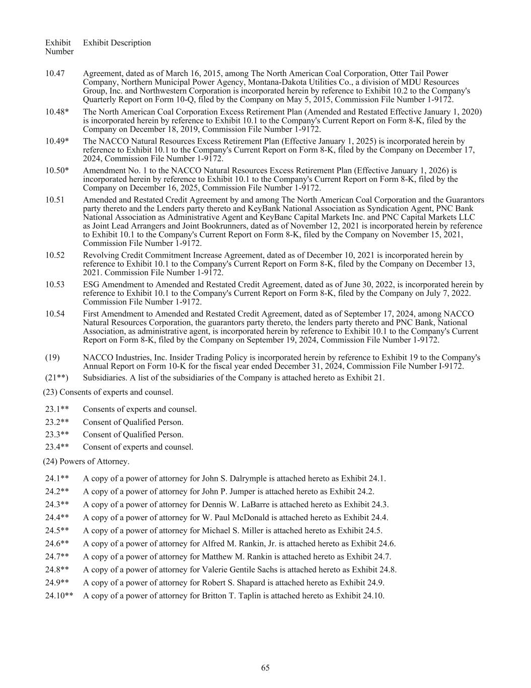 Exhibit Number Exhibit Description 10.47 Agreement, dated as of March 16, 2015, among The North American Coal Corporation, Otter Tail Power Company, Northern Municipal Power Agency, Montana-Dakota Utilities Co., a division of MDU Resources Group, Inc. and Northwestern Corporation is incorporated herein by reference to Exhibit 10.2 to the Company's Quarterly Report on Form 10-Q, filed by the Company on May 5, 2015, Commission File Number 1-9172. 10.48* The North American Coal Corporation Excess Retirement Plan (Amended and Restated Effective January 1, 2020) is incorporated herein by reference to Exhibit 10.1 to the Company's Current Report on Form 8-K, filed by the Company on December 18, 2019, Commission File Number 1-9172. 10.49* The NACCO Natural Resources Excess Retirement Plan (Effective January 1, 2025) is incorporated herein by reference to Exhibit 10.1 to the Company's Current Report on Form 8-K, filed by the Company on December 17, 2024, Commission File Number 1-9172. 10.50* Amendment No. 1 to the NACCO Natural Resources Excess Retirement Plan (Effective January 1, 2026) is incorporated herein by reference to Exhibit 10.1 to the Company's Current Report on Form 8-K, filed by the Company on December 16, 2025, Commission File Number 1-9172. 10.51 Amended and Restated Credit Agreement by and among The North American Coal Corporation and the Guarantors party thereto and the Lenders party thereto and KeyBank National Association as Syndication Agent, PNC Bank National Association as Administrative Agent and KeyBanc Capital Markets Inc. and PNC Capital Markets LLC as Joint Lead Arrangers and Joint Bookrunners, dated as of November 12, 2021 is incorporated herein by reference to Exhibit 10.1 to the Company's Current Report on Form 8-K, filed by the Company on November 15, 2021, Commission File Number 1-9172. 10.52 Revolving Credit Commitment Increase Agreement, dated as of December 10, 2021 is incorporated herein by reference to Exhibit 10.1 to the Company's Current Report on Form 8-K, filed by the Company on December 13, 2021. Commission File Number 1-9172. 10.53 ESG Amendment to Amended and Restated Credit Agreement, dated as of June 30, 2022, is incorporated herein by reference to Exhibit 10.1 to the Company's Current Report on Form 8-K, filed by the Company on July 7, 2022. Commission File Number 1-9172. 10.54 First Amendment to Amended and Restated Credit Agreement, dated as of September 17, 2024, among NACCO Natural Resources Corporation, the guarantors party thereto, the lenders party thereto and PNC Bank, National Association, as administrative agent, is incorporated herein by reference to Exhibit 10.1 to the Company's Current Report on Form 8-K, filed by the Company on September 19, 2024, Commission File Number 1-9172. (19) NACCO Industries, Inc. Insider Trading Policy is incorporated herein by reference to Exhibit 19 to the Company's Annual Report on Form 10-K for the fiscal year ended December 31, 2024, Commission File Number I-9172. (21**) Subsidiaries. A list of the subsidiaries of the Company is attached hereto as Exhibit 21. (23) Consents of experts and counsel. 23.1** Consents of experts and counsel. 23.2** Consent of Qualified Person. 23.3** Consent of Qualified Person. 23.4** Consent of experts and counsel. (24) Powers of Attorney. 24.1** A copy of a power of attorney for John S. Dalrymple is attached hereto as Exhibit 24.1. 24.2** A copy of a power of attorney for John P. Jumper is attached hereto as Exhibit 24.2. 24.3** A copy of a power of attorney for Dennis W. LaBarre is attached hereto as Exhibit 24.3. 24.4** A copy of a power of attorney for W. Paul McDonald is attached hereto as Exhibit 24.4. 24.5** A copy of a power of attorney for Michael S. Miller is attached hereto as Exhibit 24.5. 24.6** A copy of a power of attorney for Alfred M. Rankin, Jr. is attached hereto as Exhibit 24.6. 24.7** A copy of a power of attorney for Matthew M. Rankin is attached hereto as Exhibit 24.7. 24.8** A copy of a power of attorney for Valerie Gentile Sachs is attached hereto as Exhibit 24.8. 24.9** A copy of a power of attorney for Robert S. Shapard is attached hereto as Exhibit 24.9. 24.10** A copy of a power of attorney for Britton T. Taplin is attached hereto as Exhibit 24.10. 65