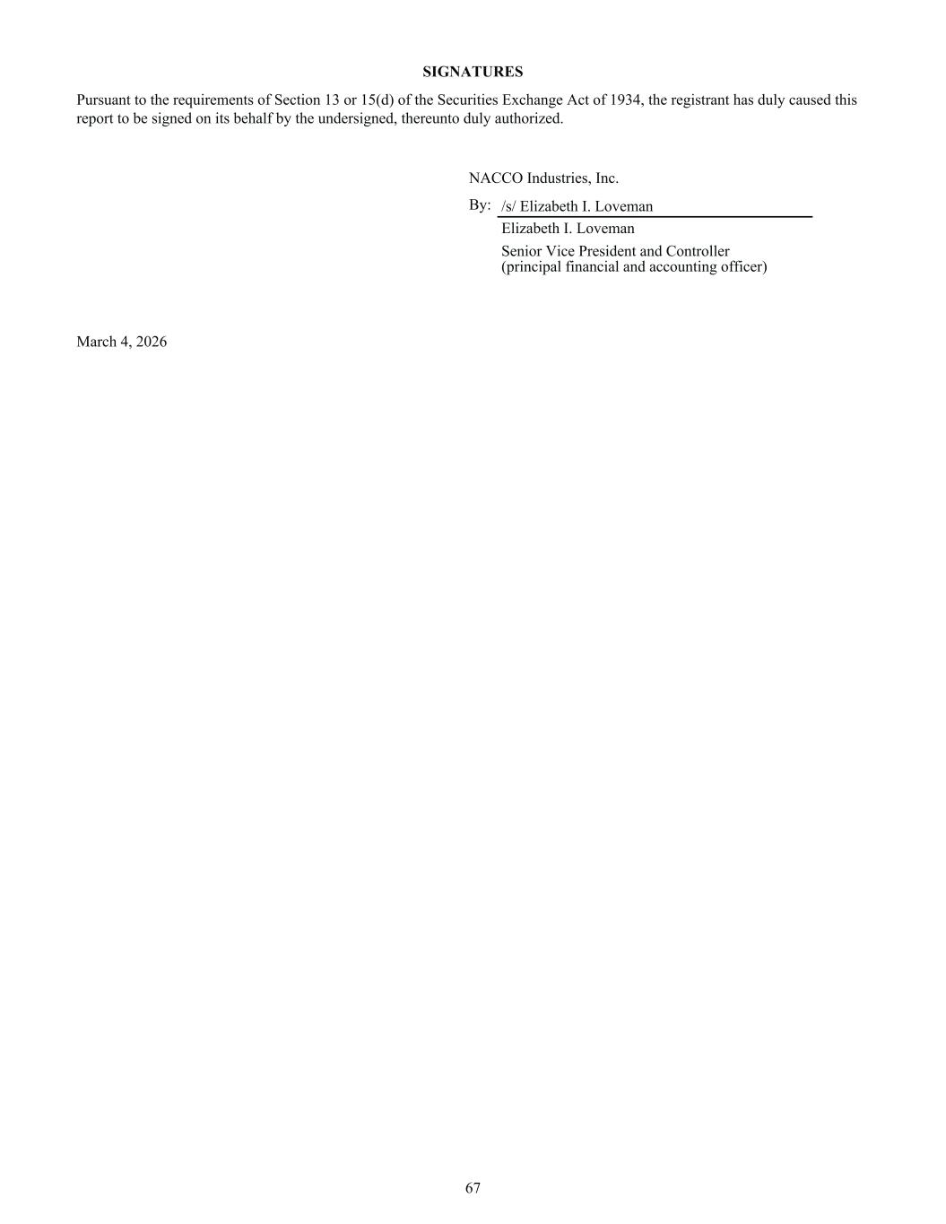 SIGNATURES Pursuant to the requirements of Section 13 or 15(d) of the Securities Exchange Act of 1934, the registrant has duly caused this report to be signed on its behalf by the undersigned, thereunto duly authorized. NACCO Industries, Inc. By: /s/ Elizabeth I. Loveman Elizabeth I. Loveman Senior Vice President and Controller (principal financial and accounting officer) March 4, 2026 67