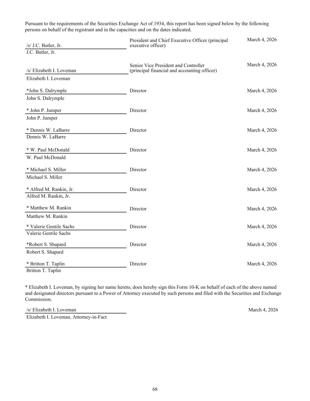 Pursuant to the requirements of the Securities Exchange Act of 1934, this report has been signed below by the following persons on behalf of the registrant and in the capacities and on the dates indicated. /s/ J.C. Butler, Jr. President and Chief Executive Officer (principal executive officer) March 4, 2026 J.C. Butler, Jr. /s/ Elizabeth I. Loveman Senior Vice President and Controller (principal financial and accounting officer) March 4, 2026 Elizabeth I. Loveman *John S. Dalrymple Director March 4, 2026 John S. Dalrymple * John P. Jumper Director March 4, 2026 John P. Jumper * Dennis W. LaBarre Director March 4, 2026 Dennis W. LaBarre * W. Paul McDonald Director March 4, 2026 W. Paul McDonald * Michael S. Miller Director March 4, 2026 Michael S. Miller * Alfred M. Rankin, Jr. Director March 4, 2026 Alfred M. Rankin, Jr. * Matthew M. Rankin Director March 4, 2026 Matthew M. Rankin * Valerie Gentile Sachs Director March 4, 2026 Valerie Gentile Sachs *Robert S. Shapard Director March 4, 2026 Robert S. Shapard * Britton T. Taplin Director March 4, 2026 Britton T. Taplin * Elizabeth I. Loveman, by signing her name hereto, does hereby sign this Form 10-K on behalf of each of the above named and designated directors pursuant to a Power of Attorney executed by such persons and filed with the Securities and Exchange Commission. /s/ Elizabeth I. Loveman March 4, 2026 Elizabeth I. Loveman, Attorney-in-Fact 68