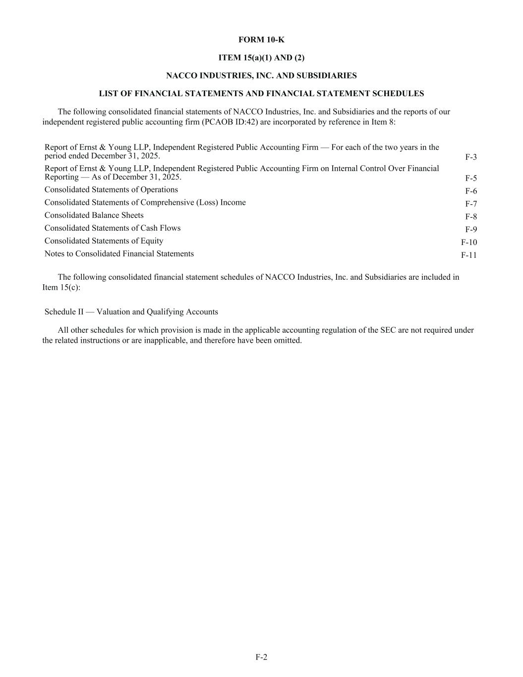 FORM 10-K ITEM 15(a)(1) AND (2) NACCO INDUSTRIES, INC. AND SUBSIDIARIES LIST OF FINANCIAL STATEMENTS AND FINANCIAL STATEMENT SCHEDULES The following consolidated financial statements of NACCO Industries, Inc. and Subsidiaries and the reports of our independent registered public accounting firm (PCAOB ID:42) are incorporated by reference in Item 8: Report of Ernst & Young LLP, Independent Registered Public Accounting Firm — For each of the two years in the period ended December 31, 2025. F-3 Report of Ernst & Young LLP, Independent Registered Public Accounting Firm on Internal Control Over Financial Reporting — As of December 31, 2025. F-5 Consolidated Statements of Operations F-6 Consolidated Statements of Comprehensive (Loss) Income F-7 Consolidated Balance Sheets F-8 Consolidated Statements of Cash Flows F-9 Consolidated Statements of Equity F-10 Notes to Consolidated Financial Statements F-11 The following consolidated financial statement schedules of NACCO Industries, Inc. and Subsidiaries are included in Item 15(c): Schedule II — Valuation and Qualifying Accounts All other schedules for which provision is made in the applicable accounting regulation of the SEC are not required under the related instructions or are inapplicable, and therefore have been omitted. F-2