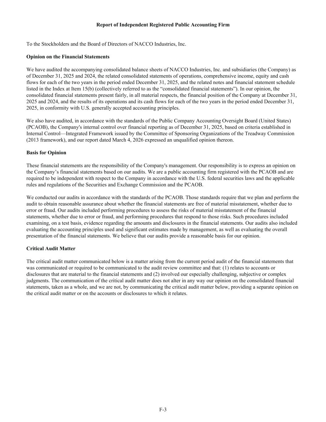 Report of Independent Registered Public Accounting Firm To the Stockholders and the Board of Directors of NACCO Industries, Inc. Opinion on the Financial Statements We have audited the accompanying consolidated balance sheets of NACCO Industries, Inc. and subsidiaries (the Company) as of December 31, 2025 and 2024, the related consolidated statements of operations, comprehensive income, equity and cash flows for each of the two years in the period ended December 31, 2025, and the related notes and financial statement schedule listed in the Index at Item 15(b) (collectively referred to as the “consolidated financial statements”). In our opinion, the consolidated financial statements present fairly, in all material respects, the financial position of the Company at December 31, 2025 and 2024, and the results of its operations and its cash flows for each of the two years in the period ended December 31, 2025, in conformity with U.S. generally accepted accounting principles. We also have audited, in accordance with the standards of the Public Company Accounting Oversight Board (United States) (PCAOB), the Company's internal control over financial reporting as of December 31, 2025, based on criteria established in Internal Control—Integrated Framework issued by the Committee of Sponsoring Organizations of the Treadway Commission (2013 framework), and our report dated March 4, 2026 expressed an unqualified opinion thereon. Basis for Opinion These financial statements are the responsibility of the Company's management. Our responsibility is to express an opinion on the Company’s financial statements based on our audits. We are a public accounting firm registered with the PCAOB and are required to be independent with respect to the Company in accordance with the U.S. federal securities laws and the applicable rules and regulations of the Securities and Exchange Commission and the PCAOB. We conducted our audits in accordance with the standards of the PCAOB. Those standards require that we plan and perform the audit to obtain reasonable assurance about whether the financial statements are free of material misstatement, whether due to error or fraud. Our audits included performing procedures to assess the risks of material misstatement of the financial statements, whether due to error or fraud, and performing procedures that respond to those risks. Such procedures included examining, on a test basis, evidence regarding the amounts and disclosures in the financial statements. Our audits also included evaluating the accounting principles used and significant estimates made by management, as well as evaluating the overall presentation of the financial statements. We believe that our audits provide a reasonable basis for our opinion. Critical Audit Matter The critical audit matter communicated below is a matter arising from the current period audit of the financial statements that was communicated or required to be communicated to the audit review committee and that: (1) relates to accounts or disclosures that are material to the financial statements and (2) involved our especially challenging, subjective or complex judgments. The communication of the critical audit matter does not alter in any way our opinion on the consolidated financial statements, taken as a whole, and we are not, by communicating the critical audit matter below, providing a separate opinion on the critical audit matter or on the accounts or disclosures to which it relates. F-3
