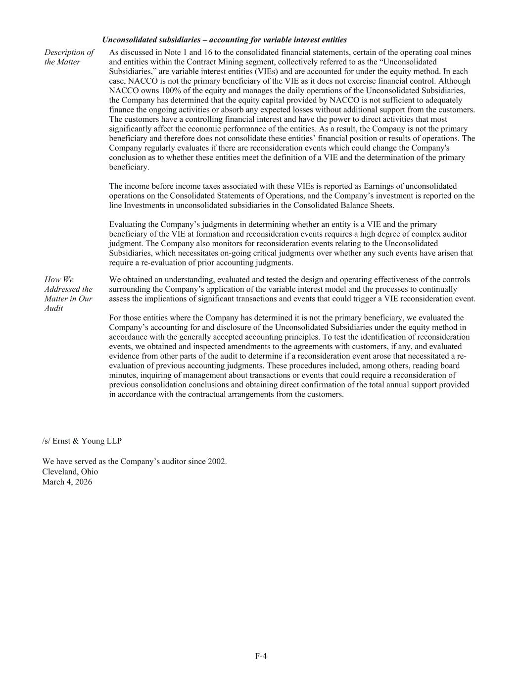 Unconsolidated subsidiaries – accounting for variable interest entities Description of the Matter As discussed in Note 1 and 16 to the consolidated financial statements, certain of the operating coal mines and entities within the Contract Mining segment, collectively referred to as the “Unconsolidated Subsidiaries,” are variable interest entities (VIEs) and are accounted for under the equity method. In each case, NACCO is not the primary beneficiary of the VIE as it does not exercise financial control. Although NACCO owns 100% of the equity and manages the daily operations of the Unconsolidated Subsidiaries, the Company has determined that the equity capital provided by NACCO is not sufficient to adequately finance the ongoing activities or absorb any expected losses without additional support from the customers. The customers have a controlling financial interest and have the power to direct activities that most significantly affect the economic performance of the entities. As a result, the Company is not the primary beneficiary and therefore does not consolidate these entities’ financial position or results of operations. The Company regularly evaluates if there are reconsideration events which could change the Company's conclusion as to whether these entities meet the definition of a VIE and the determination of the primary beneficiary. The income before income taxes associated with these VIEs is reported as Earnings of unconsolidated operations on the Consolidated Statements of Operations, and the Company’s investment is reported on the line Investments in unconsolidated subsidiaries in the Consolidated Balance Sheets. Evaluating the Company’s judgments in determining whether an entity is a VIE and the primary beneficiary of the VIE at formation and reconsideration events requires a high degree of complex auditor judgment. The Company also monitors for reconsideration events relating to the Unconsolidated Subsidiaries, which necessitates on-going critical judgments over whether any such events have arisen that require a re-evaluation of prior accounting judgments. How We Addressed the Matter in Our Audit We obtained an understanding, evaluated and tested the design and operating effectiveness of the controls surrounding the Company’s application of the variable interest model and the processes to continually assess the implications of significant transactions and events that could trigger a VIE reconsideration event. For those entities where the Company has determined it is not the primary beneficiary, we evaluated the Company’s accounting for and disclosure of the Unconsolidated Subsidiaries under the equity method in accordance with the generally accepted accounting principles. To test the identification of reconsideration events, we obtained and inspected amendments to the agreements with customers, if any, and evaluated evidence from other parts of the audit to determine if a reconsideration event arose that necessitated a re- evaluation of previous accounting judgments. These procedures included, among others, reading board minutes, inquiring of management about transactions or events that could require a reconsideration of previous consolidation conclusions and obtaining direct confirmation of the total annual support provided in accordance with the contractual arrangements from the customers. /s/ Ernst & Young LLP We have served as the Company’s auditor since 2002. Cleveland, Ohio March 4, 2026 F-4