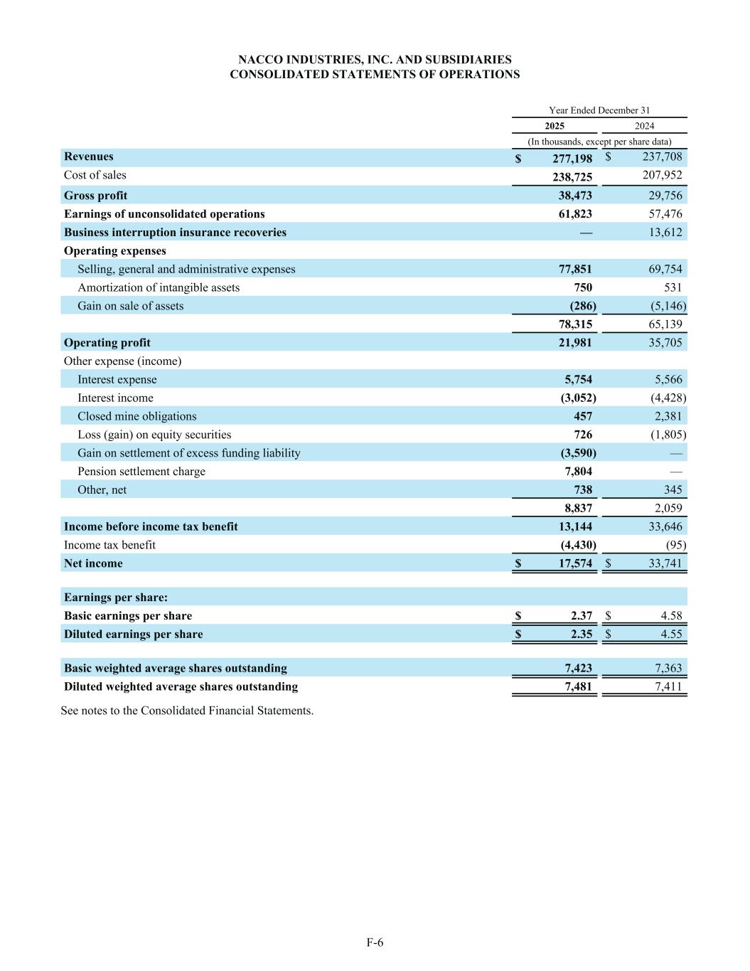 NACCO INDUSTRIES, INC. AND SUBSIDIARIES CONSOLIDATED STATEMENTS OF OPERATIONS Year Ended December 31 2025 2024 (In thousands, except per share data) Revenues $ 277,198 $ 237,708 Cost of sales 238,725 207,952 Gross profit 38,473 29,756 Earnings of unconsolidated operations 61,823 57,476 Business interruption insurance recoveries — 13,612 Operating expenses Selling, general and administrative expenses 77,851 69,754 Amortization of intangible assets 750 531 Gain on sale of assets (286) (5,146) 78,315 65,139 Operating profit 21,981 35,705 Other expense (income) Interest expense 5,754 5,566 Interest income (3,052) (4,428) Closed mine obligations 457 2,381 Loss (gain) on equity securities 726 (1,805) Gain on settlement of excess funding liability (3,590) — Pension settlement charge 7,804 — Other, net 738 345 8,837 2,059 Income before income tax benefit 13,144 33,646 Income tax benefit (4,430) (95) Net income $ 17,574 $ 33,741 Earnings per share: Basic earnings per share $ 2.37 $ 4.58 Diluted earnings per share $ 2.35 $ 4.55 Basic weighted average shares outstanding 7,423 7,363 Diluted weighted average shares outstanding 7,481 7,411 See notes to the Consolidated Financial Statements. F-6
