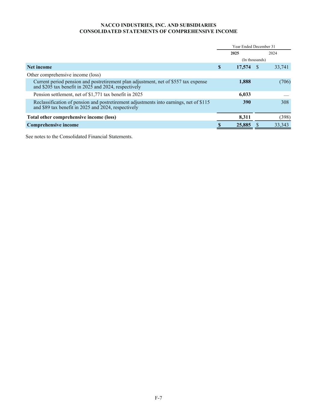 NACCO INDUSTRIES, INC. AND SUBSIDIARIES CONSOLIDATED STATEMENTS OF COMPREHENSIVE INCOME Year Ended December 31 2025 2024 (In thousands) Net income $ 17,574 $ 33,741 Other comprehensive income (loss) Current period pension and postretirement plan adjustment, net of $557 tax expense and $205 tax benefit in 2025 and 2024, respectively 1,888 (706) Pension settlement, net of $1,771 tax benefit in 2025 6,033 — Reclassification of pension and postretirement adjustments into earnings, net of $115 and $89 tax benefit in 2025 and 2024, respectively 390 308 Total other comprehensive income (loss) 8,311 (398) Comprehensive income $ 25,885 $ 33,343 See notes to the Consolidated Financial Statements. F-7