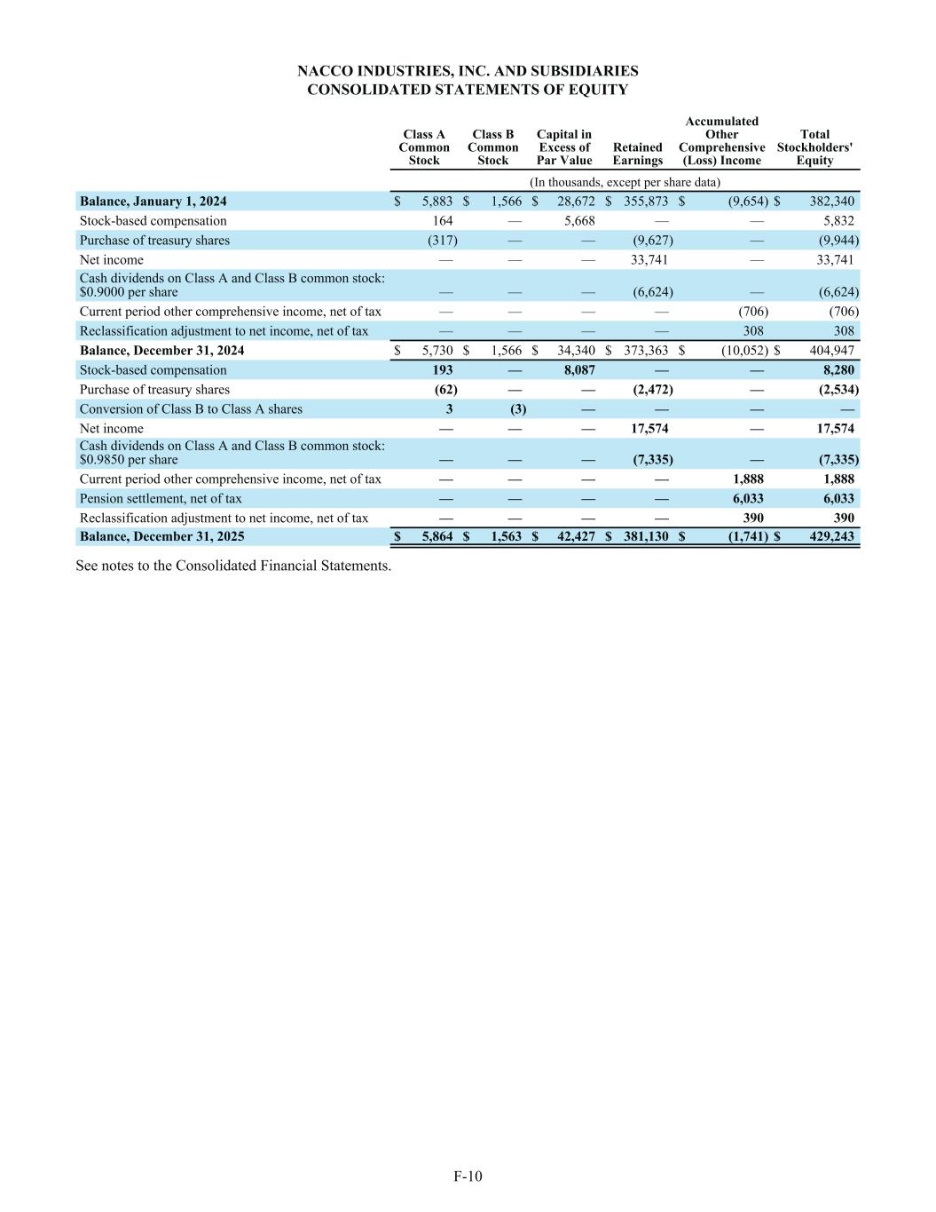 NACCO INDUSTRIES, INC. AND SUBSIDIARIES CONSOLIDATED STATEMENTS OF EQUITY Class A Common Stock Class B Common Stock Capital in Excess of Par Value Retained Earnings Accumulated Other Comprehensive (Loss) Income Total Stockholders' Equity (In thousands, except per share data) Balance, January 1, 2024 $ 5,883 $ 1,566 $ 28,672 $ 355,873 $ (9,654) $ 382,340 Stock-based compensation 164 — 5,668 — — 5,832 Purchase of treasury shares (317) — — (9,627) — (9,944) Net income — — — 33,741 — 33,741 Cash dividends on Class A and Class B common stock: $0.9000 per share — — — (6,624) — (6,624) Current period other comprehensive income, net of tax — — — — (706) (706) Reclassification adjustment to net income, net of tax — — — — 308 308 Balance, December 31, 2024 $ 5,730 $ 1,566 $ 34,340 $ 373,363 $ (10,052) $ 404,947 Stock-based compensation 193 — 8,087 — — 8,280 Purchase of treasury shares (62) — — (2,472) — (2,534) Conversion of Class B to Class A shares 3 (3) — — — — Net income — — — 17,574 — 17,574 Cash dividends on Class A and Class B common stock: $0.9850 per share — — — (7,335) — (7,335) Current period other comprehensive income, net of tax — — — — 1,888 1,888 Pension settlement, net of tax — — — — 6,033 6,033 Reclassification adjustment to net income, net of tax — — — — 390 390 Balance, December 31, 2025 $ 5,864 $ 1,563 $ 42,427 $ 381,130 $ (1,741) $ 429,243 See notes to the Consolidated Financial Statements. F-10