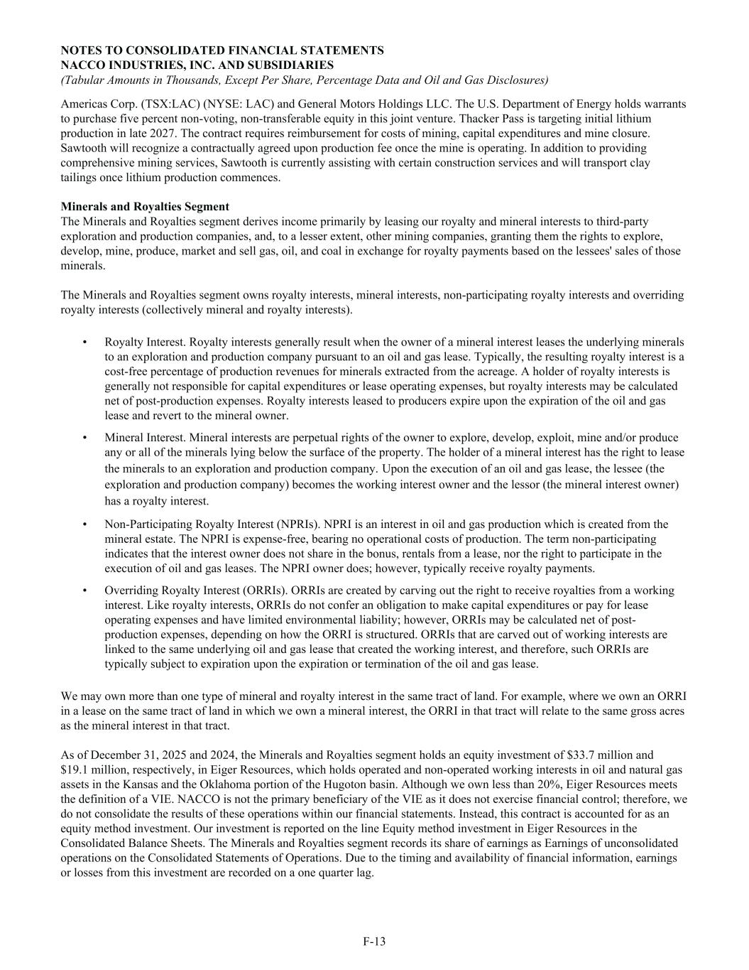 Americas Corp. (TSX:LAC) (NYSE: LAC) and General Motors Holdings LLC. The U.S. Department of Energy holds warrants to purchase five percent non-voting, non-transferable equity in this joint venture. Thacker Pass is targeting initial lithium production in late 2027. The contract requires reimbursement for costs of mining, capital expenditures and mine closure. Sawtooth will recognize a contractually agreed upon production fee once the mine is operating. In addition to providing comprehensive mining services, Sawtooth is currently assisting with certain construction services and will transport clay tailings once lithium production commences. Minerals and Royalties Segment The Minerals and Royalties segment derives income primarily by leasing our royalty and mineral interests to third-party exploration and production companies, and, to a lesser extent, other mining companies, granting them the rights to explore, develop, mine, produce, market and sell gas, oil, and coal in exchange for royalty payments based on the lessees' sales of those minerals. The Minerals and Royalties segment owns royalty interests, mineral interests, non-participating royalty interests and overriding royalty interests (collectively mineral and royalty interests). • Royalty Interest. Royalty interests generally result when the owner of a mineral interest leases the underlying minerals to an exploration and production company pursuant to an oil and gas lease. Typically, the resulting royalty interest is a cost-free percentage of production revenues for minerals extracted from the acreage. A holder of royalty interests is generally not responsible for capital expenditures or lease operating expenses, but royalty interests may be calculated net of post-production expenses. Royalty interests leased to producers expire upon the expiration of the oil and gas lease and revert to the mineral owner. • Mineral Interest. Mineral interests are perpetual rights of the owner to explore, develop, exploit, mine and/or produce any or all of the minerals lying below the surface of the property. The holder of a mineral interest has the right to lease the minerals to an exploration and production company. Upon the execution of an oil and gas lease, the lessee (the exploration and production company) becomes the working interest owner and the lessor (the mineral interest owner) has a royalty interest. • Non-Participating Royalty Interest (NPRIs). NPRI is an interest in oil and gas production which is created from the mineral estate. The NPRI is expense-free, bearing no operational costs of production. The term non-participating indicates that the interest owner does not share in the bonus, rentals from a lease, nor the right to participate in the execution of oil and gas leases. The NPRI owner does; however, typically receive royalty payments. • Overriding Royalty Interest (ORRIs). ORRIs are created by carving out the right to receive royalties from a working interest. Like royalty interests, ORRIs do not confer an obligation to make capital expenditures or pay for lease operating expenses and have limited environmental liability; however, ORRIs may be calculated net of post- production expenses, depending on how the ORRI is structured. ORRIs that are carved out of working interests are linked to the same underlying oil and gas lease that created the working interest, and therefore, such ORRIs are typically subject to expiration upon the expiration or termination of the oil and gas lease. We may own more than one type of mineral and royalty interest in the same tract of land. For example, where we own an ORRI in a lease on the same tract of land in which we own a mineral interest, the ORRI in that tract will relate to the same gross acres as the mineral interest in that tract. As of December 31, 2025 and 2024, the Minerals and Royalties segment holds an equity investment of $33.7 million and $19.1 million, respectively, in Eiger Resources, which holds operated and non-operated working interests in oil and natural gas assets in the Kansas and the Oklahoma portion of the Hugoton basin. Although we own less than 20%, Eiger Resources meets the definition of a VIE. NACCO is not the primary beneficiary of the VIE as it does not exercise financial control; therefore, we do not consolidate the results of these operations within our financial statements. Instead, this contract is accounted for as an equity method investment. Our investment is reported on the line Equity method investment in Eiger Resources in the Consolidated Balance Sheets. The Minerals and Royalties segment records its share of earnings as Earnings of unconsolidated operations on the Consolidated Statements of Operations. Due to the timing and availability of financial information, earnings or losses from this investment are recorded on a one quarter lag. NOTES TO CONSOLIDATED FINANCIAL STATEMENTS NACCO INDUSTRIES, INC. AND SUBSIDIARIES (Tabular Amounts in Thousands, Except Per Share, Percentage Data and Oil and Gas Disclosures) F-13