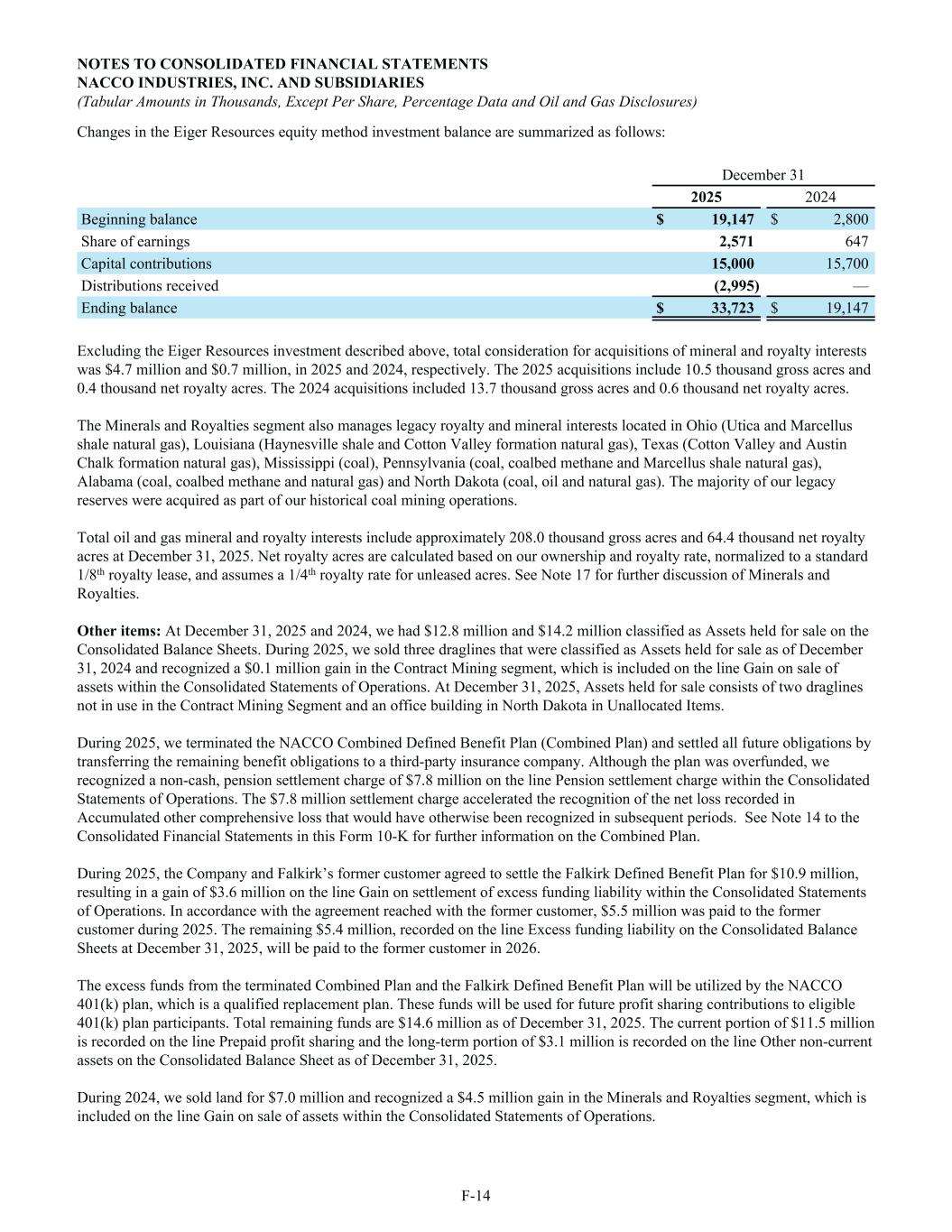 Changes in the Eiger Resources equity method investment balance are summarized as follows: December 31 2025 2024 Beginning balance $ 19,147 $ 2,800 Share of earnings 2,571 647 Capital contributions 15,000 15,700 Distributions received (2,995) — Ending balance $ 33,723 $ 19,147 Excluding the Eiger Resources investment described above, total consideration for acquisitions of mineral and royalty interests was $4.7 million and $0.7 million, in 2025 and 2024, respectively. The 2025 acquisitions include 10.5 thousand gross acres and 0.4 thousand net royalty acres. The 2024 acquisitions included 13.7 thousand gross acres and 0.6 thousand net royalty acres. The Minerals and Royalties segment also manages legacy royalty and mineral interests located in Ohio (Utica and Marcellus shale natural gas), Louisiana (Haynesville shale and Cotton Valley formation natural gas), Texas (Cotton Valley and Austin Chalk formation natural gas), Mississippi (coal), Pennsylvania (coal, coalbed methane and Marcellus shale natural gas), Alabama (coal, coalbed methane and natural gas) and North Dakota (coal, oil and natural gas). The majority of our legacy reserves were acquired as part of our historical coal mining operations. Total oil and gas mineral and royalty interests include approximately 208.0 thousand gross acres and 64.4 thousand net royalty acres at December 31, 2025. Net royalty acres are calculated based on our ownership and royalty rate, normalized to a standard 1/8th royalty lease, and assumes a 1/4th royalty rate for unleased acres. See Note 17 for further discussion of Minerals and Royalties. Other items: At December 31, 2025 and 2024, we had $12.8 million and $14.2 million classified as Assets held for sale on the Consolidated Balance Sheets. During 2025, we sold three draglines that were classified as Assets held for sale as of December 31, 2024 and recognized a $0.1 million gain in the Contract Mining segment, which is included on the line Gain on sale of assets within the Consolidated Statements of Operations. At December 31, 2025, Assets held for sale consists of two draglines not in use in the Contract Mining Segment and an office building in North Dakota in Unallocated Items. During 2025, we terminated the NACCO Combined Defined Benefit Plan (Combined Plan) and settled all future obligations by transferring the remaining benefit obligations to a third-party insurance company. Although the plan was overfunded, we recognized a non-cash, pension settlement charge of $7.8 million on the line Pension settlement charge within the Consolidated Statements of Operations. The $7.8 million settlement charge accelerated the recognition of the net loss recorded in Accumulated other comprehensive loss that would have otherwise been recognized in subsequent periods. See Note 14 to the Consolidated Financial Statements in this Form 10-K for further information on the Combined Plan. During 2025, the Company and Falkirk’s former customer agreed to settle the Falkirk Defined Benefit Plan for $10.9 million, resulting in a gain of $3.6 million on the line Gain on settlement of excess funding liability within the Consolidated Statements of Operations. In accordance with the agreement reached with the former customer, $5.5 million was paid to the former customer during 2025. The remaining $5.4 million, recorded on the line Excess funding liability on the Consolidated Balance Sheets at December 31, 2025, will be paid to the former customer in 2026. The excess funds from the terminated Combined Plan and the Falkirk Defined Benefit Plan will be utilized by the NACCO 401(k) plan, which is a qualified replacement plan. These funds will be used for future profit sharing contributions to eligible 401(k) plan participants. Total remaining funds are $14.6 million as of December 31, 2025. The current portion of $11.5 million is recorded on the line Prepaid profit sharing and the long-term portion of $3.1 million is recorded on the line Other non-current assets on the Consolidated Balance Sheet as of December 31, 2025. During 2024, we sold land for $7.0 million and recognized a $4.5 million gain in the Minerals and Royalties segment, which is included on the line Gain on sale of assets within the Consolidated Statements of Operations. NOTES TO CONSOLIDATED FINANCIAL STATEMENTS NACCO INDUSTRIES, INC. AND SUBSIDIARIES (Tabular Amounts in Thousands, Except Per Share, Percentage Data and Oil and Gas Disclosures) F-14