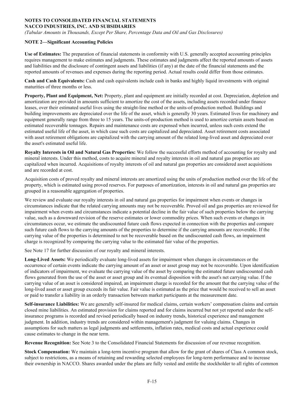 NOTE 2—Significant Accounting Policies Use of Estimates: The preparation of financial statements in conformity with U.S. generally accepted accounting principles requires management to make estimates and judgments. These estimates and judgments affect the reported amounts of assets and liabilities and the disclosure of contingent assets and liabilities (if any) at the date of the financial statements and the reported amounts of revenues and expenses during the reporting period. Actual results could differ from those estimates. Cash and Cash Equivalents: Cash and cash equivalents include cash in banks and highly liquid investments with original maturities of three months or less. Property, Plant and Equipment, Net: Property, plant and equipment are initially recorded at cost. Depreciation, depletion and amortization are provided in amounts sufficient to amortize the cost of the assets, including assets recorded under finance leases, over their estimated useful lives using the straight-line method or the units-of-production method. Buildings and building improvements are depreciated over the life of the asset, which is generally 30 years. Estimated lives for machinery and equipment generally range from three to 15 years. The units-of-production method is used to amortize certain assets based on estimated recoverable tonnages. Repairs and maintenance costs are expensed when incurred, unless such costs extend the estimated useful life of the asset, in which case such costs are capitalized and depreciated. Asset retirement costs associated with asset retirement obligations are capitalized with the carrying amount of the related long-lived asset and depreciated over the asset's estimated useful life. Royalty Interests in Oil and Natural Gas Properties: We follow the successful efforts method of accounting for royalty and mineral interests. Under this method, costs to acquire mineral and royalty interests in oil and natural gas properties are capitalized when incurred. Acquisitions of royalty interests of oil and natural gas properties are considered asset acquisitions and are recorded at cost. Acquisition costs of proved royalty and mineral interests are amortized using the units of production method over the life of the property, which is estimated using proved reserves. For purposes of amortization, interests in oil and natural gas properties are grouped in a reasonable aggregation of properties. We review and evaluate our royalty interests in oil and natural gas properties for impairment when events or changes in circumstances indicate that the related carrying amounts may not be recoverable. Proved oil and gas properties are reviewed for impairment when events and circumstances indicate a potential decline in the fair value of such properties below the carrying value, such as a downward revision of the reserve estimates or lower commodity prices. When such events or changes in circumstances occur, we estimate the undiscounted future cash flows expected in connection with the properties and compare such future cash flows to the carrying amounts of the properties to determine if the carrying amounts are recoverable. If the carrying value of the properties is determined to not be recoverable based on the undiscounted cash flows, an impairment charge is recognized by comparing the carrying value to the estimated fair value of the properties. See Note 17 for further discussion of our royalty and mineral interests. Long-Lived Assets: We periodically evaluate long-lived assets for impairment when changes in circumstances or the occurrence of certain events indicate the carrying amount of an asset or asset group may not be recoverable. Upon identification of indicators of impairment, we evaluate the carrying value of the asset by comparing the estimated future undiscounted cash flows generated from the use of the asset or asset group and its eventual disposition with the asset's net carrying value. If the carrying value of an asset is considered impaired, an impairment charge is recorded for the amount that the carrying value of the long-lived asset or asset group exceeds its fair value. Fair value is estimated as the price that would be received to sell an asset or paid to transfer a liability in an orderly transaction between market participants at the measurement date. Self-insurance Liabilities: We are generally self-insured for medical claims, certain workers’ compensation claims and certain closed mine liabilities. An estimated provision for claims reported and for claims incurred but not yet reported under the self- insurance programs is recorded and revised periodically based on industry trends, historical experience and management judgment. In addition, industry trends are considered within management's judgment for valuing claims. Changes in assumptions for such matters as legal judgments and settlements, inflation rates, medical costs and actual experience could cause estimates to change in the near term. Revenue Recognition: See Note 3 to the Consolidated Financial Statements for discussion of our revenue recognition. Stock Compensation: We maintain a long-term incentive program that allow for the grant of shares of Class A common stock, subject to restrictions, as a means of retaining and rewarding selected employees for long-term performance and to increase their ownership in NACCO. Shares awarded under the plans are fully vested and entitle the stockholder to all rights of common NOTES TO CONSOLIDATED FINANCIAL STATEMENTS NACCO INDUSTRIES, INC. AND SUBSIDIARIES (Tabular Amounts in Thousands, Except Per Share, Percentage Data and Oil and Gas Disclosures) F-15