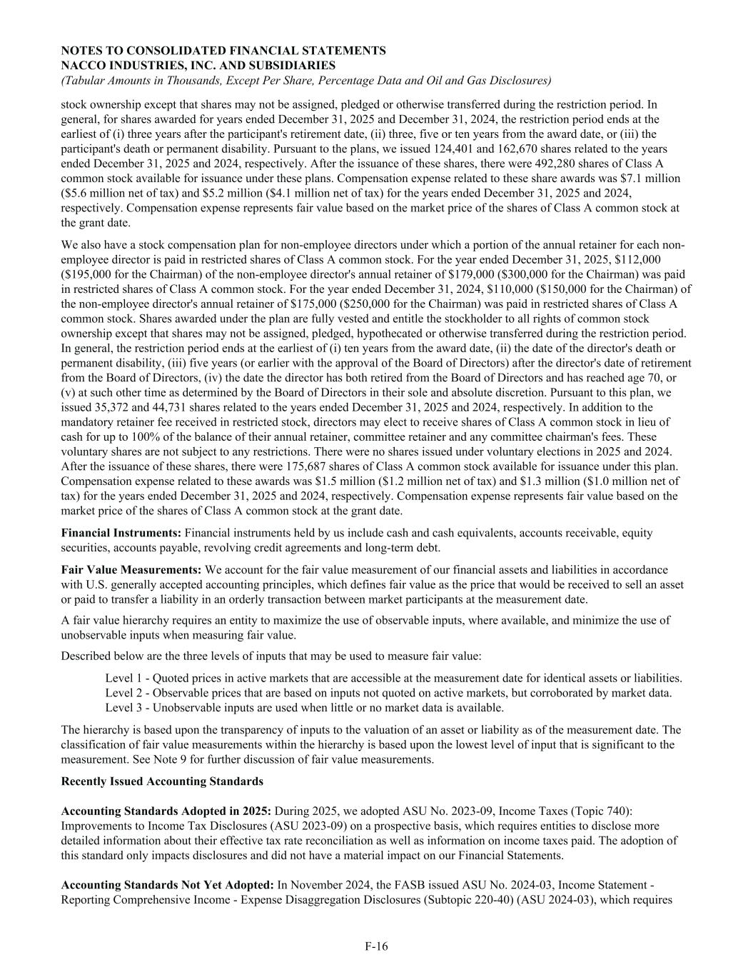stock ownership except that shares may not be assigned, pledged or otherwise transferred during the restriction period. In general, for shares awarded for years ended December 31, 2025 and December 31, 2024, the restriction period ends at the earliest of (i) three years after the participant's retirement date, (ii) three, five or ten years from the award date, or (iii) the participant's death or permanent disability. Pursuant to the plans, we issued 124,401 and 162,670 shares related to the years ended December 31, 2025 and 2024, respectively. After the issuance of these shares, there were 492,280 shares of Class A common stock available for issuance under these plans. Compensation expense related to these share awards was $7.1 million ($5.6 million net of tax) and $5.2 million ($4.1 million net of tax) for the years ended December 31, 2025 and 2024, respectively. Compensation expense represents fair value based on the market price of the shares of Class A common stock at the grant date. We also have a stock compensation plan for non-employee directors under which a portion of the annual retainer for each non- employee director is paid in restricted shares of Class A common stock. For the year ended December 31, 2025, $112,000 ($195,000 for the Chairman) of the non-employee director's annual retainer of $179,000 ($300,000 for the Chairman) was paid in restricted shares of Class A common stock. For the year ended December 31, 2024, $110,000 ($150,000 for the Chairman) of the non-employee director's annual retainer of $175,000 ($250,000 for the Chairman) was paid in restricted shares of Class A common stock. Shares awarded under the plan are fully vested and entitle the stockholder to all rights of common stock ownership except that shares may not be assigned, pledged, hypothecated or otherwise transferred during the restriction period. In general, the restriction period ends at the earliest of (i) ten years from the award date, (ii) the date of the director's death or permanent disability, (iii) five years (or earlier with the approval of the Board of Directors) after the director's date of retirement from the Board of Directors, (iv) the date the director has both retired from the Board of Directors and has reached age 70, or (v) at such other time as determined by the Board of Directors in their sole and absolute discretion. Pursuant to this plan, we issued 35,372 and 44,731 shares related to the years ended December 31, 2025 and 2024, respectively. In addition to the mandatory retainer fee received in restricted stock, directors may elect to receive shares of Class A common stock in lieu of cash for up to 100% of the balance of their annual retainer, committee retainer and any committee chairman's fees. These voluntary shares are not subject to any restrictions. There were no shares issued under voluntary elections in 2025 and 2024. After the issuance of these shares, there were 175,687 shares of Class A common stock available for issuance under this plan. Compensation expense related to these awards was $1.5 million ($1.2 million net of tax) and $1.3 million ($1.0 million net of tax) for the years ended December 31, 2025 and 2024, respectively. Compensation expense represents fair value based on the market price of the shares of Class A common stock at the grant date. Financial Instruments: Financial instruments held by us include cash and cash equivalents, accounts receivable, equity securities, accounts payable, revolving credit agreements and long-term debt. Fair Value Measurements: We account for the fair value measurement of our financial assets and liabilities in accordance with U.S. generally accepted accounting principles, which defines fair value as the price that would be received to sell an asset or paid to transfer a liability in an orderly transaction between market participants at the measurement date. A fair value hierarchy requires an entity to maximize the use of observable inputs, where available, and minimize the use of unobservable inputs when measuring fair value. Described below are the three levels of inputs that may be used to measure fair value: Level 1 - Quoted prices in active markets that are accessible at the measurement date for identical assets or liabilities. Level 2 - Observable prices that are based on inputs not quoted on active markets, but corroborated by market data. Level 3 - Unobservable inputs are used when little or no market data is available. The hierarchy is based upon the transparency of inputs to the valuation of an asset or liability as of the measurement date. The classification of fair value measurements within the hierarchy is based upon the lowest level of input that is significant to the measurement. See Note 9 for further discussion of fair value measurements. Recently Issued Accounting Standards Accounting Standards Adopted in 2025: During 2025, we adopted ASU No. 2023-09, Income Taxes (Topic 740): Improvements to Income Tax Disclosures (ASU 2023-09) on a prospective basis, which requires entities to disclose more detailed information about their effective tax rate reconciliation as well as information on income taxes paid. The adoption of this standard only impacts disclosures and did not have a material impact on our Financial Statements. Accounting Standards Not Yet Adopted: In November 2024, the FASB issued ASU No. 2024-03, Income Statement - Reporting Comprehensive Income - Expense Disaggregation Disclosures (Subtopic 220-40) (ASU 2024-03), which requires NOTES TO CONSOLIDATED FINANCIAL STATEMENTS NACCO INDUSTRIES, INC. AND SUBSIDIARIES (Tabular Amounts in Thousands, Except Per Share, Percentage Data and Oil and Gas Disclosures) F-16
