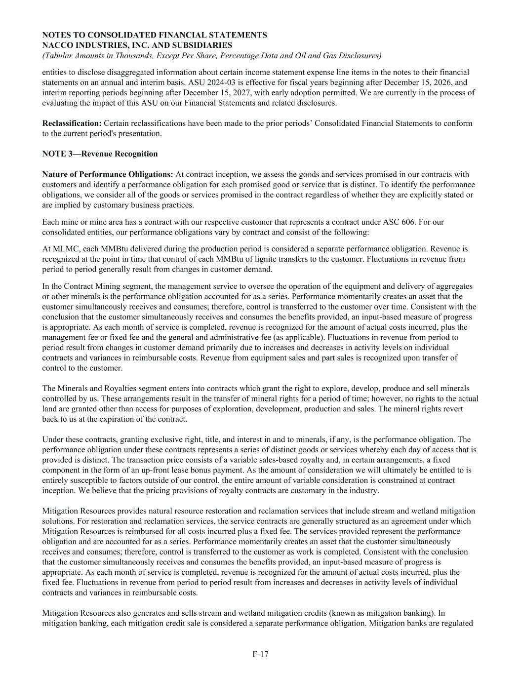 entities to disclose disaggregated information about certain income statement expense line items in the notes to their financial statements on an annual and interim basis. ASU 2024-03 is effective for fiscal years beginning after December 15, 2026, and interim reporting periods beginning after December 15, 2027, with early adoption permitted. We are currently in the process of evaluating the impact of this ASU on our Financial Statements and related disclosures. Reclassification: Certain reclassifications have been made to the prior periods’ Consolidated Financial Statements to conform to the current period's presentation. NOTE 3—Revenue Recognition Nature of Performance Obligations: At contract inception, we assess the goods and services promised in our contracts with customers and identify a performance obligation for each promised good or service that is distinct. To identify the performance obligations, we consider all of the goods or services promised in the contract regardless of whether they are explicitly stated or are implied by customary business practices. Each mine or mine area has a contract with our respective customer that represents a contract under ASC 606. For our consolidated entities, our performance obligations vary by contract and consist of the following: At MLMC, each MMBtu delivered during the production period is considered a separate performance obligation. Revenue is recognized at the point in time that control of each MMBtu of lignite transfers to the customer. Fluctuations in revenue from period to period generally result from changes in customer demand. In the Contract Mining segment, the management service to oversee the operation of the equipment and delivery of aggregates or other minerals is the performance obligation accounted for as a series. Performance momentarily creates an asset that the customer simultaneously receives and consumes; therefore, control is transferred to the customer over time. Consistent with the conclusion that the customer simultaneously receives and consumes the benefits provided, an input-based measure of progress is appropriate. As each month of service is completed, revenue is recognized for the amount of actual costs incurred, plus the management fee or fixed fee and the general and administrative fee (as applicable). Fluctuations in revenue from period to period result from changes in customer demand primarily due to increases and decreases in activity levels on individual contracts and variances in reimbursable costs. Revenue from equipment sales and part sales is recognized upon transfer of control to the customer. The Minerals and Royalties segment enters into contracts which grant the right to explore, develop, produce and sell minerals controlled by us. These arrangements result in the transfer of mineral rights for a period of time; however, no rights to the actual land are granted other than access for purposes of exploration, development, production and sales. The mineral rights revert back to us at the expiration of the contract. Under these contracts, granting exclusive right, title, and interest in and to minerals, if any, is the performance obligation. The performance obligation under these contracts represents a series of distinct goods or services whereby each day of access that is provided is distinct. The transaction price consists of a variable sales-based royalty and, in certain arrangements, a fixed component in the form of an up-front lease bonus payment. As the amount of consideration we will ultimately be entitled to is entirely susceptible to factors outside of our control, the entire amount of variable consideration is constrained at contract inception. We believe that the pricing provisions of royalty contracts are customary in the industry. Mitigation Resources provides natural resource restoration and reclamation services that include stream and wetland mitigation solutions. For restoration and reclamation services, the service contracts are generally structured as an agreement under which Mitigation Resources is reimbursed for all costs incurred plus a fixed fee. The services provided represent the performance obligation and are accounted for as a series. Performance momentarily creates an asset that the customer simultaneously receives and consumes; therefore, control is transferred to the customer as work is completed. Consistent with the conclusion that the customer simultaneously receives and consumes the benefits provided, an input-based measure of progress is appropriate. As each month of service is completed, revenue is recognized for the amount of actual costs incurred, plus the fixed fee. Fluctuations in revenue from period to period result from increases and decreases in activity levels of individual contracts and variances in reimbursable costs. Mitigation Resources also generates and sells stream and wetland mitigation credits (known as mitigation banking). In mitigation banking, each mitigation credit sale is considered a separate performance obligation. Mitigation banks are regulated NOTES TO CONSOLIDATED FINANCIAL STATEMENTS NACCO INDUSTRIES, INC. AND SUBSIDIARIES (Tabular Amounts in Thousands, Except Per Share, Percentage Data and Oil and Gas Disclosures) F-17