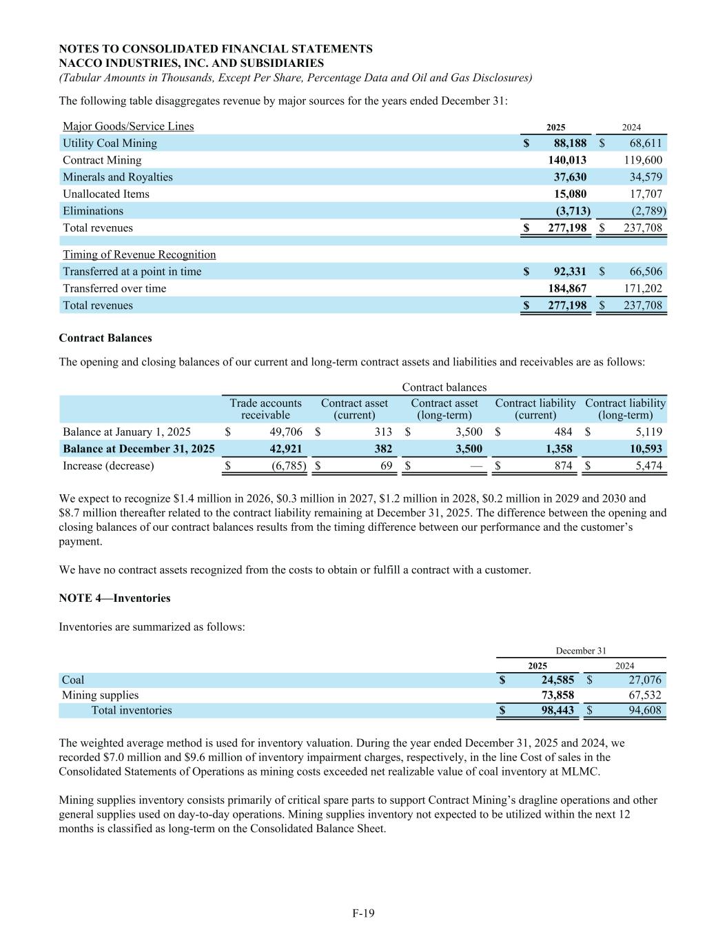 The following table disaggregates revenue by major sources for the years ended December 31: Major Goods/Service Lines 2025 2024 Utility Coal Mining $ 88,188 $ 68,611 Contract Mining 140,013 119,600 Minerals and Royalties 37,630 34,579 Unallocated Items 15,080 17,707 Eliminations (3,713) (2,789) Total revenues $ 277,198 $ 237,708 Timing of Revenue Recognition Transferred at a point in time $ 92,331 $ 66,506 Transferred over time 184,867 171,202 Total revenues $ 277,198 $ 237,708 Contract Balances The opening and closing balances of our current and long-term contract assets and liabilities and receivables are as follows: Contract balances Trade accounts receivable Contract asset (current) Contract asset (long-term) Contract liability (current) Contract liability (long-term) Balance at January 1, 2025 $ 49,706 $ 313 $ 3,500 $ 484 $ 5,119 Balance at December 31, 2025 42,921 382 3,500 1,358 10,593 Increase (decrease) $ (6,785) $ 69 $ — $ 874 $ 5,474 We expect to recognize $1.4 million in 2026, $0.3 million in 2027, $1.2 million in 2028, $0.2 million in 2029 and 2030 and $8.7 million thereafter related to the contract liability remaining at December 31, 2025. The difference between the opening and closing balances of our contract balances results from the timing difference between our performance and the customer’s payment. We have no contract assets recognized from the costs to obtain or fulfill a contract with a customer. NOTE 4—Inventories Inventories are summarized as follows: December 31 2025 2024 Coal $ 24,585 $ 27,076 Mining supplies 73,858 67,532 Total inventories $ 98,443 $ 94,608 The weighted average method is used for inventory valuation. During the year ended December 31, 2025 and 2024, we recorded $7.0 million and $9.6 million of inventory impairment charges, respectively, in the line Cost of sales in the Consolidated Statements of Operations as mining costs exceeded net realizable value of coal inventory at MLMC. Mining supplies inventory consists primarily of critical spare parts to support Contract Mining’s dragline operations and other general supplies used on day-to-day operations. Mining supplies inventory not expected to be utilized within the next 12 months is classified as long-term on the Consolidated Balance Sheet. NOTES TO CONSOLIDATED FINANCIAL STATEMENTS NACCO INDUSTRIES, INC. AND SUBSIDIARIES (Tabular Amounts in Thousands, Except Per Share, Percentage Data and Oil and Gas Disclosures) F-19
