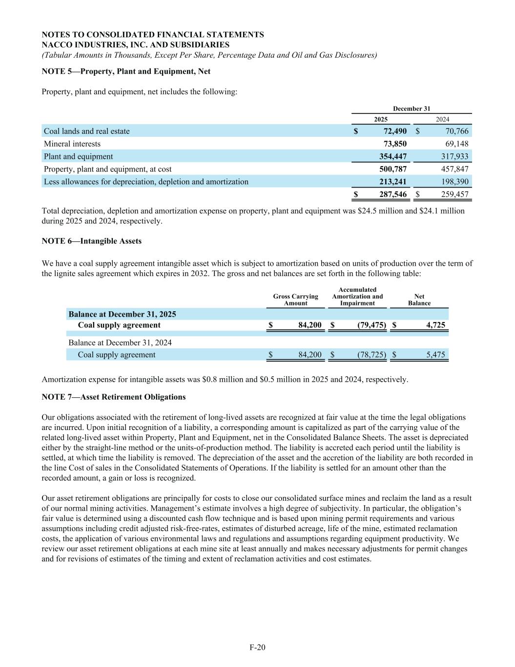 NOTE 5—Property, Plant and Equipment, Net Property, plant and equipment, net includes the following: December 31 2025 2024 Coal lands and real estate $ 72,490 $ 70,766 Mineral interests 73,850 69,148 Plant and equipment 354,447 317,933 Property, plant and equipment, at cost 500,787 457,847 Less allowances for depreciation, depletion and amortization 213,241 198,390 $ 287,546 $ 259,457 Total depreciation, depletion and amortization expense on property, plant and equipment was $24.5 million and $24.1 million during 2025 and 2024, respectively. NOTE 6—Intangible Assets We have a coal supply agreement intangible asset which is subject to amortization based on units of production over the term of the lignite sales agreement which expires in 2032. The gross and net balances are set forth in the following table: Gross Carrying Amount Accumulated Amortization and Impairment Net Balance Balance at December 31, 2025 Coal supply agreement $ 84,200 $ (79,475) $ 4,725 Balance at December 31, 2024 Coal supply agreement $ 84,200 $ (78,725) $ 5,475 Amortization expense for intangible assets was $0.8 million and $0.5 million in 2025 and 2024, respectively. NOTE 7—Asset Retirement Obligations Our obligations associated with the retirement of long-lived assets are recognized at fair value at the time the legal obligations are incurred. Upon initial recognition of a liability, a corresponding amount is capitalized as part of the carrying value of the related long-lived asset within Property, Plant and Equipment, net in the Consolidated Balance Sheets. The asset is depreciated either by the straight-line method or the units-of-production method. The liability is accreted each period until the liability is settled, at which time the liability is removed. The depreciation of the asset and the accretion of the liability are both recorded in the line Cost of sales in the Consolidated Statements of Operations. If the liability is settled for an amount other than the recorded amount, a gain or loss is recognized. Our asset retirement obligations are principally for costs to close our consolidated surface mines and reclaim the land as a result of our normal mining activities. Management’s estimate involves a high degree of subjectivity. In particular, the obligation’s fair value is determined using a discounted cash flow technique and is based upon mining permit requirements and various assumptions including credit adjusted risk-free-rates, estimates of disturbed acreage, life of the mine, estimated reclamation costs, the application of various environmental laws and regulations and assumptions regarding equipment productivity. We review our asset retirement obligations at each mine site at least annually and makes necessary adjustments for permit changes and for revisions of estimates of the timing and extent of reclamation activities and cost estimates. NOTES TO CONSOLIDATED FINANCIAL STATEMENTS NACCO INDUSTRIES, INC. AND SUBSIDIARIES (Tabular Amounts in Thousands, Except Per Share, Percentage Data and Oil and Gas Disclosures) F-20