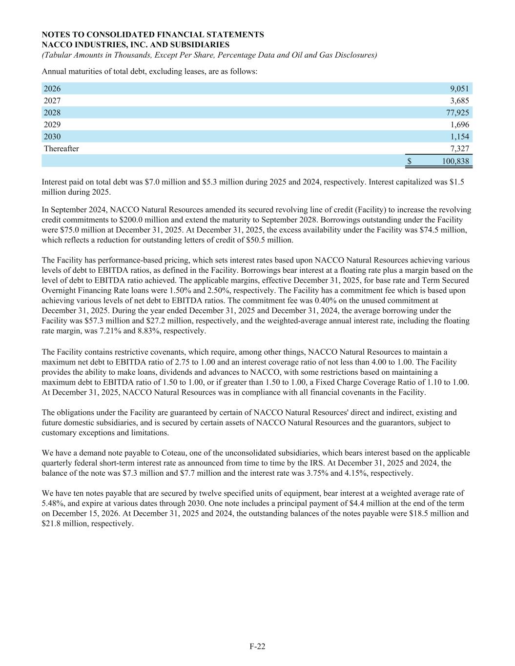 Annual maturities of total debt, excluding leases, are as follows: 2026 9,051 2027 3,685 2028 77,925 2029 1,696 2030 1,154 Thereafter 7,327 $ 100,838 Interest paid on total debt was $7.0 million and $5.3 million during 2025 and 2024, respectively. Interest capitalized was $1.5 million during 2025. In September 2024, NACCO Natural Resources amended its secured revolving line of credit (Facility) to increase the revolving credit commitments to $200.0 million and extend the maturity to September 2028. Borrowings outstanding under the Facility were $75.0 million at December 31, 2025. At December 31, 2025, the excess availability under the Facility was $74.5 million, which reflects a reduction for outstanding letters of credit of $50.5 million. The Facility has performance-based pricing, which sets interest rates based upon NACCO Natural Resources achieving various levels of debt to EBITDA ratios, as defined in the Facility. Borrowings bear interest at a floating rate plus a margin based on the level of debt to EBITDA ratio achieved. The applicable margins, effective December 31, 2025, for base rate and Term Secured Overnight Financing Rate loans were 1.50% and 2.50%, respectively. The Facility has a commitment fee which is based upon achieving various levels of net debt to EBITDA ratios. The commitment fee was 0.40% on the unused commitment at December 31, 2025. During the year ended December 31, 2025 and December 31, 2024, the average borrowing under the Facility was $57.3 million and $27.2 million, respectively, and the weighted-average annual interest rate, including the floating rate margin, was 7.21% and 8.83%, respectively. The Facility contains restrictive covenants, which require, among other things, NACCO Natural Resources to maintain a maximum net debt to EBITDA ratio of 2.75 to 1.00 and an interest coverage ratio of not less than 4.00 to 1.00. The Facility provides the ability to make loans, dividends and advances to NACCO, with some restrictions based on maintaining a maximum debt to EBITDA ratio of 1.50 to 1.00, or if greater than 1.50 to 1.00, a Fixed Charge Coverage Ratio of 1.10 to 1.00. At December 31, 2025, NACCO Natural Resources was in compliance with all financial covenants in the Facility. The obligations under the Facility are guaranteed by certain of NACCO Natural Resources' direct and indirect, existing and future domestic subsidiaries, and is secured by certain assets of NACCO Natural Resources and the guarantors, subject to customary exceptions and limitations. We have a demand note payable to Coteau, one of the unconsolidated subsidiaries, which bears interest based on the applicable quarterly federal short-term interest rate as announced from time to time by the IRS. At December 31, 2025 and 2024, the balance of the note was $7.3 million and $7.7 million and the interest rate was 3.75% and 4.15%, respectively. We have ten notes payable that are secured by twelve specified units of equipment, bear interest at a weighted average rate of 5.48%, and expire at various dates through 2030. One note includes a principal payment of $4.4 million at the end of the term on December 15, 2026. At December 31, 2025 and 2024, the outstanding balances of the notes payable were $18.5 million and $21.8 million, respectively. NOTES TO CONSOLIDATED FINANCIAL STATEMENTS NACCO INDUSTRIES, INC. AND SUBSIDIARIES (Tabular Amounts in Thousands, Except Per Share, Percentage Data and Oil and Gas Disclosures) F-22