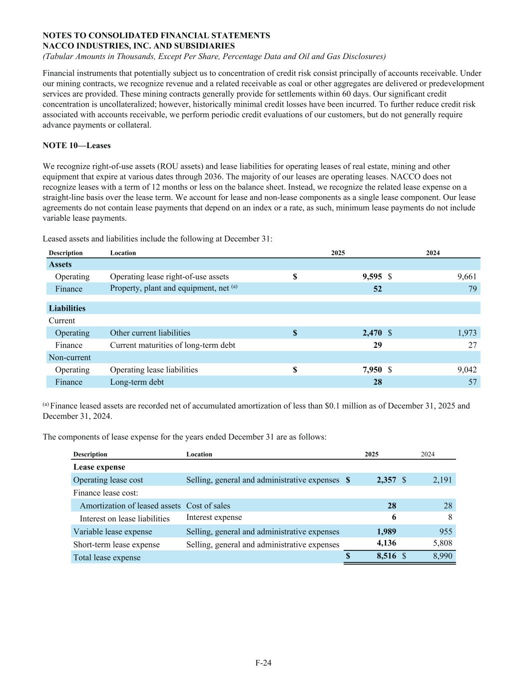 Financial instruments that potentially subject us to concentration of credit risk consist principally of accounts receivable. Under our mining contracts, we recognize revenue and a related receivable as coal or other aggregates are delivered or predevelopment services are provided. These mining contracts generally provide for settlements within 60 days. Our significant credit concentration is uncollateralized; however, historically minimal credit losses have been incurred. To further reduce credit risk associated with accounts receivable, we perform periodic credit evaluations of our customers, but do not generally require advance payments or collateral. NOTE 10—Leases We recognize right-of-use assets (ROU assets) and lease liabilities for operating leases of real estate, mining and other equipment that expire at various dates through 2036. The majority of our leases are operating leases. NACCO does not recognize leases with a term of 12 months or less on the balance sheet. Instead, we recognize the related lease expense on a straight-line basis over the lease term. We account for lease and non-lease components as a single lease component. Our lease agreements do not contain lease payments that depend on an index or a rate, as such, minimum lease payments do not include variable lease payments. Leased assets and liabilities include the following at December 31: Description Location 2025 2024 Assets Operating Operating lease right-of-use assets $ 9,595 $ 9,661 Finance Property, plant and equipment, net (a) 52 79 Liabilities Current Operating Other current liabilities $ 2,470 $ 1,973 Finance Current maturities of long-term debt 29 27 Non-current Operating Operating lease liabilities $ 7,950 $ 9,042 Finance Long-term debt 28 57 (a) Finance leased assets are recorded net of accumulated amortization of less than $0.1 million as of December 31, 2025 and December 31, 2024. The components of lease expense for the years ended December 31 are as follows: Description Location 2025 2024 Lease expense Operating lease cost Selling, general and administrative expenses $ 2,357 $ 2,191 Finance lease cost: Amortization of leased assets Cost of sales 28 28 Interest on lease liabilities Interest expense 6 8 Variable lease expense Selling, general and administrative expenses 1,989 955 Short-term lease expense Selling, general and administrative expenses 4,136 5,808 Total lease expense $ 8,516 $ 8,990 NOTES TO CONSOLIDATED FINANCIAL STATEMENTS NACCO INDUSTRIES, INC. AND SUBSIDIARIES (Tabular Amounts in Thousands, Except Per Share, Percentage Data and Oil and Gas Disclosures) F-24