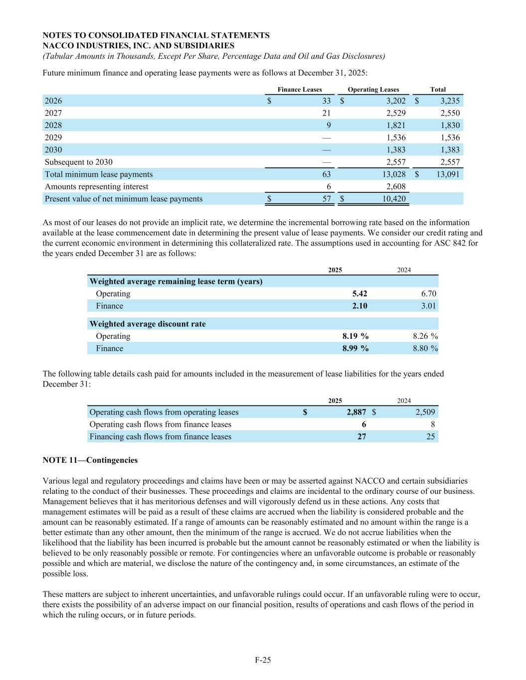 Future minimum finance and operating lease payments were as follows at December 31, 2025: Finance Leases Operating Leases Total 2026 $ 33 $ 3,202 $ 3,235 2027 21 2,529 2,550 2028 9 1,821 1,830 2029 — 1,536 1,536 2030 — 1,383 1,383 Subsequent to 2030 — 2,557 2,557 Total minimum lease payments 63 13,028 $ 13,091 Amounts representing interest 6 2,608 Present value of net minimum lease payments $ 57 $ 10,420 As most of our leases do not provide an implicit rate, we determine the incremental borrowing rate based on the information available at the lease commencement date in determining the present value of lease payments. We consider our credit rating and the current economic environment in determining this collateralized rate. The assumptions used in accounting for ASC 842 for the years ended December 31 are as follows: 2025 2024 Weighted average remaining lease term (years) Operating 5.42 6.70 Finance 2.10 3.01 Weighted average discount rate Operating 8.19 % 8.26 % Finance 8.99 % 8.80 % The following table details cash paid for amounts included in the measurement of lease liabilities for the years ended December 31: 2025 2024 Operating cash flows from operating leases $ 2,887 $ 2,509 Operating cash flows from finance leases 6 8 Financing cash flows from finance leases 27 25 NOTE 11—Contingencies Various legal and regulatory proceedings and claims have been or may be asserted against NACCO and certain subsidiaries relating to the conduct of their businesses. These proceedings and claims are incidental to the ordinary course of our business. Management believes that it has meritorious defenses and will vigorously defend us in these actions. Any costs that management estimates will be paid as a result of these claims are accrued when the liability is considered probable and the amount can be reasonably estimated. If a range of amounts can be reasonably estimated and no amount within the range is a better estimate than any other amount, then the minimum of the range is accrued. We do not accrue liabilities when the likelihood that the liability has been incurred is probable but the amount cannot be reasonably estimated or when the liability is believed to be only reasonably possible or remote. For contingencies where an unfavorable outcome is probable or reasonably possible and which are material, we disclose the nature of the contingency and, in some circumstances, an estimate of the possible loss. These matters are subject to inherent uncertainties, and unfavorable rulings could occur. If an unfavorable ruling were to occur, there exists the possibility of an adverse impact on our financial position, results of operations and cash flows of the period in which the ruling occurs, or in future periods. NOTES TO CONSOLIDATED FINANCIAL STATEMENTS NACCO INDUSTRIES, INC. AND SUBSIDIARIES (Tabular Amounts in Thousands, Except Per Share, Percentage Data and Oil and Gas Disclosures) F-25