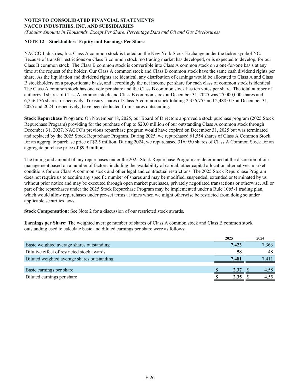 NOTE 12—Stockholders' Equity and Earnings Per Share NACCO Industries, Inc. Class A common stock is traded on the New York Stock Exchange under the ticker symbol NC. Because of transfer restrictions on Class B common stock, no trading market has developed, or is expected to develop, for our Class B common stock. The Class B common stock is convertible into Class A common stock on a one-for-one basis at any time at the request of the holder. Our Class A common stock and Class B common stock have the same cash dividend rights per share. As the liquidation and dividend rights are identical, any distribution of earnings would be allocated to Class A and Class B stockholders on a proportionate basis, and accordingly the net income per share for each class of common stock is identical. The Class A common stock has one vote per share and the Class B common stock has ten votes per share. The total number of authorized shares of Class A common stock and Class B common stock at December 31, 2025 was 25,000,000 shares and 6,756,176 shares, respectively. Treasury shares of Class A common stock totaling 2,356,755 and 2,488,013 at December 31, 2025 and 2024, respectively, have been deducted from shares outstanding. Stock Repurchase Program: On November 18, 2025, our Board of Directors approved a stock purchase program (2025 Stock Repurchase Program) providing for the purchase of up to $20.0 million of our outstanding Class A common stock through December 31, 2027. NACCO's previous repurchase program would have expired on December 31, 2025 but was terminated and replaced by the 2025 Stock Repurchase Program. During 2025, we repurchased 61,554 shares of Class A Common Stock for an aggregate purchase price of $2.5 million. During 2024, we repurchased 316,950 shares of Class A Common Stock for an aggregate purchase price of $9.9 million. The timing and amount of any repurchases under the 2025 Stock Repurchase Program are determined at the discretion of our management based on a number of factors, including the availability of capital, other capital allocation alternatives, market conditions for our Class A common stock and other legal and contractual restrictions. The 2025 Stock Repurchase Program does not require us to acquire any specific number of shares and may be modified, suspended, extended or terminated by us without prior notice and may be executed through open market purchases, privately negotiated transactions or otherwise. All or part of the repurchases under the 2025 Stock Repurchase Program may be implemented under a Rule 10b5-1 trading plan, which would allow repurchases under pre-set terms at times when we might otherwise be restricted from doing so under applicable securities laws. Stock Compensation: See Note 2 for a discussion of our restricted stock awards. Earnings per Share: The weighted average number of shares of Class A common stock and Class B common stock outstanding used to calculate basic and diluted earnings per share were as follows: 2025 2024 Basic weighted average shares outstanding 7,423 7,363 Dilutive effect of restricted stock awards 58 48 Diluted weighted average shares outstanding 7,481 7,411 Basic earnings per share $ 2.37 $ 4.58 Diluted earnings per share $ 2.35 $ 4.55 NOTES TO CONSOLIDATED FINANCIAL STATEMENTS NACCO INDUSTRIES, INC. AND SUBSIDIARIES (Tabular Amounts in Thousands, Except Per Share, Percentage Data and Oil and Gas Disclosures) F-26