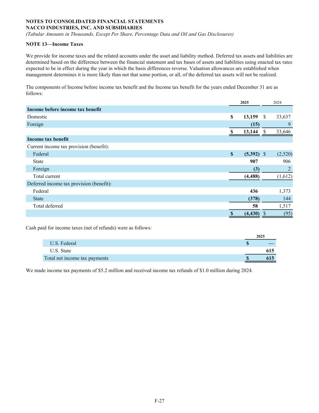 NOTE 13—Income Taxes We provide for income taxes and the related accounts under the asset and liability method. Deferred tax assets and liabilities are determined based on the difference between the financial statement and tax bases of assets and liabilities using enacted tax rates expected to be in effect during the year in which the basis differences reverse. Valuation allowances are established when management determines it is more likely than not that some portion, or all, of the deferred tax assets will not be realized. The components of Income before income tax benefit and the Income tax benefit for the years ended December 31 are as follows: 2025 2024 Income before income tax benefit Domestic $ 13,159 $ 33,637 Foreign (15) 9 $ 13,144 $ 33,646 Income tax benefit Current income tax provision (benefit): Federal $ (5,392) $ (2,520) State 907 906 Foreign (3) 2 Total current (4,488) (1,612) Deferred income tax provision (benefit): Federal 436 1,373 State (378) 144 Total deferred 58 1,517 $ (4,430) $ (95) Cash paid for income taxes (net of refunds) were as follows: 2025 U.S. Federal $ — U.S. State 615 Total net income tax payments $ 615 We made income tax payments of $5.2 million and received income tax refunds of $1.0 million during 2024. NOTES TO CONSOLIDATED FINANCIAL STATEMENTS NACCO INDUSTRIES, INC. AND SUBSIDIARIES (Tabular Amounts in Thousands, Except Per Share, Percentage Data and Oil and Gas Disclosures) F-27