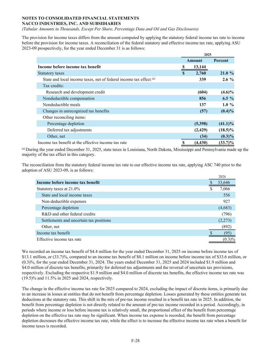 The provision for income taxes differs from the amount computed by applying the statutory federal income tax rate to income before the provision for income taxes. A reconciliation of the federal statutory and effective income tax rate, applying ASU 2023-09 prospectively, for the year ended December 31 is as follows: 2025 Amount Percent Income before income tax benefit $ 13,144 Statutory taxes $ 2,760 21.0 % State and local income taxes, net of federal income tax effect (a) 339 2.6 % Tax credits: Research and development credit (604) (4.6) % Nondeductible compensation 856 6.5 % Nondeductible meals 137 1.0 % Changes in unrecognized tax benefits (57) (0.4) % Other reconciling items: Percentage depletion (5,398) (41.1) % Deferred tax adjustments (2,429) (18.5) % Other, net (34) (0.3) % Income tax benefit at the effective income tax rate $ (4,430) (33.7) % (a) During the year ended December 31, 2025, state taxes in Louisiana, North Dakota, Mississippi and Pennsylvania made up the majority of the tax effect in this category. The reconciliation from the statutory federal income tax rate to our effective income tax rate, applying ASC 740 prior to the adoption of ASU 2023-09, is as follows: 2024 Income before income tax benefit $ 33,646 Statutory taxes at 21.0% $ 7,066 State and local income taxes 556 Non-deductible expenses 927 Percentage depletion (4,683) R&D and other federal credits (796) Settlements and uncertain tax positions (2,273) Other, net (892) Income tax benefit $ (95) Effective income tax rate (0.3) % We recorded an income tax benefit of $4.4 million for the year ended December 31, 2025 on income before income tax of $13.1 million, or (33.7)%, compared to an income tax benefit of $0.1 million on income before income tax of $33.6 million, or (0.3)%, for the year ended December 31, 2024. The years ended December 31, 2025 and 2024 included $1.9 million and $4.0 million of discrete tax benefits, primarily for deferred tax adjustments and the reversal of uncertain tax provisions, respectively. Excluding the respective $1.9 million and $4.0 million of discrete tax benefits, the effective income tax rate was (19.5)% and 11.5% in 2025 and 2024, respectively. The change in the effective income tax rate for 2025 compared to 2024, excluding the impact of discrete items, is primarily due to an increase in losses at entities that do not benefit from percentage depletion. Losses generated by these entities generate tax deductions at the statutory rate. This shift in the mix of pre-tax income resulted in a benefit tax rate in 2025. In addition, the benefit from percentage depletion is not directly related to the amount of pre-tax income recorded in a period. Accordingly, in periods where income or loss before income tax is relatively small, the proportional effect of the benefit from percentage depletion on the effective tax rate may be significant. When income tax expense is recorded, the benefit from percentage depletion decreases the effective income tax rate, while the effect is to increase the effective income tax rate when a benefit for income taxes is recorded. NOTES TO CONSOLIDATED FINANCIAL STATEMENTS NACCO INDUSTRIES, INC. AND SUBSIDIARIES (Tabular Amounts in Thousands, Except Per Share, Percentage Data and Oil and Gas Disclosures) F-28