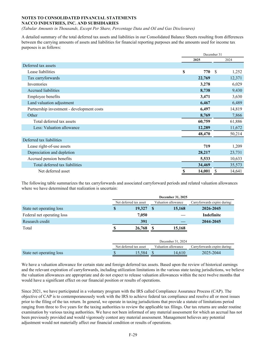 A detailed summary of the total deferred tax assets and liabilities in our Consolidated Balance Sheets resulting from differences between the carrying amounts of assets and liabilities for financial reporting purposes and the amounts used for income tax purposes is as follows: December 31 2025 2024 Deferred tax assets Lease liabilities $ 770 $ 1,252 Tax carryforwards 22,769 12,371 Inventories 3,278 6,029 Accrued liabilities 8,738 9,430 Employee benefits 3,471 3,630 Land valuation adjustment 6,467 6,489 Partnership investment - development costs 6,497 14,819 Other 8,769 7,866 Total deferred tax assets 60,759 61,886 Less: Valuation allowance 12,289 11,672 48,470 50,214 Deferred tax liabilities Lease right-of-use assets 719 1,209 Depreciation and depletion 28,217 23,731 Accrued pension benefits 5,533 10,633 Total deferred tax liabilities 34,469 35,573 Net deferred asset $ 14,001 $ 14,641 The following table summarizes the tax carryforwards and associated carryforward periods and related valuation allowances where we have determined that realization is uncertain: December 31, 2025 Net deferred tax asset Valuation allowance Carryforwards expire during: State net operating loss $ 19,327 $ 15,168 2026-2045 Federal net operating loss 7,050 — Indefinite Research credit 391 — 2044-2045 Total $ 26,768 $ 15,168 December 31, 2024 Net deferred tax asset Valuation allowance Carryforwards expire during: State net operating loss $ 15,584 $ 14,610 2025-2044 We have a valuation allowance for certain state and foreign deferred tax assets. Based upon the review of historical earnings and the relevant expiration of carryforwards, including utilization limitations in the various state taxing jurisdictions, we believe the valuation allowances are appropriate and do not expect to release valuation allowances within the next twelve months that would have a significant effect on our financial position or results of operations. Since 2021, we have participated in a voluntary program with the IRS called Compliance Assurance Process (CAP). The objective of CAP is to contemporaneously work with the IRS to achieve federal tax compliance and resolve all or most issues prior to the filing of the tax return. In general, we operate in taxing jurisdictions that provide a statute of limitations period ranging from three to five years for the taxing authorities to review the applicable tax filings. Our tax returns are under routine examination by various taxing authorities. We have not been informed of any material assessment for which an accrual has not been previously provided and would vigorously contest any material assessment. Management believes any potential adjustment would not materially affect our financial condition or results of operations. NOTES TO CONSOLIDATED FINANCIAL STATEMENTS NACCO INDUSTRIES, INC. AND SUBSIDIARIES (Tabular Amounts in Thousands, Except Per Share, Percentage Data and Oil and Gas Disclosures) F-29