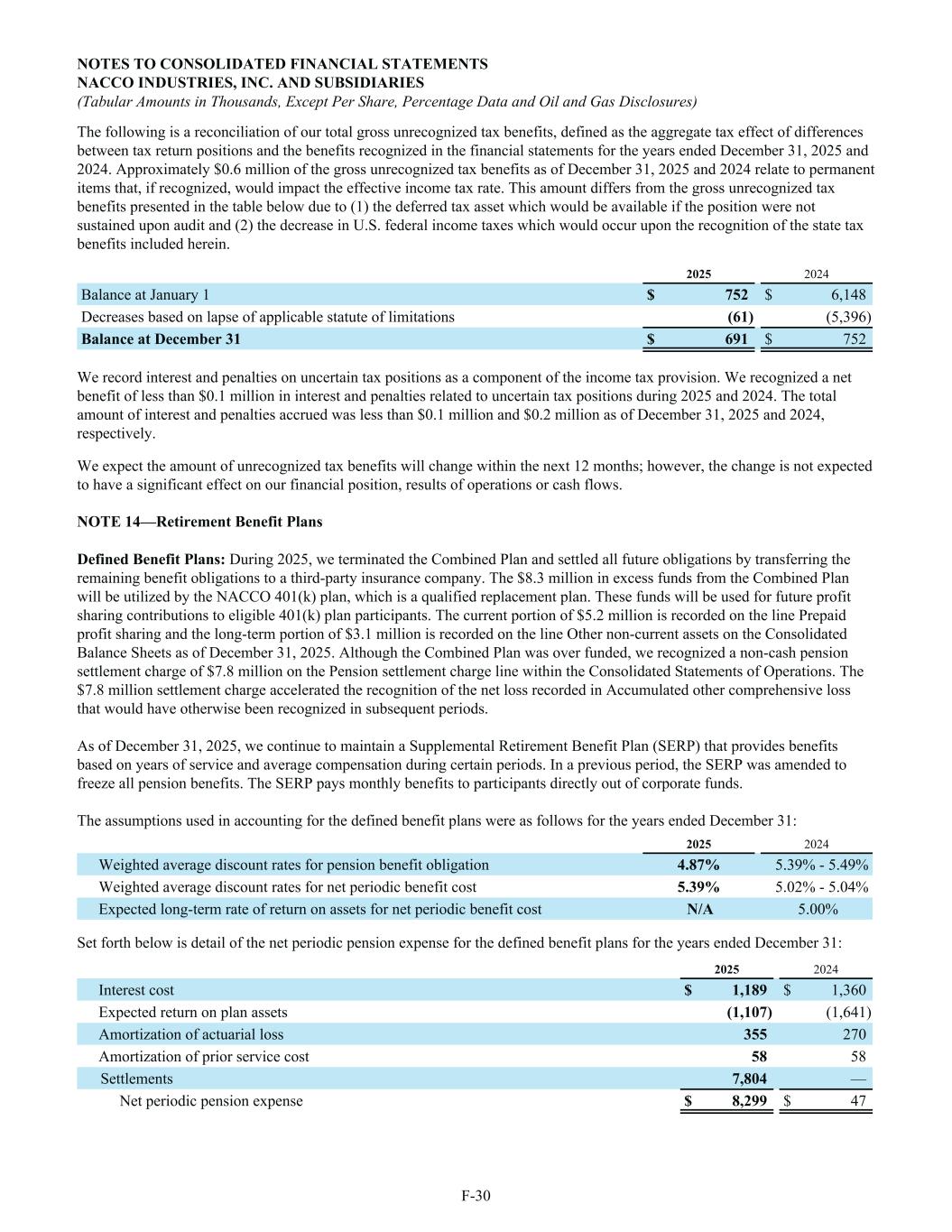 The following is a reconciliation of our total gross unrecognized tax benefits, defined as the aggregate tax effect of differences between tax return positions and the benefits recognized in the financial statements for the years ended December 31, 2025 and 2024. Approximately $0.6 million of the gross unrecognized tax benefits as of December 31, 2025 and 2024 relate to permanent items that, if recognized, would impact the effective income tax rate. This amount differs from the gross unrecognized tax benefits presented in the table below due to (1) the deferred tax asset which would be available if the position were not sustained upon audit and (2) the decrease in U.S. federal income taxes which would occur upon the recognition of the state tax benefits included herein. 2025 2024 Balance at January 1 $ 752 $ 6,148 Decreases based on lapse of applicable statute of limitations (61) (5,396) Balance at December 31 $ 691 $ 752 We record interest and penalties on uncertain tax positions as a component of the income tax provision. We recognized a net benefit of less than $0.1 million in interest and penalties related to uncertain tax positions during 2025 and 2024. The total amount of interest and penalties accrued was less than $0.1 million and $0.2 million as of December 31, 2025 and 2024, respectively. We expect the amount of unrecognized tax benefits will change within the next 12 months; however, the change is not expected to have a significant effect on our financial position, results of operations or cash flows. NOTE 14—Retirement Benefit Plans Defined Benefit Plans: During 2025, we terminated the Combined Plan and settled all future obligations by transferring the remaining benefit obligations to a third-party insurance company. The $8.3 million in excess funds from the Combined Plan will be utilized by the NACCO 401(k) plan, which is a qualified replacement plan. These funds will be used for future profit sharing contributions to eligible 401(k) plan participants. The current portion of $5.2 million is recorded on the line Prepaid profit sharing and the long-term portion of $3.1 million is recorded on the line Other non-current assets on the Consolidated Balance Sheets as of December 31, 2025. Although the Combined Plan was over funded, we recognized a non-cash pension settlement charge of $7.8 million on the Pension settlement charge line within the Consolidated Statements of Operations. The $7.8 million settlement charge accelerated the recognition of the net loss recorded in Accumulated other comprehensive loss that would have otherwise been recognized in subsequent periods. As of December 31, 2025, we continue to maintain a Supplemental Retirement Benefit Plan (SERP) that provides benefits based on years of service and average compensation during certain periods. In a previous period, the SERP was amended to freeze all pension benefits. The SERP pays monthly benefits to participants directly out of corporate funds. The assumptions used in accounting for the defined benefit plans were as follows for the years ended December 31: 2025 2024 Weighted average discount rates for pension benefit obligation 4.87% 5.39% - 5.49% Weighted average discount rates for net periodic benefit cost 5.39% 5.02% - 5.04% Expected long-term rate of return on assets for net periodic benefit cost N/A 5.00% Set forth below is detail of the net periodic pension expense for the defined benefit plans for the years ended December 31: 2025 2024 Interest cost $ 1,189 $ 1,360 Expected return on plan assets (1,107) (1,641) Amortization of actuarial loss 355 270 Amortization of prior service cost 58 58 Settlements 7,804 — Net periodic pension expense $ 8,299 $ 47 NOTES TO CONSOLIDATED FINANCIAL STATEMENTS NACCO INDUSTRIES, INC. AND SUBSIDIARIES (Tabular Amounts in Thousands, Except Per Share, Percentage Data and Oil and Gas Disclosures) F-30