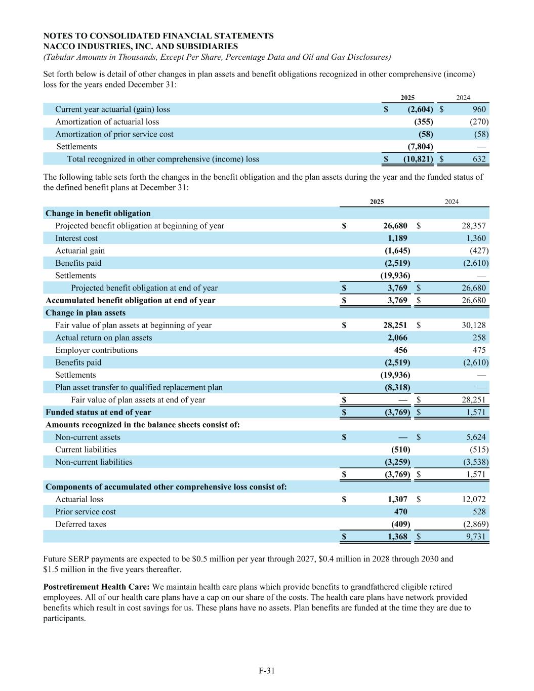 Set forth below is detail of other changes in plan assets and benefit obligations recognized in other comprehensive (income) loss for the years ended December 31: 2025 2024 Current year actuarial (gain) loss $ (2,604) $ 960 Amortization of actuarial loss (355) (270) Amortization of prior service cost (58) (58) Settlements (7,804) — Total recognized in other comprehensive (income) loss $ (10,821) $ 632 The following table sets forth the changes in the benefit obligation and the plan assets during the year and the funded status of the defined benefit plans at December 31: 2025 2024 Change in benefit obligation Projected benefit obligation at beginning of year $ 26,680 $ 28,357 Interest cost 1,189 1,360 Actuarial gain (1,645) (427) Benefits paid (2,519) (2,610) Settlements (19,936) — Projected benefit obligation at end of year $ 3,769 $ 26,680 Accumulated benefit obligation at end of year $ 3,769 $ 26,680 Change in plan assets Fair value of plan assets at beginning of year $ 28,251 $ 30,128 Actual return on plan assets 2,066 258 Employer contributions 456 475 Benefits paid (2,519) (2,610) Settlements (19,936) — Plan asset transfer to qualified replacement plan (8,318) — Fair value of plan assets at end of year $ — $ 28,251 Funded status at end of year $ (3,769) $ 1,571 Amounts recognized in the balance sheets consist of: Non-current assets $ — $ 5,624 Current liabilities (510) (515) Non-current liabilities (3,259) (3,538) $ (3,769) $ 1,571 Components of accumulated other comprehensive loss consist of: Actuarial loss $ 1,307 $ 12,072 Prior service cost 470 528 Deferred taxes (409) (2,869) $ 1,368 $ 9,731 Future SERP payments are expected to be $0.5 million per year through 2027, $0.4 million in 2028 through 2030 and $1.5 million in the five years thereafter. Postretirement Health Care: We maintain health care plans which provide benefits to grandfathered eligible retired employees. All of our health care plans have a cap on our share of the costs. The health care plans have network provided benefits which result in cost savings for us. These plans have no assets. Plan benefits are funded at the time they are due to participants. NOTES TO CONSOLIDATED FINANCIAL STATEMENTS NACCO INDUSTRIES, INC. AND SUBSIDIARIES (Tabular Amounts in Thousands, Except Per Share, Percentage Data and Oil and Gas Disclosures) F-31