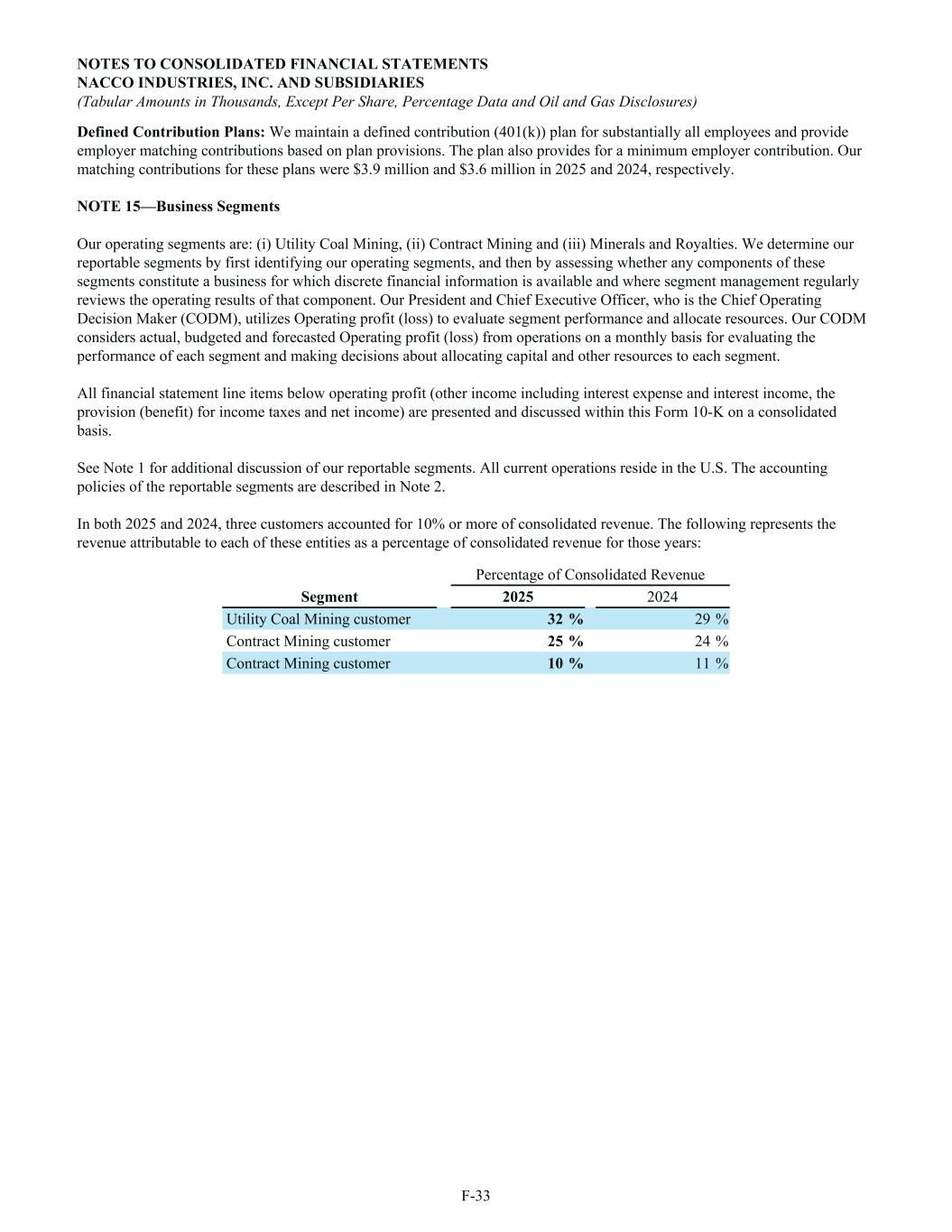 Defined Contribution Plans: We maintain a defined contribution (401(k)) plan for substantially all employees and provide employer matching contributions based on plan provisions. The plan also provides for a minimum employer contribution. Our matching contributions for these plans were $3.9 million and $3.6 million in 2025 and 2024, respectively. NOTE 15—Business Segments Our operating segments are: (i) Utility Coal Mining, (ii) Contract Mining and (iii) Minerals and Royalties. We determine our reportable segments by first identifying our operating segments, and then by assessing whether any components of these segments constitute a business for which discrete financial information is available and where segment management regularly reviews the operating results of that component. Our President and Chief Executive Officer, who is the Chief Operating Decision Maker (CODM), utilizes Operating profit (loss) to evaluate segment performance and allocate resources. Our CODM considers actual, budgeted and forecasted Operating profit (loss) from operations on a monthly basis for evaluating the performance of each segment and making decisions about allocating capital and other resources to each segment. All financial statement line items below operating profit (other income including interest expense and interest income, the provision (benefit) for income taxes and net income) are presented and discussed within this Form 10-K on a consolidated basis. See Note 1 for additional discussion of our reportable segments. All current operations reside in the U.S. The accounting policies of the reportable segments are described in Note 2. In both 2025 and 2024, three customers accounted for 10% or more of consolidated revenue. The following represents the revenue attributable to each of these entities as a percentage of consolidated revenue for those years: Percentage of Consolidated Revenue Segment 2025 2024 Utility Coal Mining customer 32 % 29 % Contract Mining customer 25 % 24 % Contract Mining customer 10 % 11 % NOTES TO CONSOLIDATED FINANCIAL STATEMENTS NACCO INDUSTRIES, INC. AND SUBSIDIARIES (Tabular Amounts in Thousands, Except Per Share, Percentage Data and Oil and Gas Disclosures) F-33