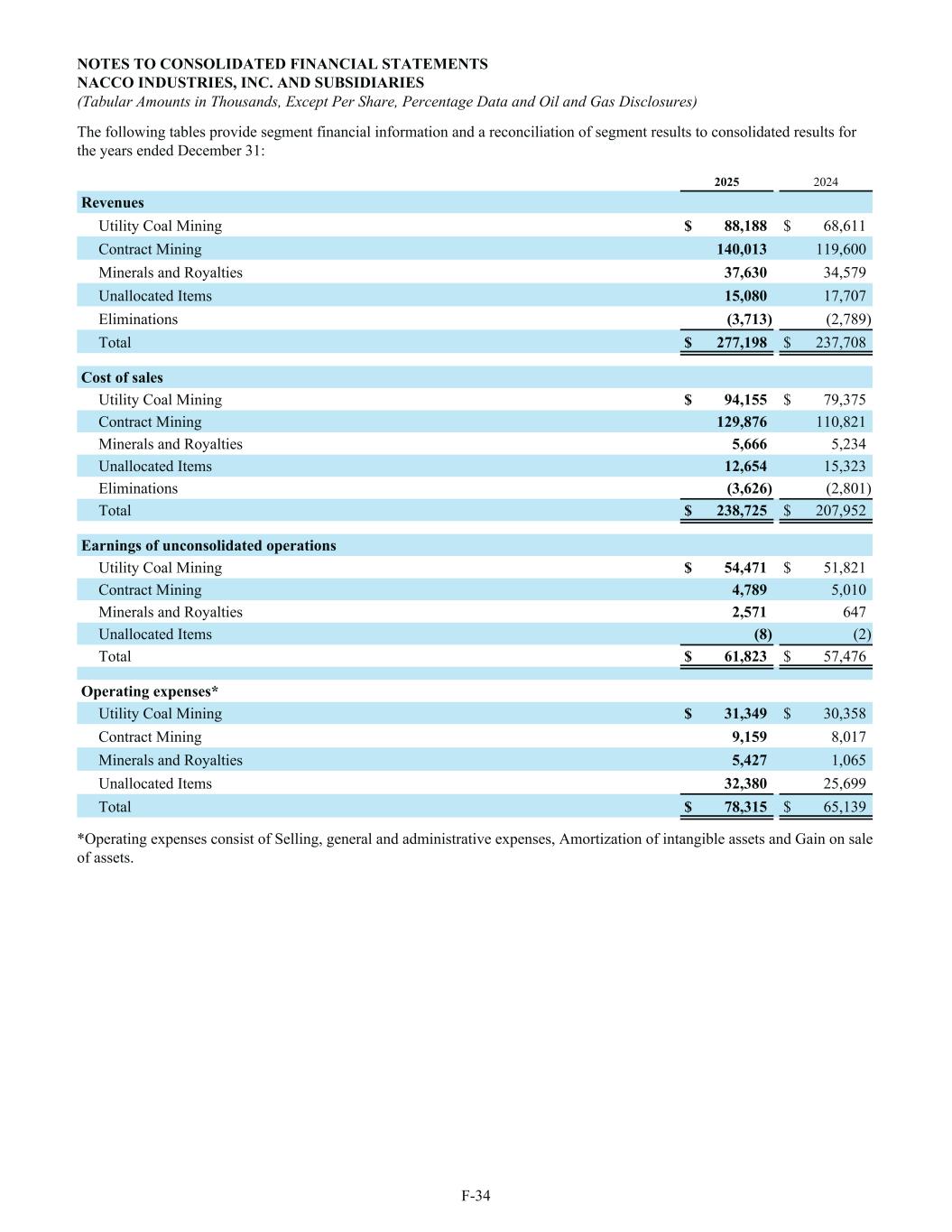 The following tables provide segment financial information and a reconciliation of segment results to consolidated results for the years ended December 31: 2025 2024 Revenues Utility Coal Mining $ 88,188 $ 68,611 Contract Mining 140,013 119,600 Minerals and Royalties 37,630 34,579 Unallocated Items 15,080 17,707 Eliminations (3,713) (2,789) Total $ 277,198 $ 237,708 Cost of sales Utility Coal Mining $ 94,155 $ 79,375 Contract Mining 129,876 110,821 Minerals and Royalties 5,666 5,234 Unallocated Items 12,654 15,323 Eliminations (3,626) (2,801) Total $ 238,725 $ 207,952 Earnings of unconsolidated operations Utility Coal Mining $ 54,471 $ 51,821 Contract Mining 4,789 5,010 Minerals and Royalties 2,571 647 Unallocated Items (8) (2) Total $ 61,823 $ 57,476 Operating expenses* Utility Coal Mining $ 31,349 $ 30,358 Contract Mining 9,159 8,017 Minerals and Royalties 5,427 1,065 Unallocated Items 32,380 25,699 Total $ 78,315 $ 65,139 *Operating expenses consist of Selling, general and administrative expenses, Amortization of intangible assets and Gain on sale of assets. NOTES TO CONSOLIDATED FINANCIAL STATEMENTS NACCO INDUSTRIES, INC. AND SUBSIDIARIES (Tabular Amounts in Thousands, Except Per Share, Percentage Data and Oil and Gas Disclosures) F-34