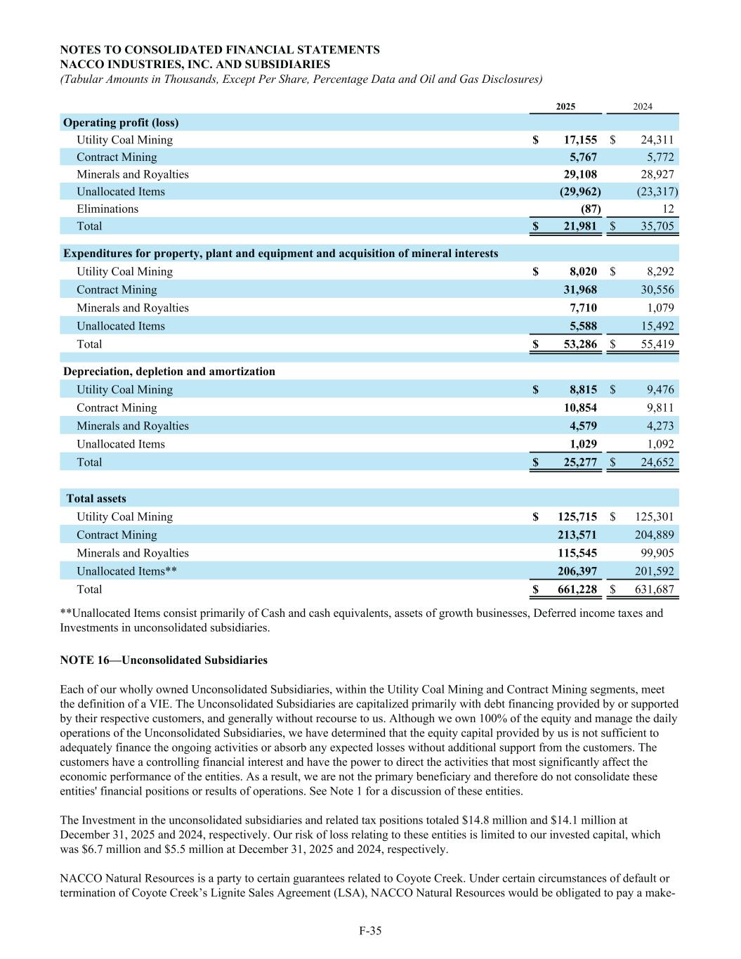 2025 2024 Operating profit (loss) Utility Coal Mining $ 17,155 $ 24,311 Contract Mining 5,767 5,772 Minerals and Royalties 29,108 28,927 Unallocated Items (29,962) (23,317) Eliminations (87) 12 Total $ 21,981 $ 35,705 Expenditures for property, plant and equipment and acquisition of mineral interests Utility Coal Mining $ 8,020 $ 8,292 Contract Mining 31,968 30,556 Minerals and Royalties 7,710 1,079 Unallocated Items 5,588 15,492 Total $ 53,286 $ 55,419 Depreciation, depletion and amortization Utility Coal Mining $ 8,815 $ 9,476 Contract Mining 10,854 9,811 Minerals and Royalties 4,579 4,273 Unallocated Items 1,029 1,092 Total $ 25,277 $ 24,652 Total assets Utility Coal Mining $ 125,715 $ 125,301 Contract Mining 213,571 204,889 Minerals and Royalties 115,545 99,905 Unallocated Items** 206,397 201,592 Total $ 661,228 $ 631,687 **Unallocated Items consist primarily of Cash and cash equivalents, assets of growth businesses, Deferred income taxes and Investments in unconsolidated subsidiaries. NOTE 16—Unconsolidated Subsidiaries Each of our wholly owned Unconsolidated Subsidiaries, within the Utility Coal Mining and Contract Mining segments, meet the definition of a VIE. The Unconsolidated Subsidiaries are capitalized primarily with debt financing provided by or supported by their respective customers, and generally without recourse to us. Although we own 100% of the equity and manage the daily operations of the Unconsolidated Subsidiaries, we have determined that the equity capital provided by us is not sufficient to adequately finance the ongoing activities or absorb any expected losses without additional support from the customers. The customers have a controlling financial interest and have the power to direct the activities that most significantly affect the economic performance of the entities. As a result, we are not the primary beneficiary and therefore do not consolidate these entities' financial positions or results of operations. See Note 1 for a discussion of these entities. The Investment in the unconsolidated subsidiaries and related tax positions totaled $14.8 million and $14.1 million at December 31, 2025 and 2024, respectively. Our risk of loss relating to these entities is limited to our invested capital, which was $6.7 million and $5.5 million at December 31, 2025 and 2024, respectively. NACCO Natural Resources is a party to certain guarantees related to Coyote Creek. Under certain circumstances of default or termination of Coyote Creek’s Lignite Sales Agreement (LSA), NACCO Natural Resources would be obligated to pay a make- NOTES TO CONSOLIDATED FINANCIAL STATEMENTS NACCO INDUSTRIES, INC. AND SUBSIDIARIES (Tabular Amounts in Thousands, Except Per Share, Percentage Data and Oil and Gas Disclosures) F-35